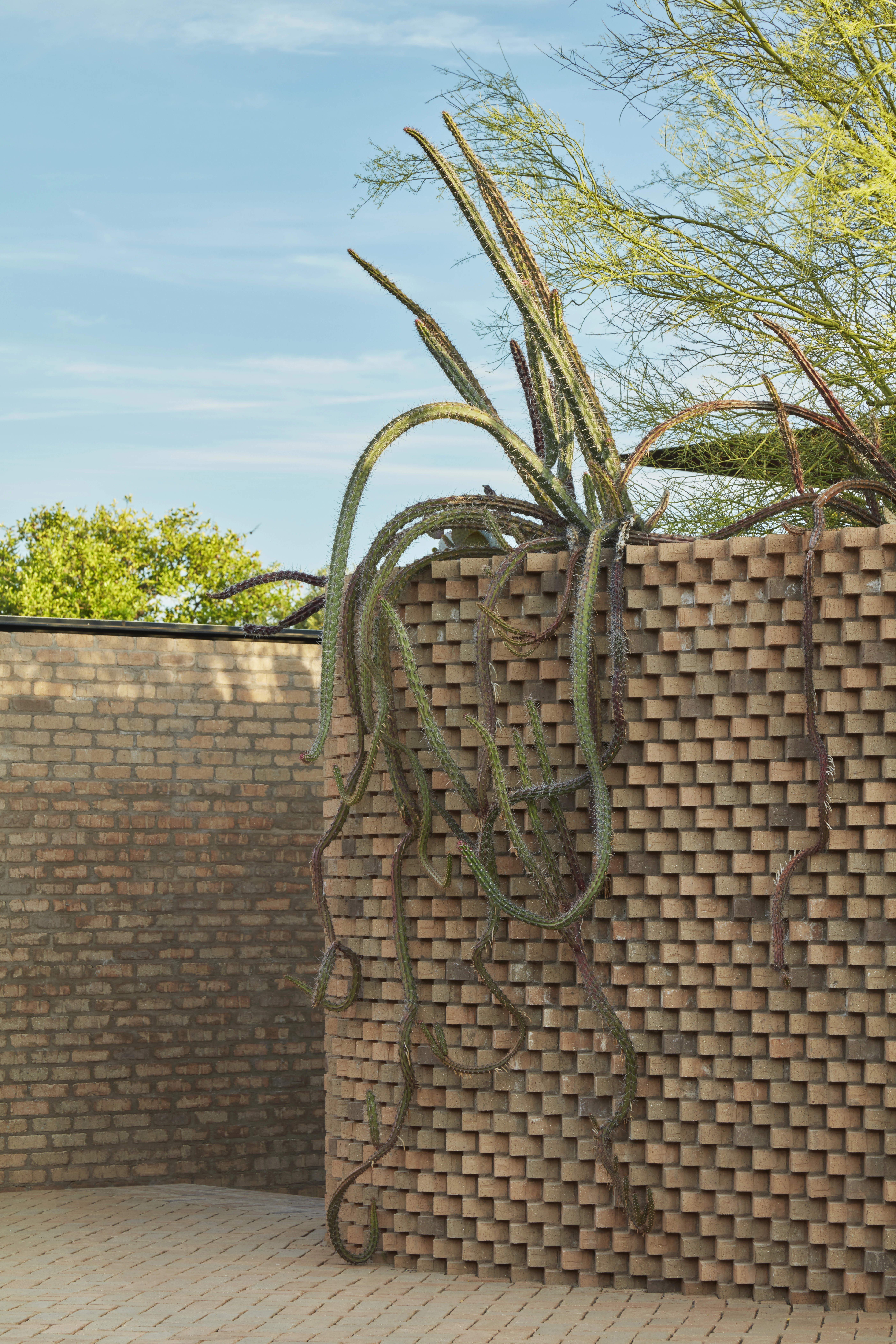 The entry sequence from Dragoon Lane begins through a rusted steel gate and screen wall, down a decomposed granite drive through a Palo Verde bosque. Salvaged from the site, a boulder outcropping sprinkled with prickly pear form a berm retaining soils at the driveway and screen the house. At the entry auto court permeable brick pavers allow for water infiltration. A large brick sculpted planter wall draped with Octopus Cacti Stenocereus alamosensis separates the entry courtyard and auto court.