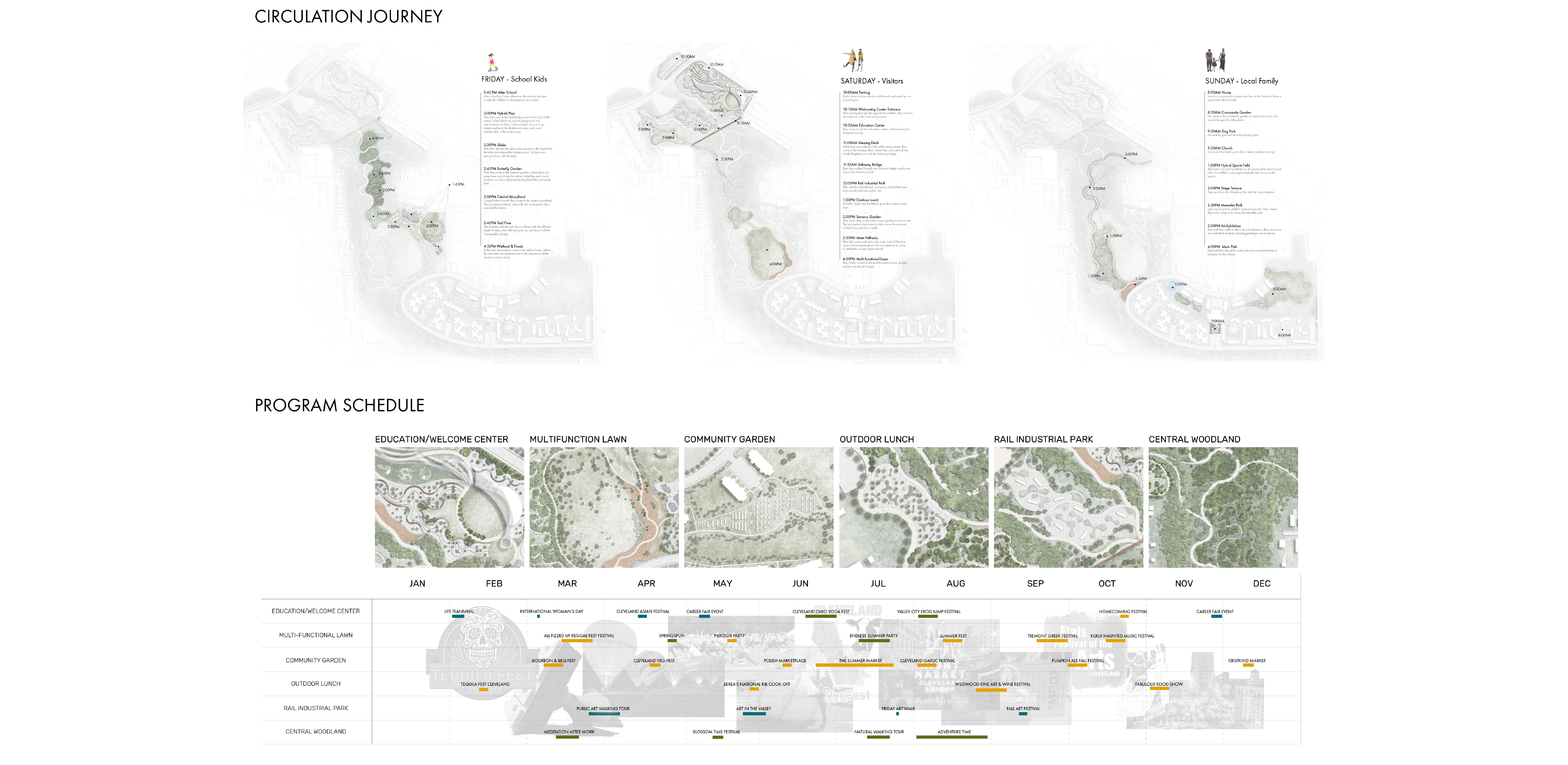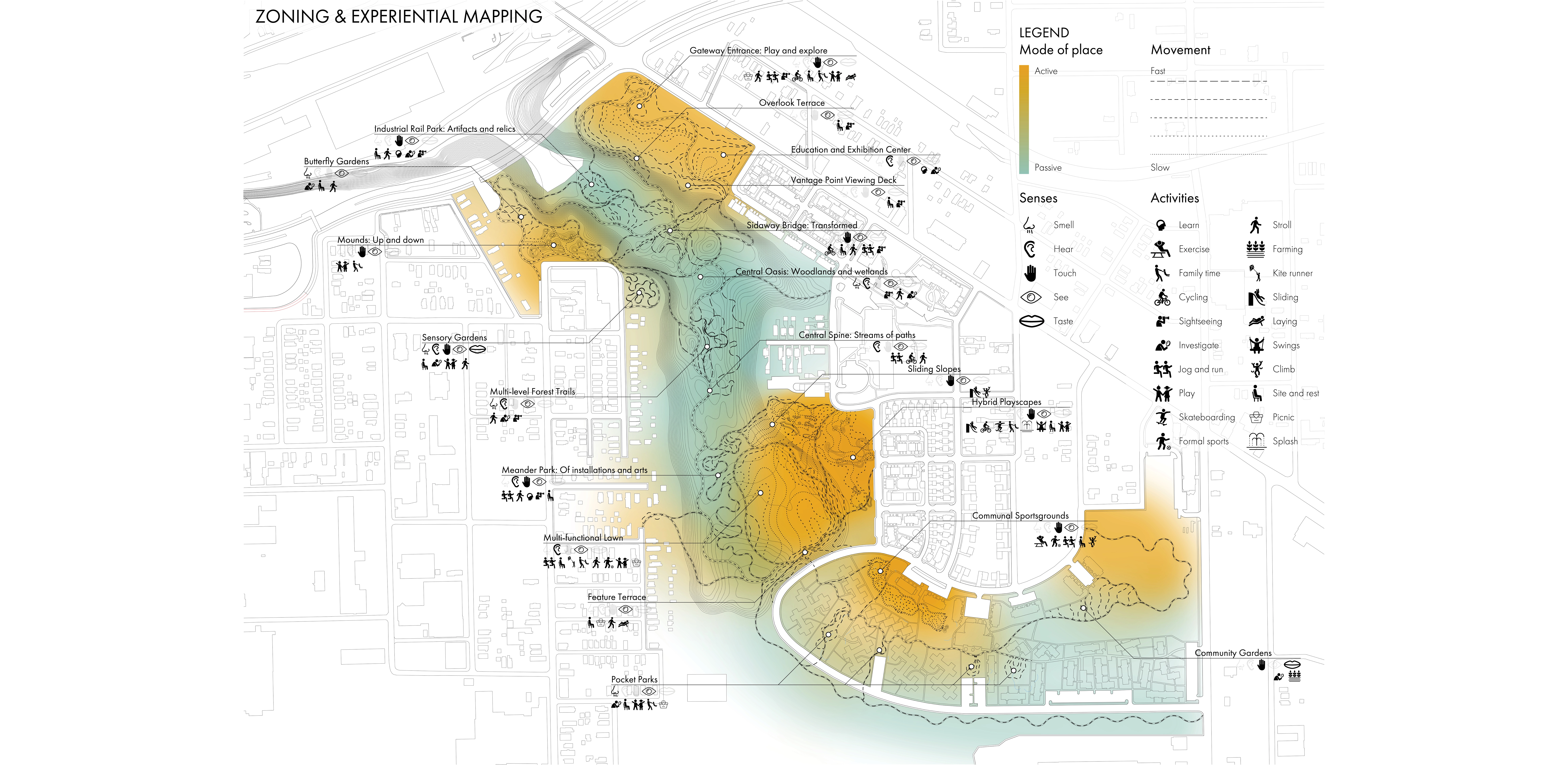 To address the complexities of site conditions, systems at play, and integration of stakeholders’ views, the concept began with the reinterpretation of Kingsbury Run the stream, the origin and beginning of the site. By reimagining the river flowing through the site, puncturing the site boundaries and permeating into the surrounding neighborhood, it proposes an impactful future that emphasis on possibilities. From a heavily contaminated stream (which was once natural), a problematic and underutilized site to the symbol of life and vitality of water, movement and fluidity, the design intends to link site specific and sensitive, dynamic programming through the different re-imagination of the Kingsbury Run waterway. The idea of meandering paths coursing through the site where local residents and other visitors alike can “flow” through, having different experience was key. It is about the many different journeys one can have through the site, it is about the various experiential qualities, adventures and it is about the empowerment of the local communities, building identities. The design responds sensitively to the development of the Opportunity Corridor and cycling networks through strong pathway connections with integration of programs that are closely relate to the surrounding contexts. From the industrial rail park that actively engages users with the site’s infrastructural background with soil treatment underneath; to central oasis of woodlands and wetlands created though topographic manipulations that creates a range of habitats as ecological hotspots that is also on another hand functions as natural filter for stormwater as well as multi-leveled trail systems; to the featured terrace and hybrid playscapes for all ages that provides opportunities across all four seasons, the design is multifunctional, highly performative and diverse in spatial experiential qualities. This is reflected in an unconventional zoning visualization that maps out gradual transitions in the mood of place, the velocity of movements, sensorial stimulations and potential activities.