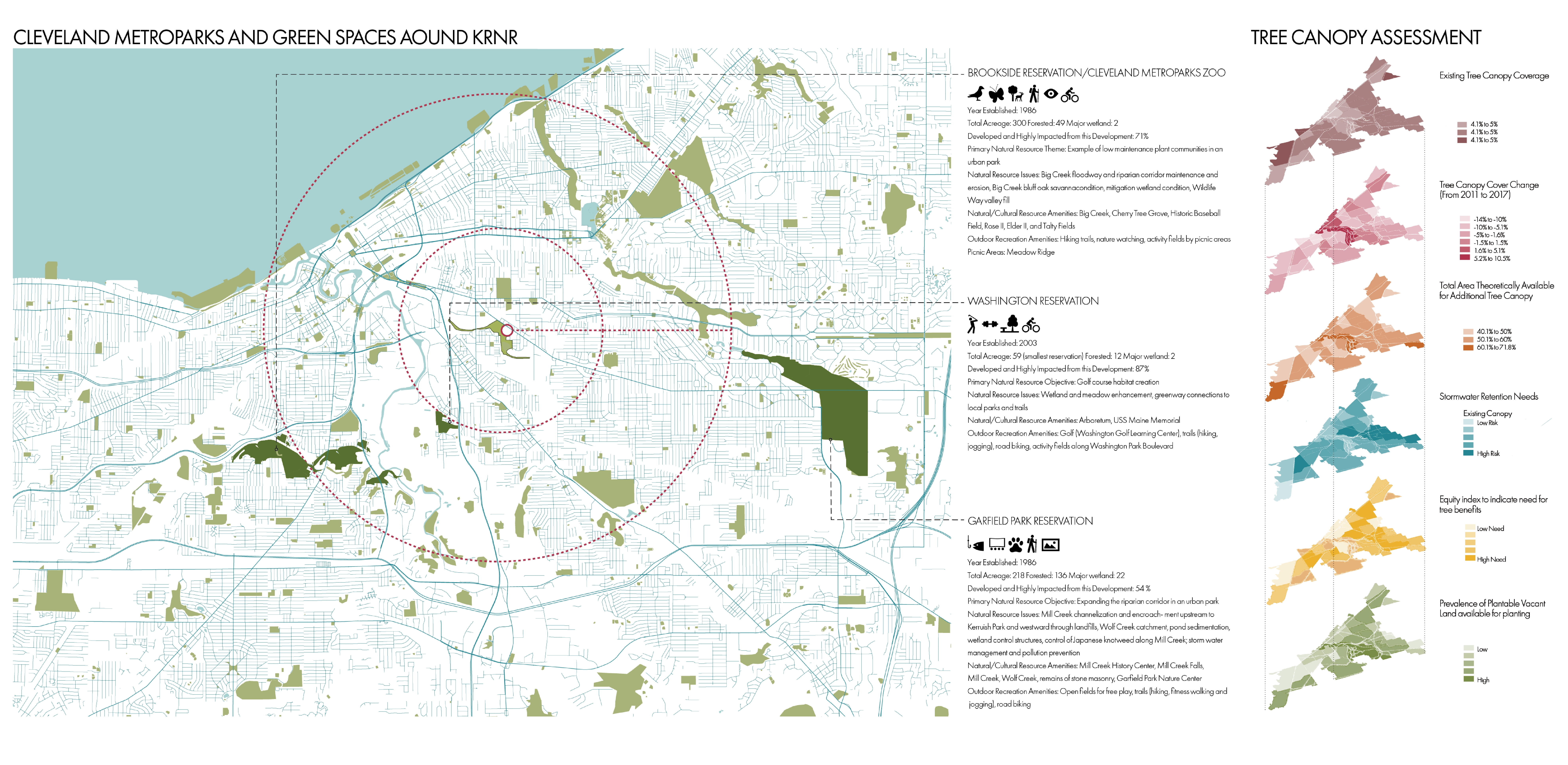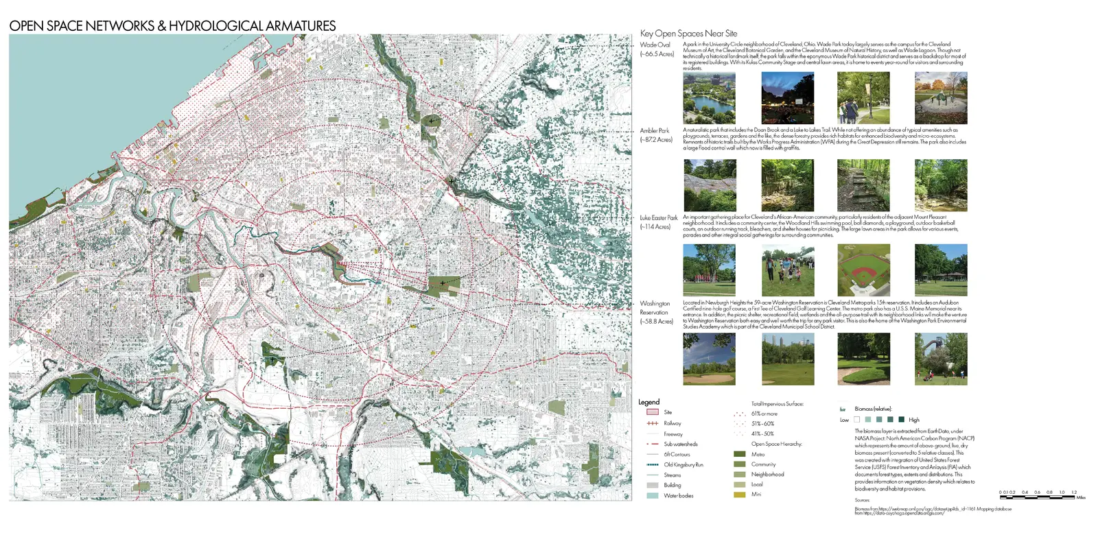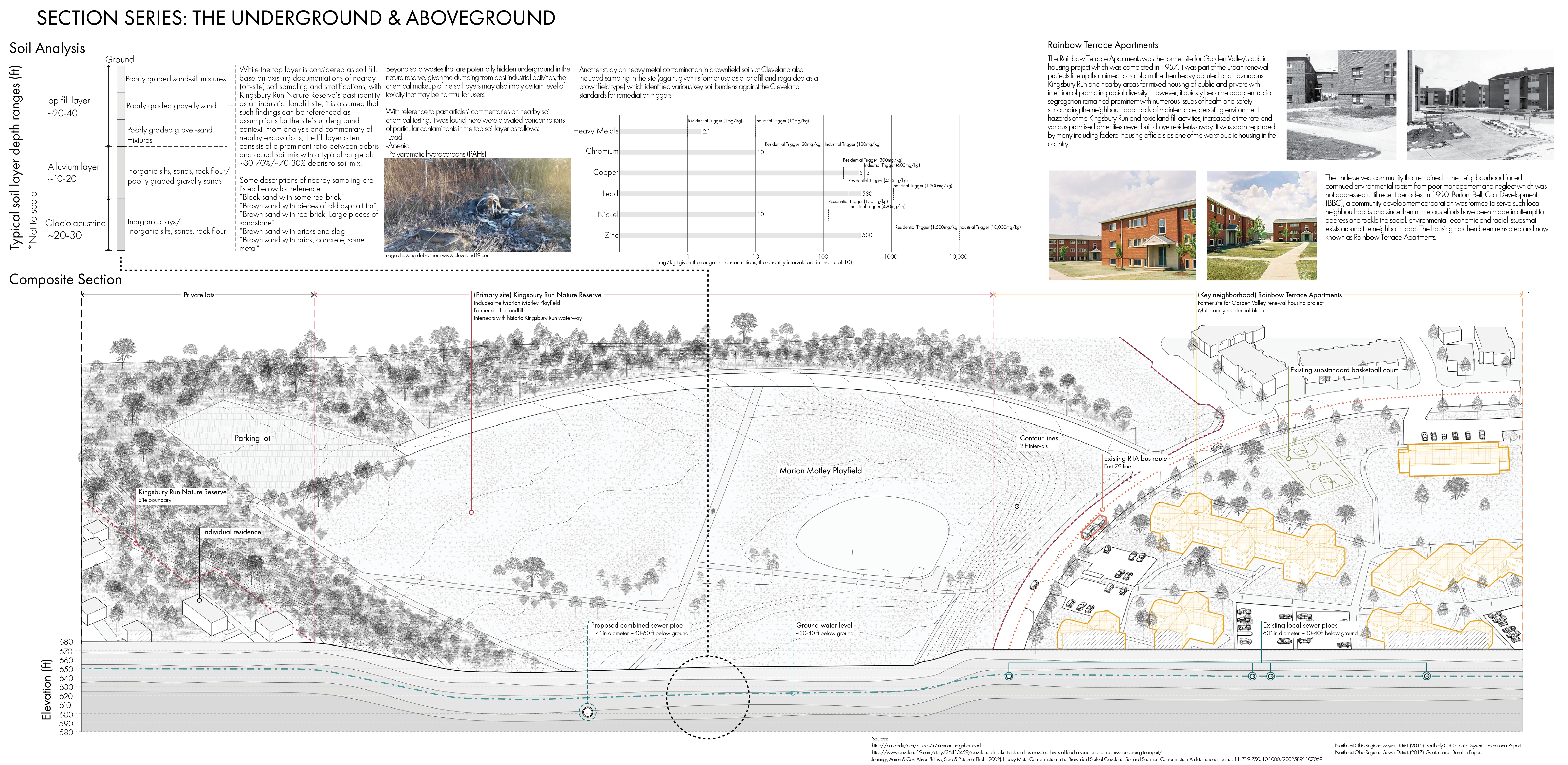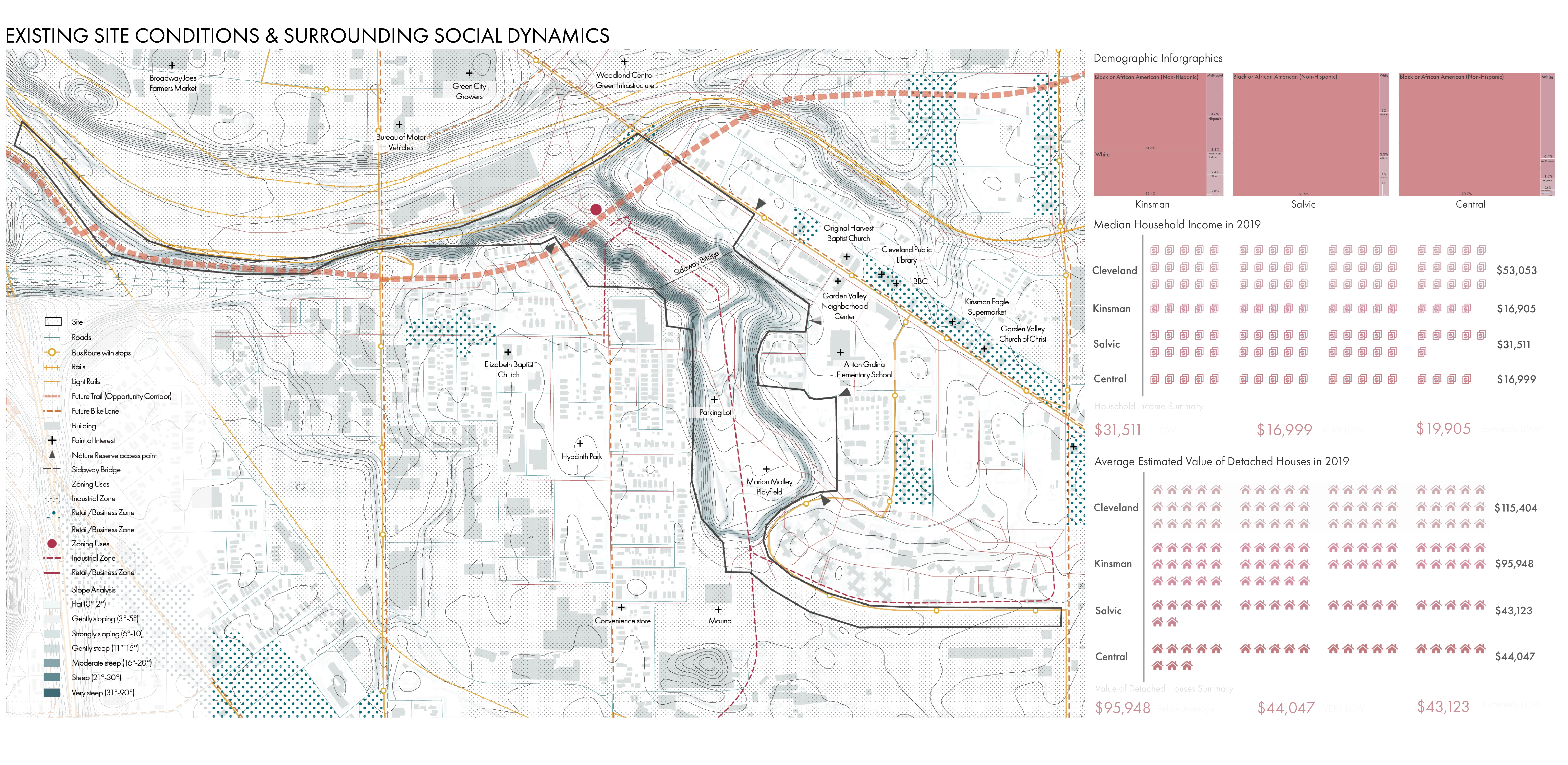 This project aims to provide a reimagination of the Kingsbury Run Nature Reserve for, with, and most importantly by the surrounding local communities that have been long under-served from a deeply embedded long history of environmental injustice. In collaboration with a non-profit community development corporation known as Burten, Bell, Carr Development Inc. (BBC), the project puts a heavy emphasis on analysis and planning exercises with inclusion of community engagement aspects that begins to visualize a bottom-up design approach bringing new possibilities for the local citizens. Through intensive and rigorous mapping, diagramming in a multiscale manner, the complex interplay of various systems, armatures are visualized to understand the contextuality of the site, its immediate region, but also opportunities to leverage as well as critical issues to address. Most importantly a continuous conversation with the partnering organization as well as numerous calls, meetings and presentations with other key stakeholders provided valuable insights and opinions that holds a significant place in the overall analytical and design processes of the project making it highly responsive, dynamic and multidimensional.