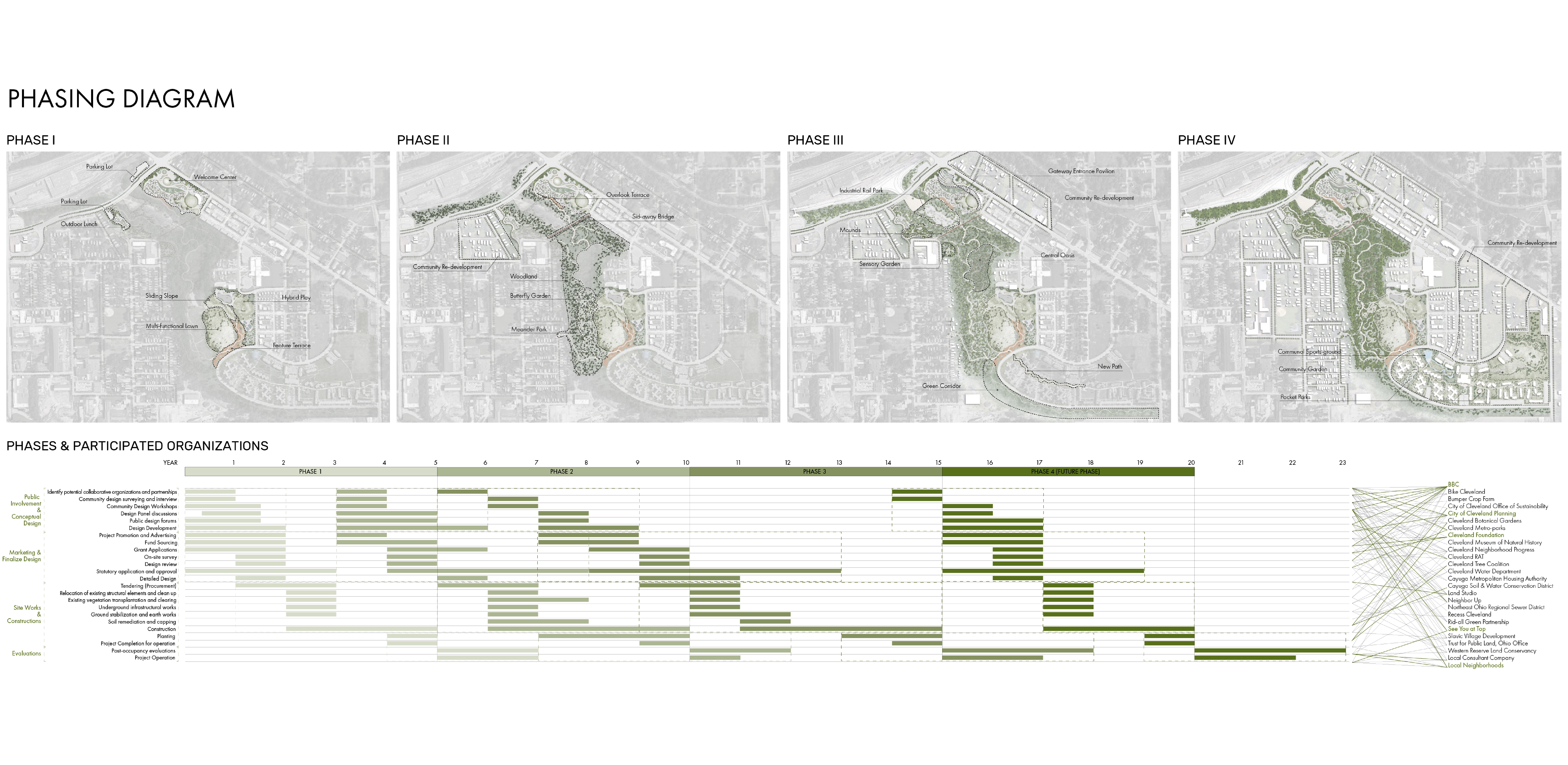 Finally, connecting to the stakeholders and the project’s potential in actualization, a detailed phasing diagram with program stages open for various organizations, local communities to partake in is made to further catalyst the discussion in Kingsbury Run Nature Reserve’s new futures.