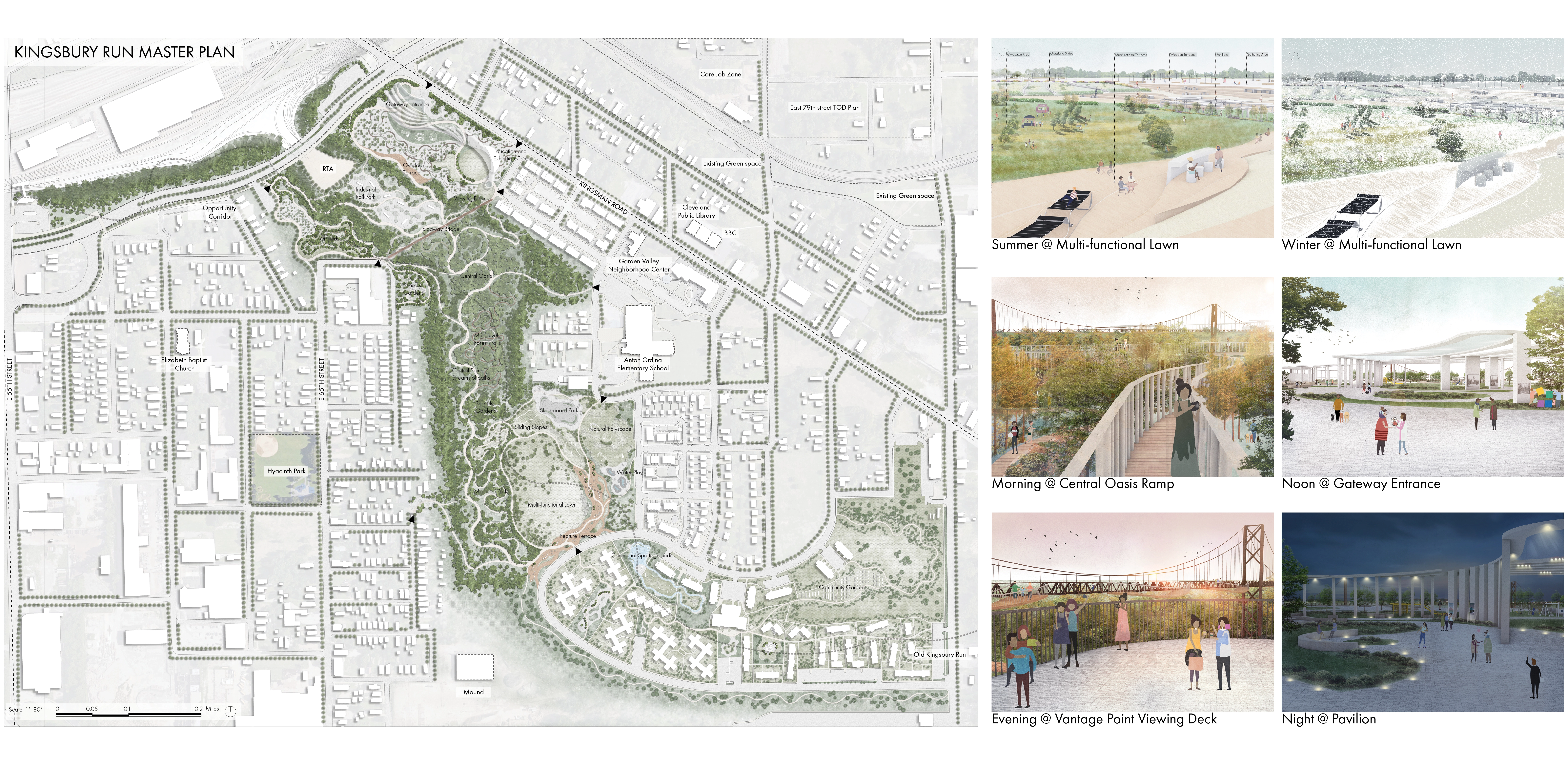 This plan creates the Kingsbury Nature Reserve in Cleveland, Ohio, in collaboration with surrounding disinvested communities. The project is comprehensive at all scales of analysis, maintaining rigor as they move through each of those scales, and we appreciated that the students did a thorough review of prior work done in the area. Their focus on sustainability and community was excellent—we particularly appreciate that they spoke directly with local stakeholders.
