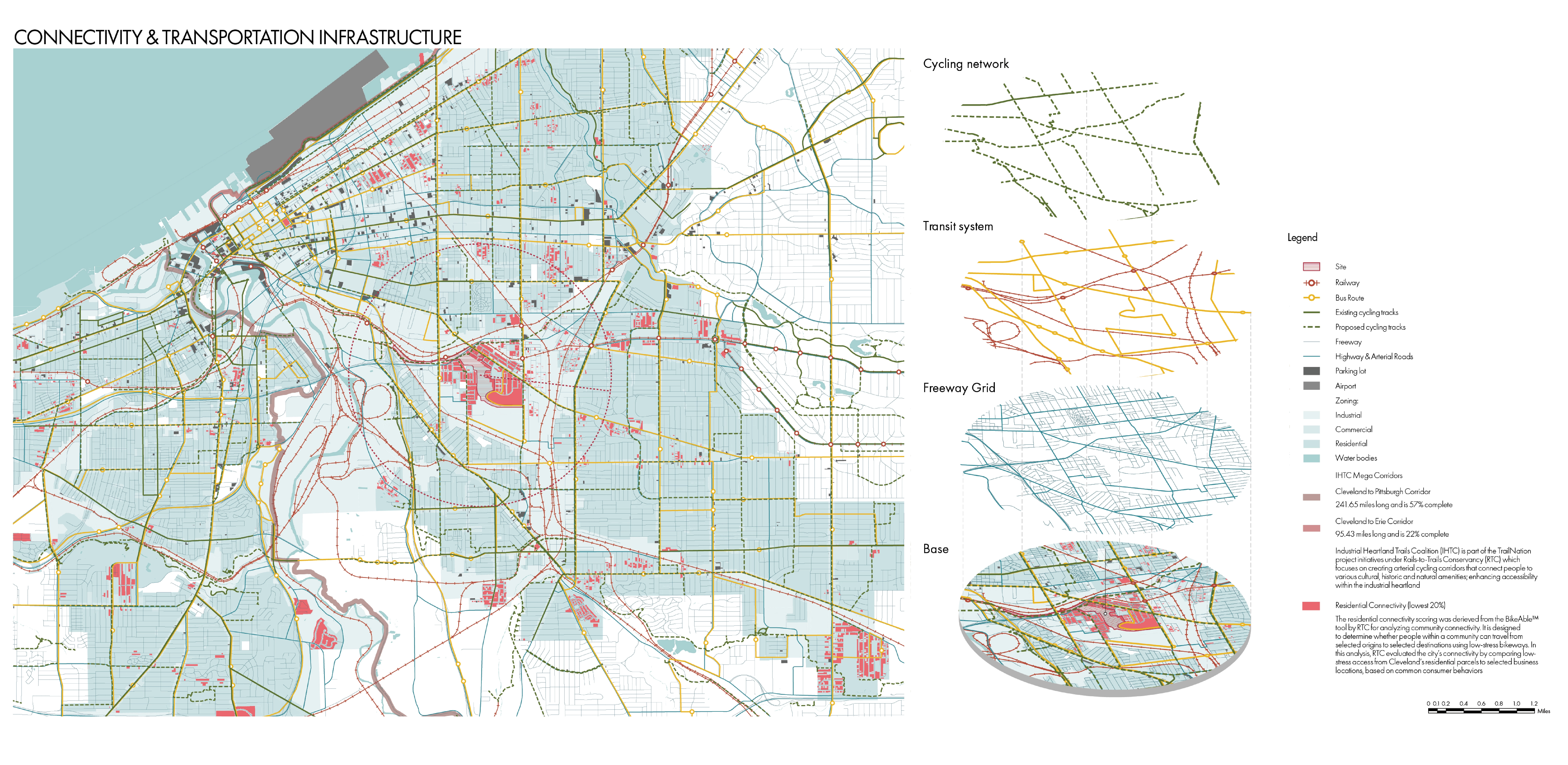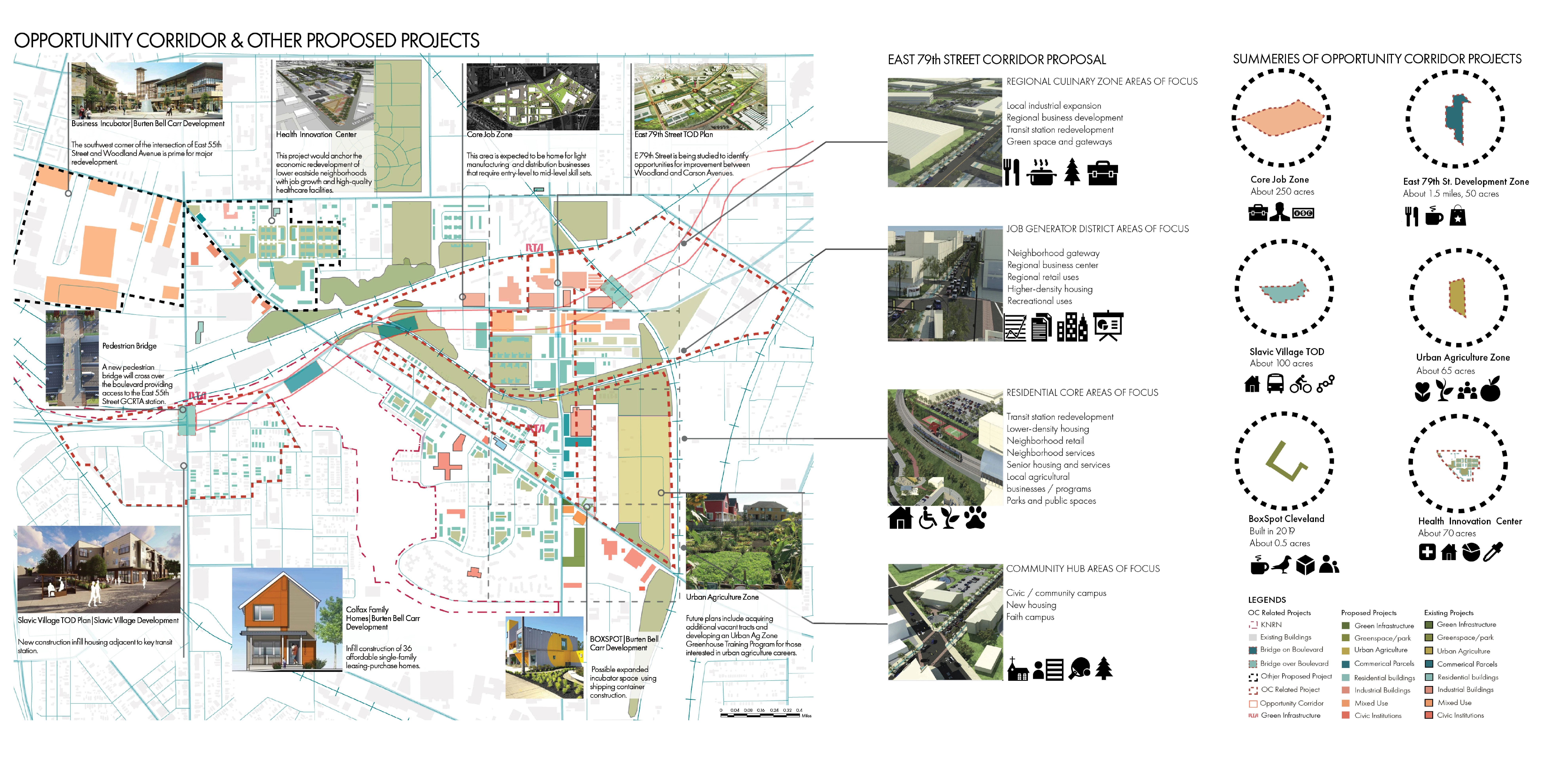 In an attempt to comprehensively integrate the design of the site into the larger surrounding conditions, under the impression that there are numerous significant projects, proposals scattered across the neighborhoods, (in particularity a major infrastructural development project i.e. the Opportunity Corridor), a diagrammatic summary of all relevant projects and proposals is created allow for a much more sensitive and inclusive design concept.