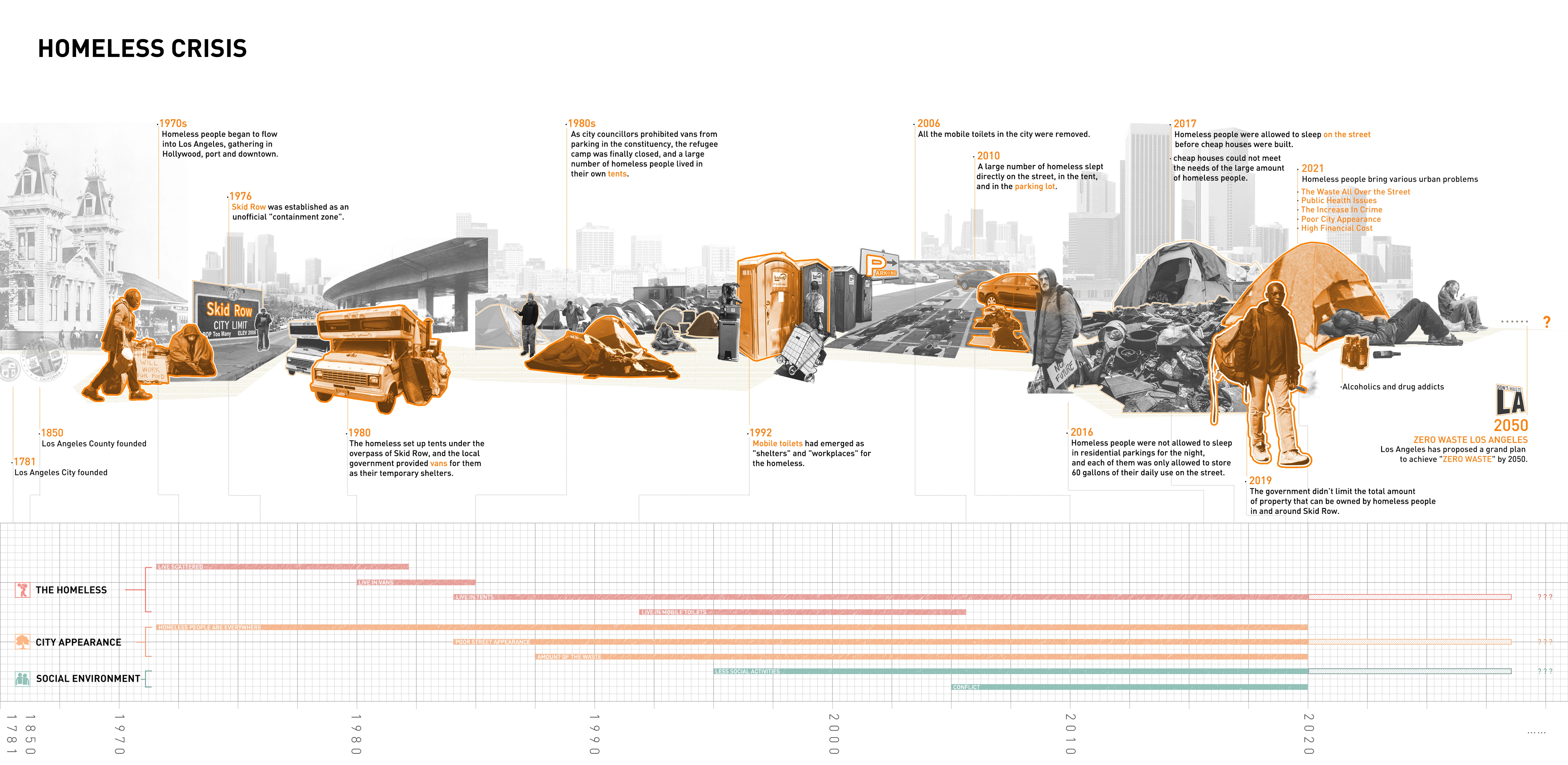 Starting in 1970, a large number of homeless people began to appear in Los Angeles. The number of the homeless has continued to grow significantly, reaching 36,300 in 2020, accounting for 61.5% of Los Angeles Counties' population. The city center Skid Row is one of the largest homeless gathering places in the United States. They set up tents in the streets and occupy a large number of free parking lots or other public spaces, which has seriously spoiled the cityscape and brought more crimes. Local government officials have been working hard to balance the homelessness issues with urban development needs. For example, the street sweeping operation started in February 1987; the Homeless Property Restriction Regulations in 2016, hoping to reduce the number of street homeless people; in 2017, a tax of $4.6 billion was levied to build houses (10,000 houses can be built within ten years), supporting the homeless; 'LIFT Act' provides up to $6,000 tax credits for low- income working families; May 2018 'Permanent Supporting Housing Regulations' took effect, shortening the time for homeless people to get housing. However, the various measures did not achieve the expected results, and even exacerbated the homeless' fearing of the governors, uncompromising of residence policy rules, and mistrusting of the government. Today's Skid Row is not only covered with tents, but also surrounded by waste, which causes more commuting, health, and security problems for local residents. Combined with the perennial heat and humidity of Los Angeles, the rapid growth of germs has become a major threat to the regional environment and public health, which further aggravating the conflicts between homeless people, residents and governments.