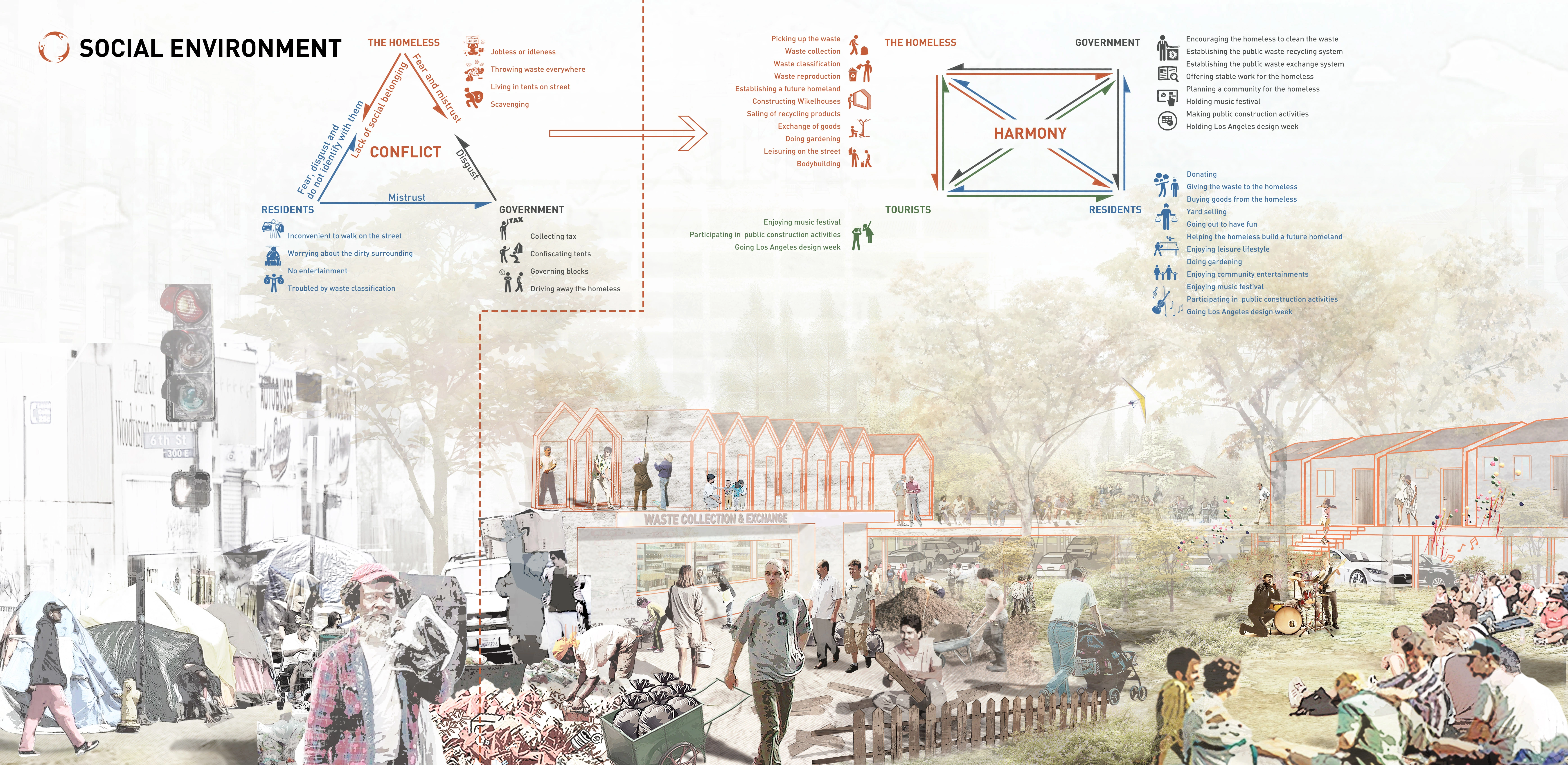 Responding to the problems of tents occupation and waste dumping, the project establishes on-site waste disposal and reuse mechanisms, and builds the future homeland, which will make joint effort to rehouse the waste and the homeless. Furthermore, it will provide homeless people with jobs. Los Angeles county is expected to achieve zero-waste by 2030. There will be no makeshift shelters on streets, and the homeless will have work to do, the crime rate will be reduced in the long run. The project will reshape a healthy, balanced and sustainable development for urban landscape and social relations sustainably.