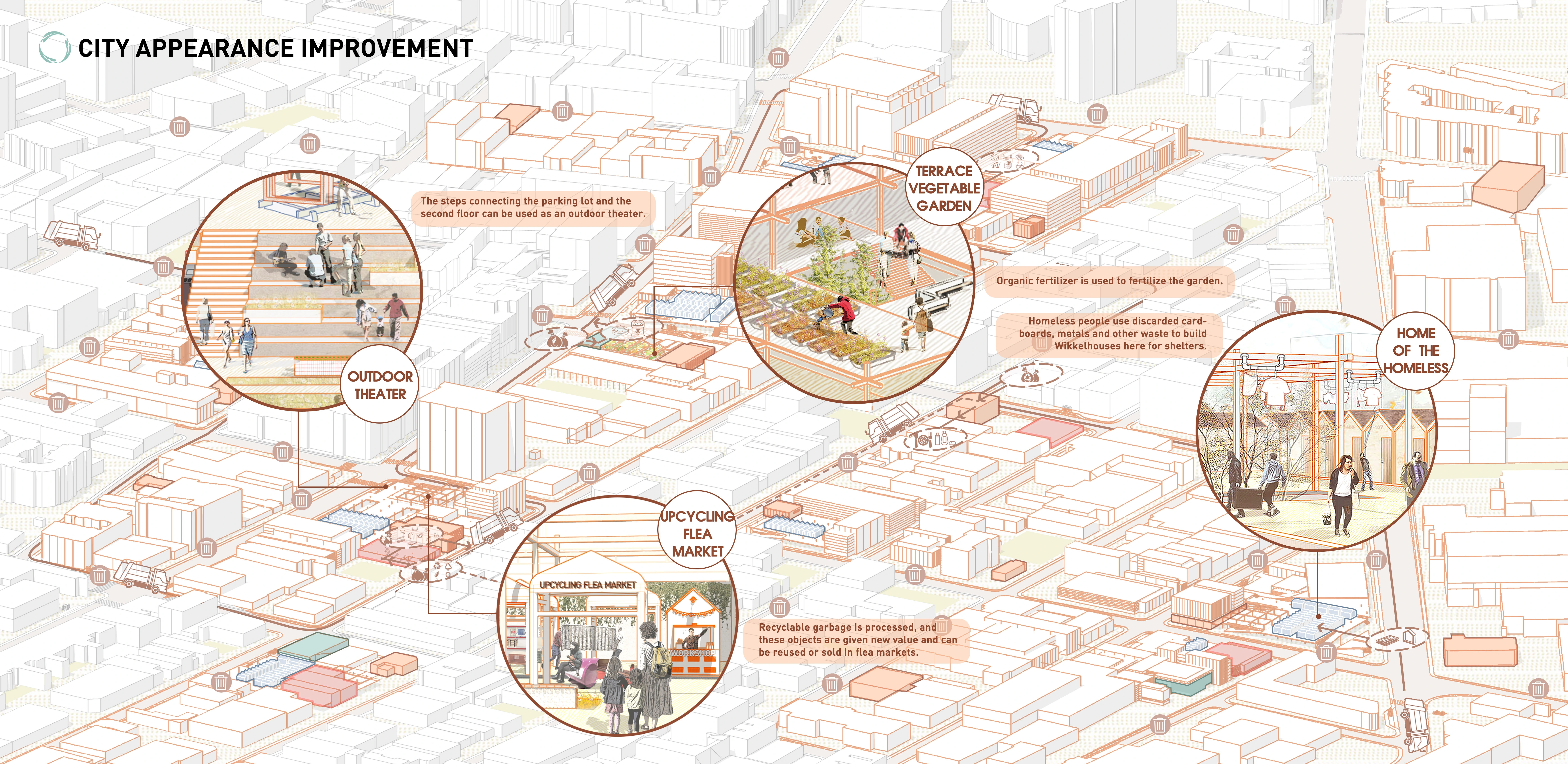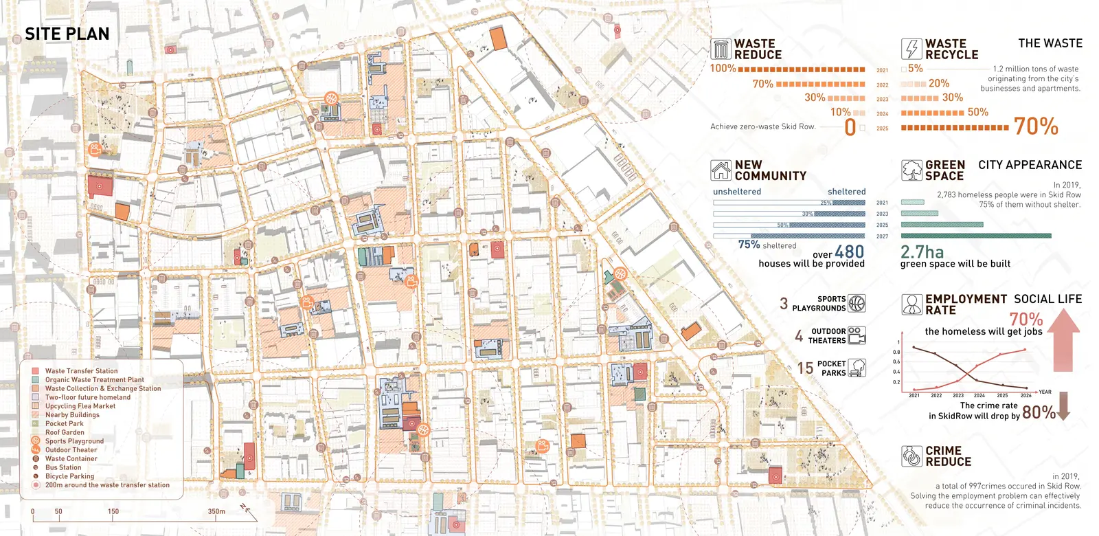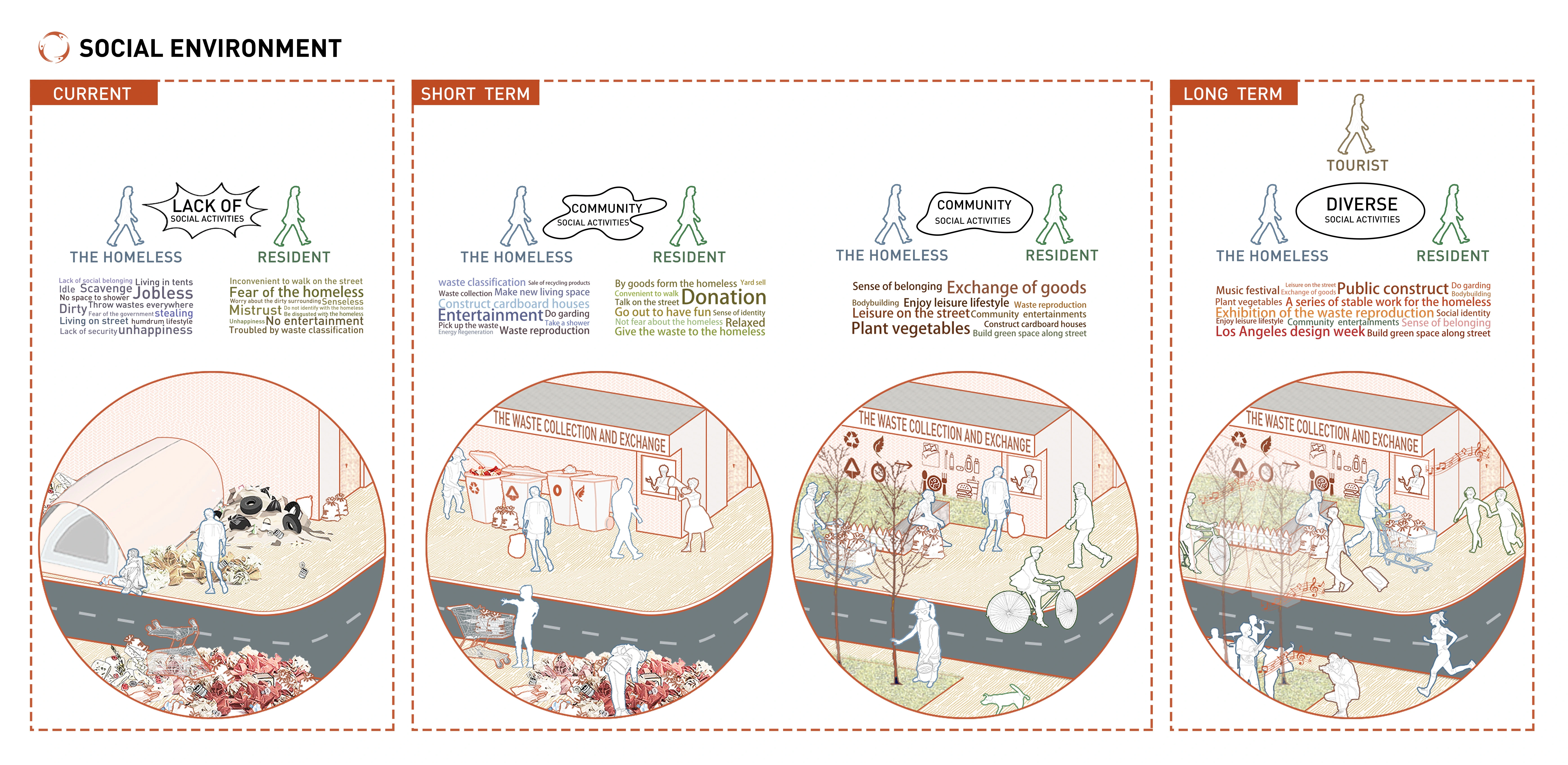69% of the homeless in Skid Row are 18-62 years old, most of them are mentally normal and have a certain ability to work. The main reason for their wandering is the lack of skills or ways to re-enter society and the difficulty of getting rid of poverty. It's obvious that the living environment of homeless people and the problem of street waste jointly limit the development of regional public health, environmental landscapes and social relations. The project believes that the response to the complex problems should be effective both in the near future and long-term. That is to establish on-site waste disposal and reuse mechanisms, improve city living condition and urban scape, offer a series of stable work for the homeless, thereby reshape a healthy, balanced and sustainable development for urban landscape and social relations.