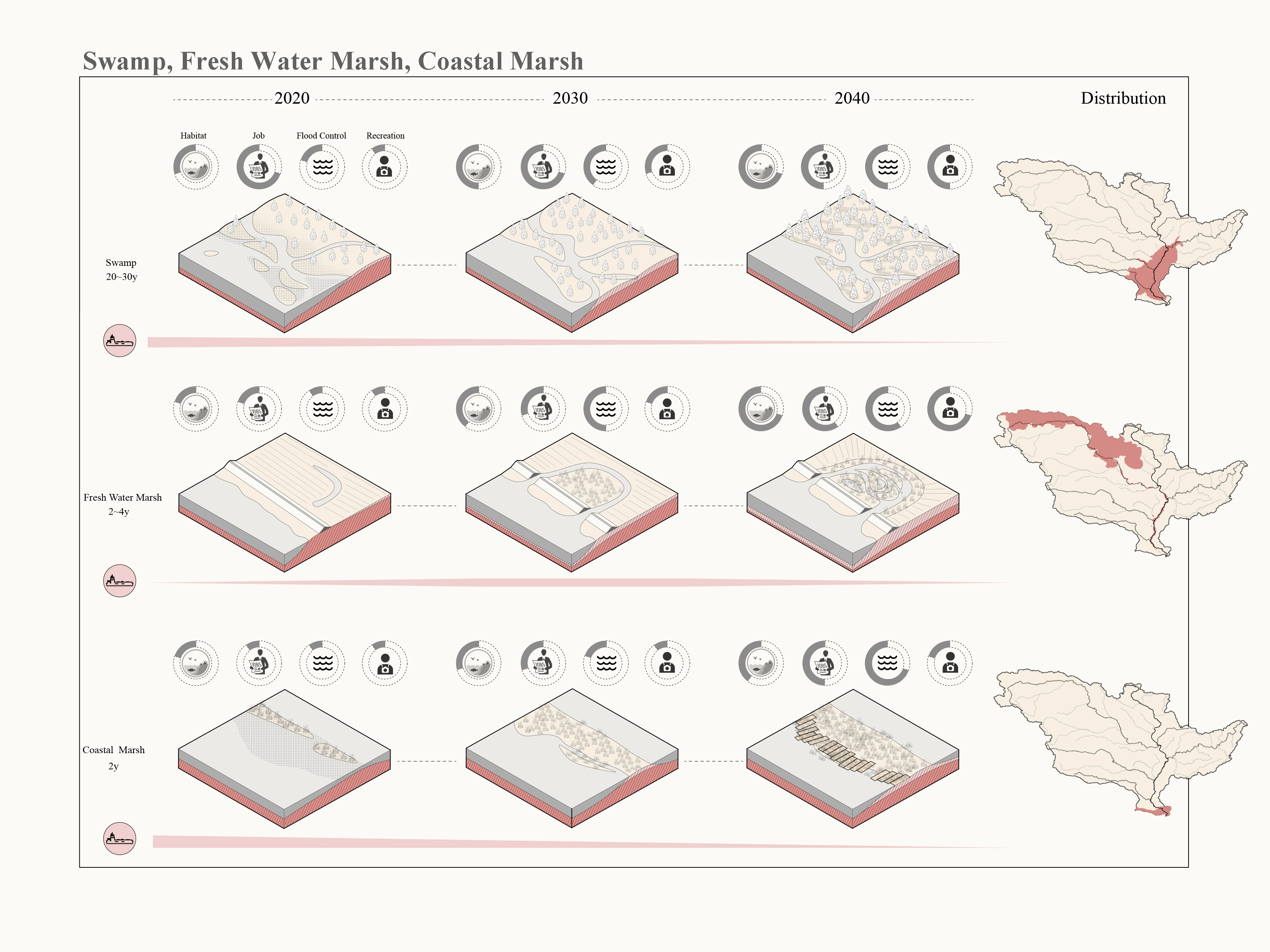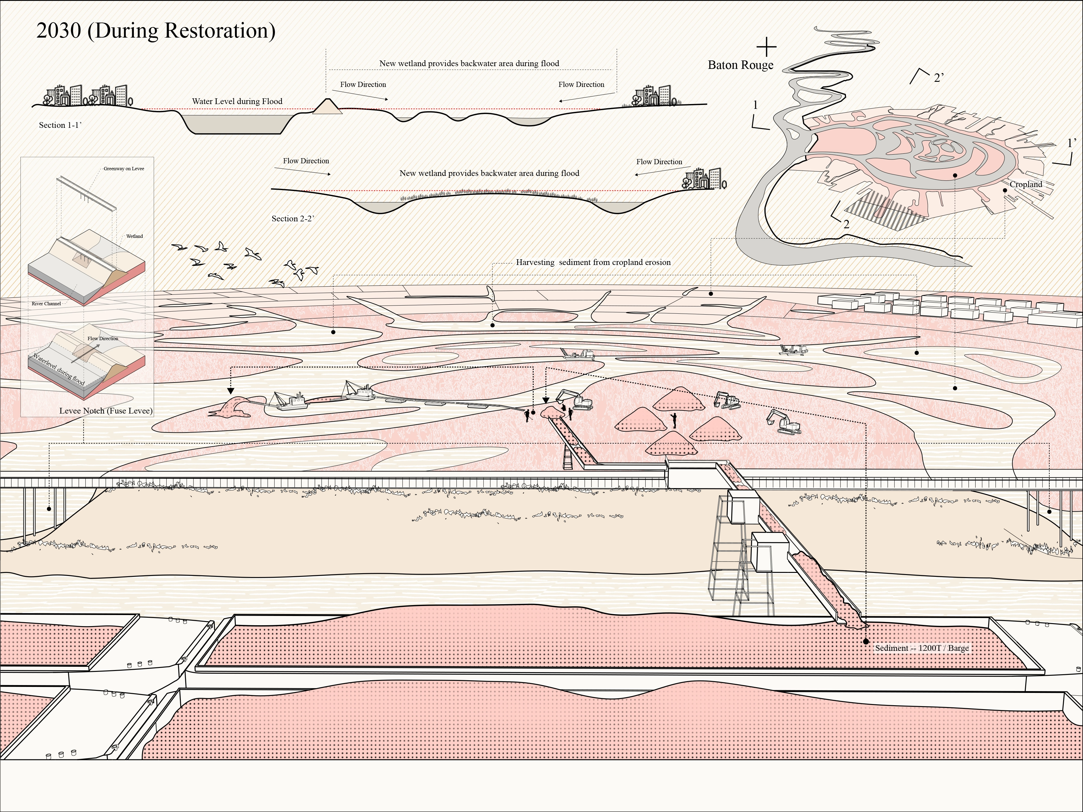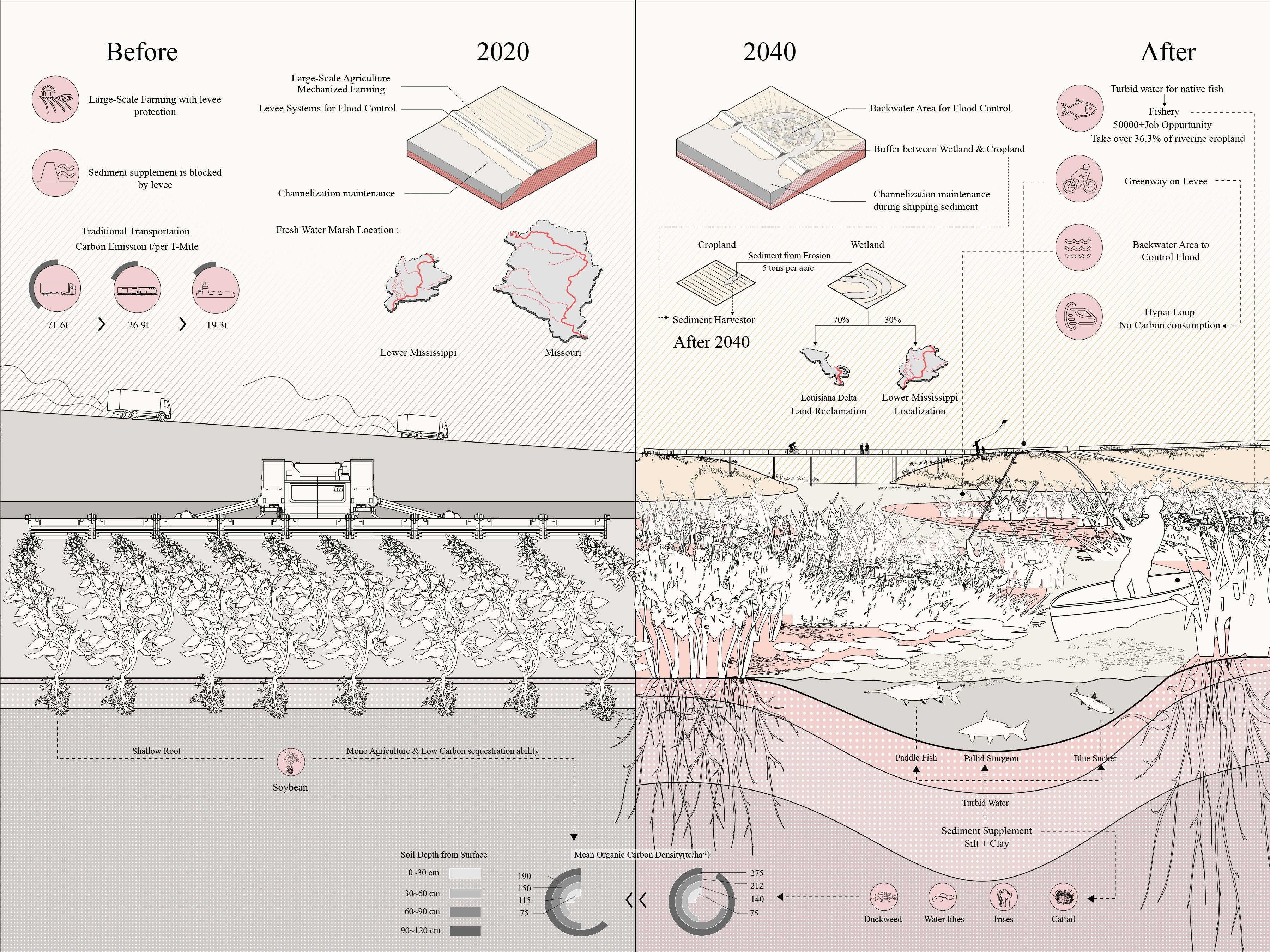 Climate change and economic inequality have deep influence on both social and ecological environments globally, especially in recent decades. Because of people’s endless exploitation of resources and land for the development of human society, anthropogenic disasters such as sea level rise, subsidence and flooding and storm surge cast huge shadows on riverine and coastal communities. Social inequality also shifts the harm of these environmental disasters onto people living in disenfranchised conditions. Now, it is the time to call for a more ecological and sustainable development mode for entire river basins. Besides the environmental importance proposed by this project, it is also a response to the call for new infrastructure plans for the United States, as a reasonable option to switch the old riverine development mode to an ecologically based new one. It not only proposes environmental beneficial, but also brings new job opportunities to local communities, which hopefully can help close the social inequality gap in the United States’ heartland.