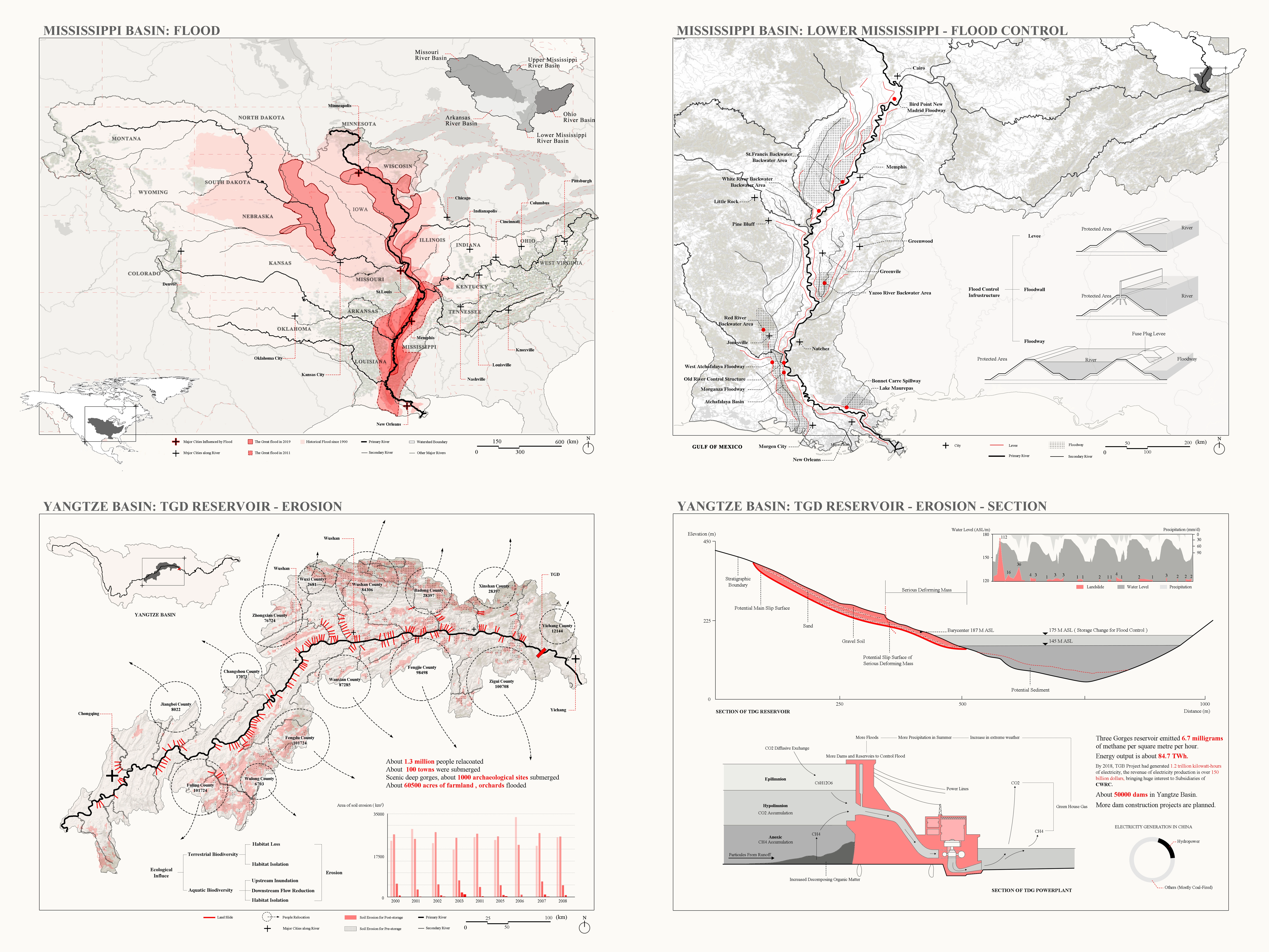 These locks, dams and levees negatively impact local and regional ecologies, and of course scale up to global scales economically. As such, this project not only analyzes the functions of locks, dams and the barge industry and their environmental influences on the Mississippi River Basin, it importantly analyzes comparative contexts globally, specifically the Yangtze River Basin. The Yangtze is also a highly-engineered system, and suffers from similar frequent and damaging flood issues as the Mississippi. In order to better understand how the ship locks and dams work and how they influence the ecological environment in the Mississippi River Basin, as well as in other river basins in the world, this project speculates a cooperation with the US Army Corps of Engineers (USACE) for new research and monitoring of locks and dams in the Mississippi River Basin, as well as the Changjiang Water Resources Commission (CWRC) for research on floods and dams on the Yangtze River Basin. After research and analysis, a similarity of problems affect locks, dams and levees in both the Mississippi and Yangtze River Basins, more particularly river bank erosion and trapped sediment behind dams. The proposal on the Mississippi river could be an example for those suffering from the same issues in the world.