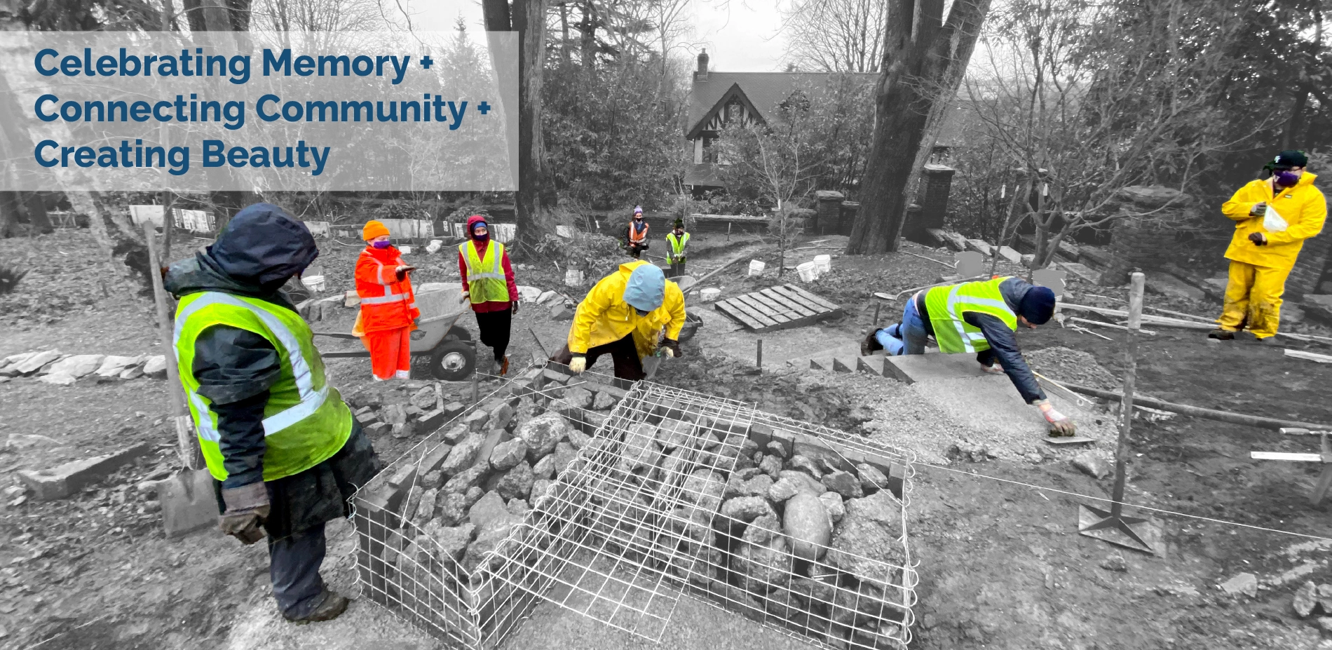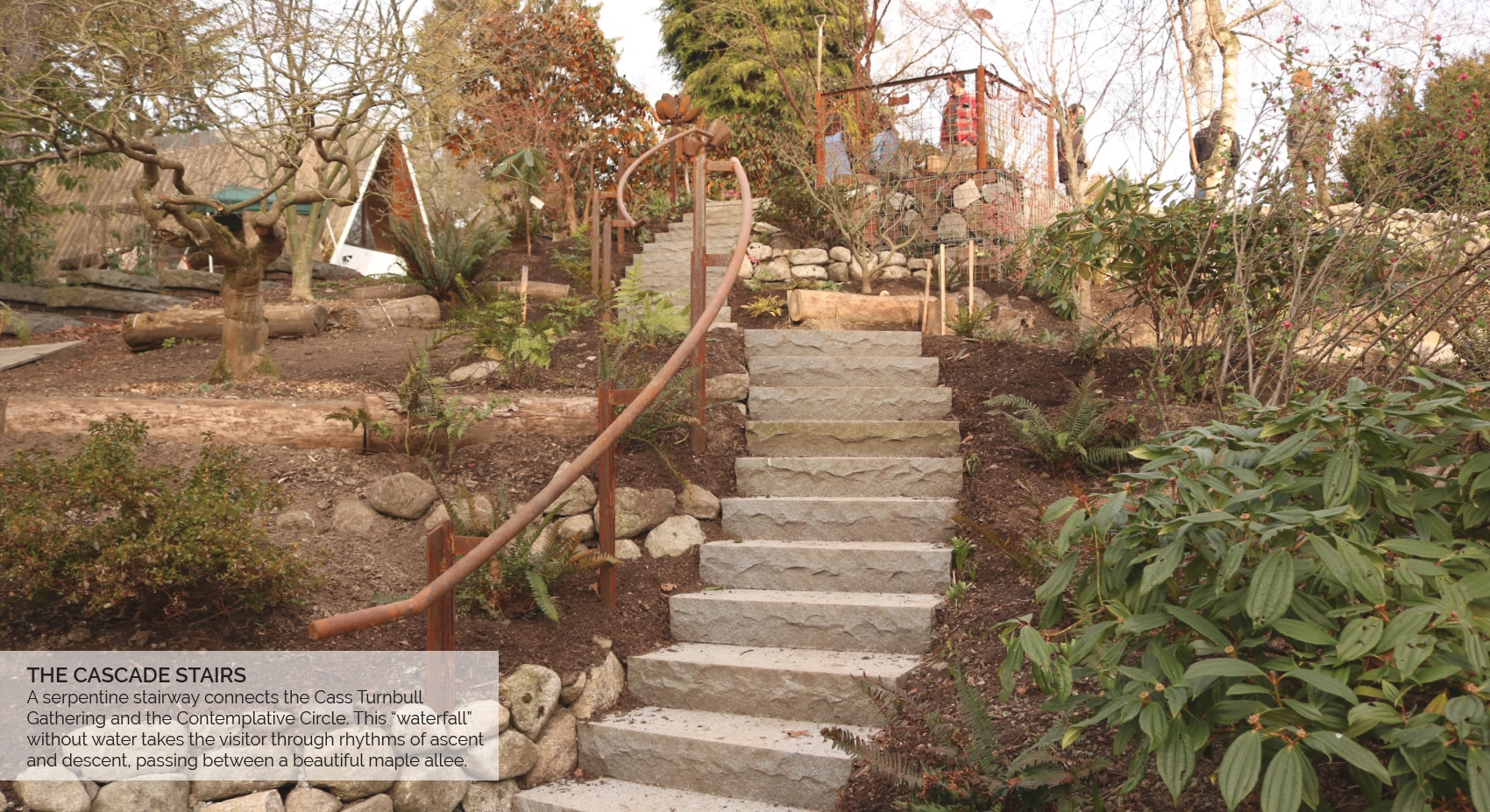 Another project goal was to create a robust and verdant garden space that follows proper horticultural practices. The site will function as a demonstration garden and learning laboratory for Plant Amnesty who will provide community workshops and classes to the public. This once formal garden had fallen into neglect and had since been overtaken by many invasive and ruderal species like Himalayan Blackberry and English Ivy. Plant Amnesty, a community volunteer organization cleared the site and asked if our exploratory building program would partner with them and the Seattle Parks and Recreation Department to develop the garden. An initial master plan was created by students at Edmonds Community College and this plan was refined by our program and the project implemented in the winter of 2021. To increase biological diversity, learning opportunities and seasonal variety in each gathering area are associated with a specific planting typology. The Kay Bullitt space is defined by a sensory garden that features aromatic and pollinator plants, and grasses that respond to the wind, offering a calming, restorative benefit for the local community. The Cass Turnbull space is planted with large salvaged rhododendrons and underplanted with hellebores, ferns, carpets of snowdrops, and Solomon Seal. These were some of Cass’s favorite plants and express her love of perennials and plants typically found in Northwest gardens. A connecting stairway links the upper Turnbull gathering area to a contemplative space below. The alignment of the stone treads elegantly curves between an assortment of mature, salvaged Japanese maples amidst a carpet of ferns and other ground covers that thrive in dappled shade. The third space, the contemplative room, is designed for solitary repose and reflection, as memories of those who have passed are observed and both grief and reflection supported. This space is flanked with columnar Italian yews, aromatic vines, and woodland shrubs, that create a feeling of fertility, enclosure, refuge, and rebirth. This garden, full of textural and visual interest, complements the learning objectives of Plant Amnesty to provide a deeper environmental understanding and a place where future students can practice proper pruning and horticultural practices, understand the principles of good plant stewardship, appreciate the site’s embedded history and pay homage to Cass and Kay.