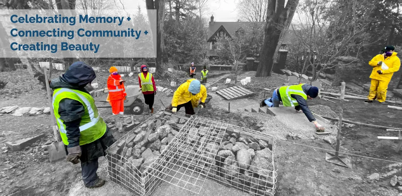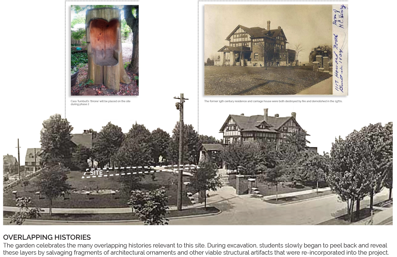 Project Implementation: This project implementation utilized an exploratory building studio course in partnership with Plant Amnesty volunteers. The project was designed to incorporate materials salvaged including recycled bricks, concrete rubble, stone sets, donated old garden tools and granite wall caps, and architectural “shards” extracted from the site. Students designed the seating, walls, stairs, pathways, and plantings on the site, refining in the field using the exploratory process and mocking up the designs with the materials on site. With such a varied array of site features, each student was able to experience a myriad of contemporary construction techniques such as welding, steel fabrication, stone setting, concrete forming and finishing, carpentry, and plant installation. Most of the students had little or no construction experience before the start of the project. Local equipment operators donated time and equipment for excavation, but 95% of the work was done by the students by hand.