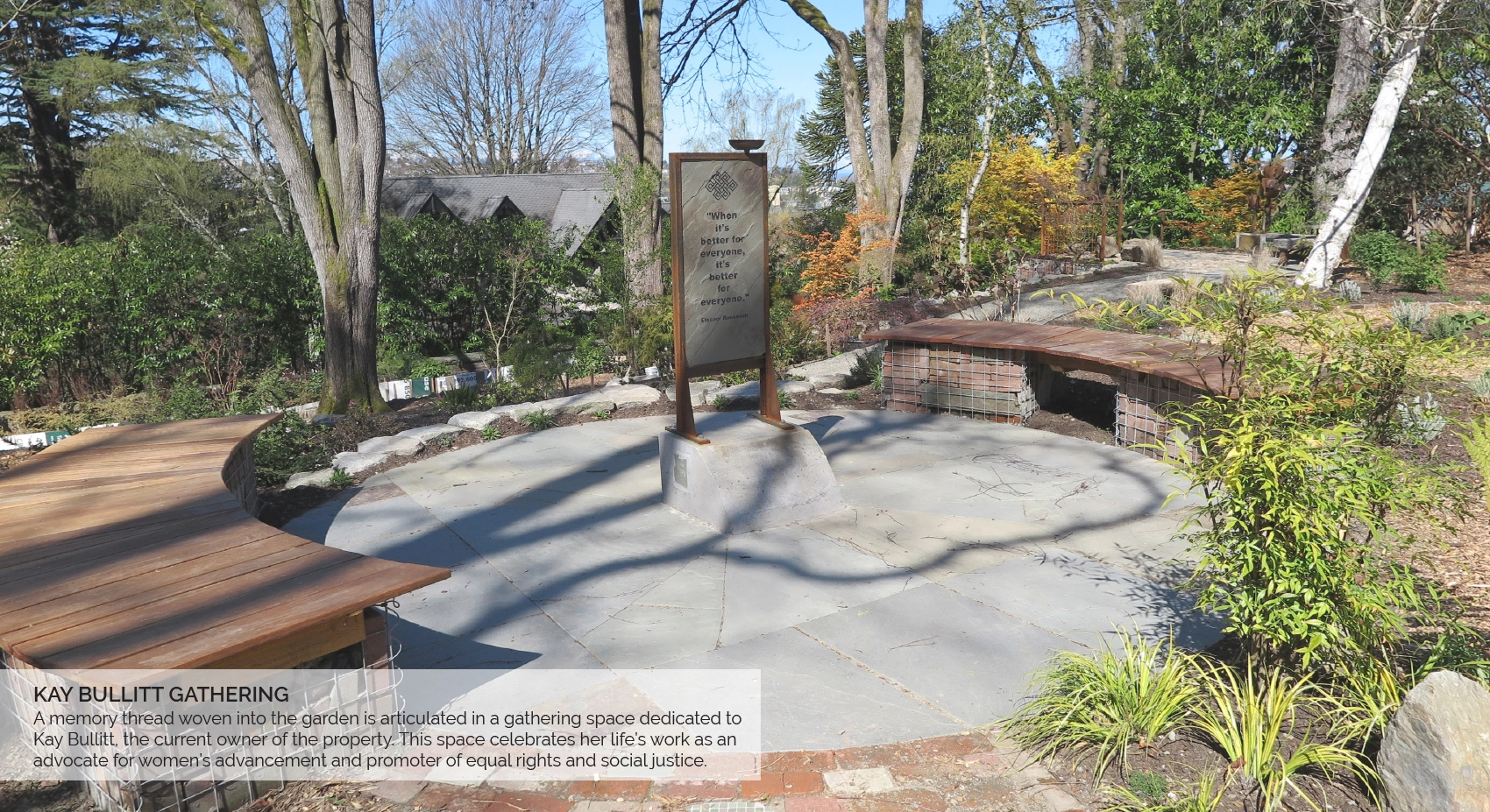 Memorialization is also a significant goal and the garden is, in part conceived as a memorial to Cass Turnbull, founder, and director of Plant Amnesty, a local non-profit horticultural education and advocacy organization. Turnbull, a former Parks and Recreation employee, devoted her life to teaching clients, city officials, and the public about the importance of preserving and fostering the health of urban tree canopy through proper pruning and maintenance techniques. After passing away three years ago, we worked with Plant Amnesty on a garden space that would celebrate her and her lasting influence on Seattle’s landscape architecture and horticultural communities. The first of three gathering areas within the garden is dedicated to her and intentionally designed to reflect her quirky sensibility and personality. One such element is a flower-like sculpture crafted from defunct gardening tools from a bygone era. These leftover tools also serve as distinctive decorative elements to the nearby guard rail that frames the overlook in this section of the garden while also expressing her love of gardening. A third memory thread woven into the garden is articulated in another gathering space dedicated to Kay Bullitt, the current owner of the property. This space celebrates her life’s work as an advocate for women’s advancement and promoter of equal rights and social justice. The semi-circular gabion benches, reminiscent of gathering places of exchange found in Quaker meeting houses, direct the user’s focus onto a central stone feature with carved quotes from Elenore Roosevelt and Professor Cornel West expressing Kay’s values and life goals.