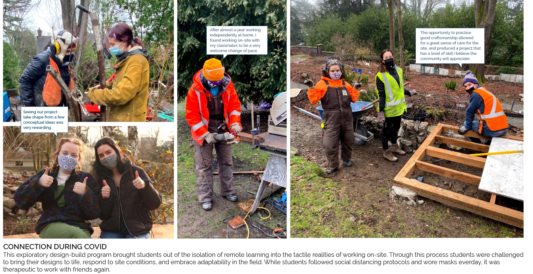 Behind a nondescript brick wall, an overgrown residential lot is transformed into a verdant public garden celebrating the life and work of local activists Cass Turnbull and Kay Bullitt, champions of the diverse lives of plants and people. Over 10 weeks, this exploratory design-build program brought students out of the isolation of remote learning into the tactile realities of working on-site. Through this process students were challenged to bring their designs to life, respond to site conditions, and embrace adaptability in the field. By emphasizing the reuse of materials and plants, both found and donated, students were able to create unique site features such as rock walls, seating areas, and staircases that together reflect a focus on craft and an expressionist approach to the site. The garden acts not only as a refuge for contemplation in the city but also as a living laboratory for Plant Amnesty, a local volunteer-run non-profit. Together, this focus on stewardship, ecology, sustainability and growth offers a setting for plants and the people who care for them to both thrive.