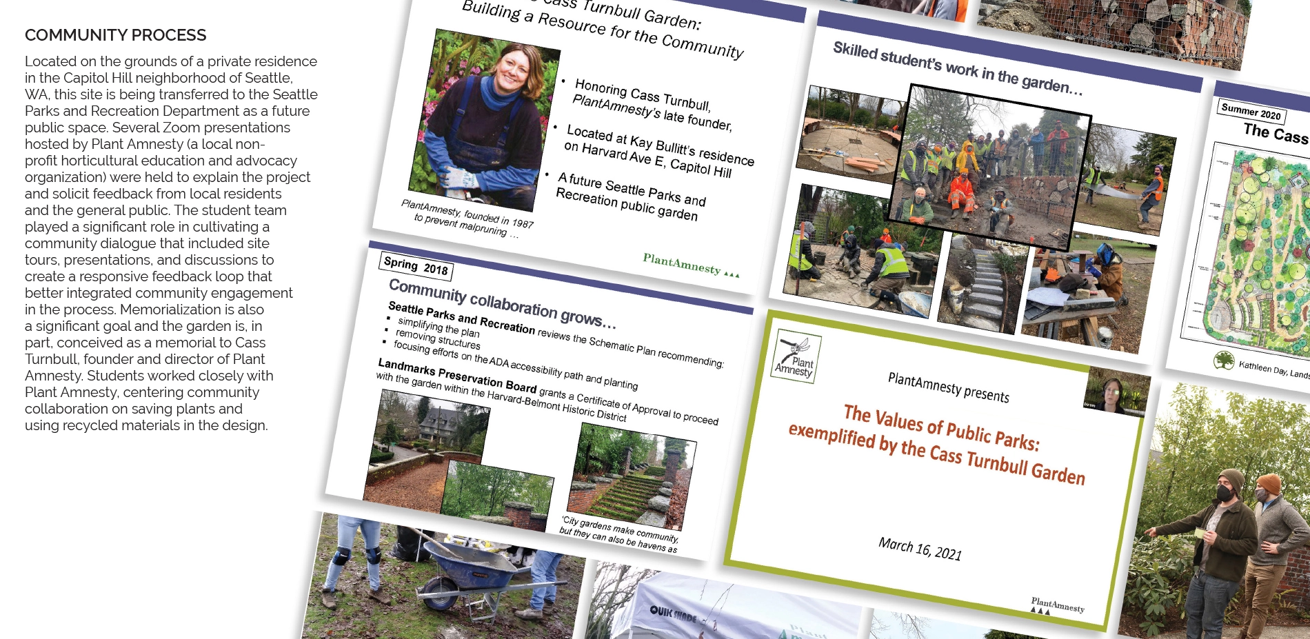 Community Process: Much of our process was gaining an understanding of Katherine Bullitt and Cass Turnbull, both of whom are memorialized in the garden. Interviews with those who knew them were conducted to understand their preferences, personalities, and aspirations. Several Zoom presentations hosted by Plant Amnesty were held to explain the project and solicit feedback from local nearby residents and the general public. These have been critical to the success of the project as the earlier concept development and site preparation had limited public input. To address this lack of inclusion, the student team plays a significant role in cultivating a community dialogue that included site tours, presentations, and discussions to create a responsive feedback loop that will better integrate community engagement in the process. The students reduced the hostility that had grown and have garnered much community support for the project that had previously not existed.