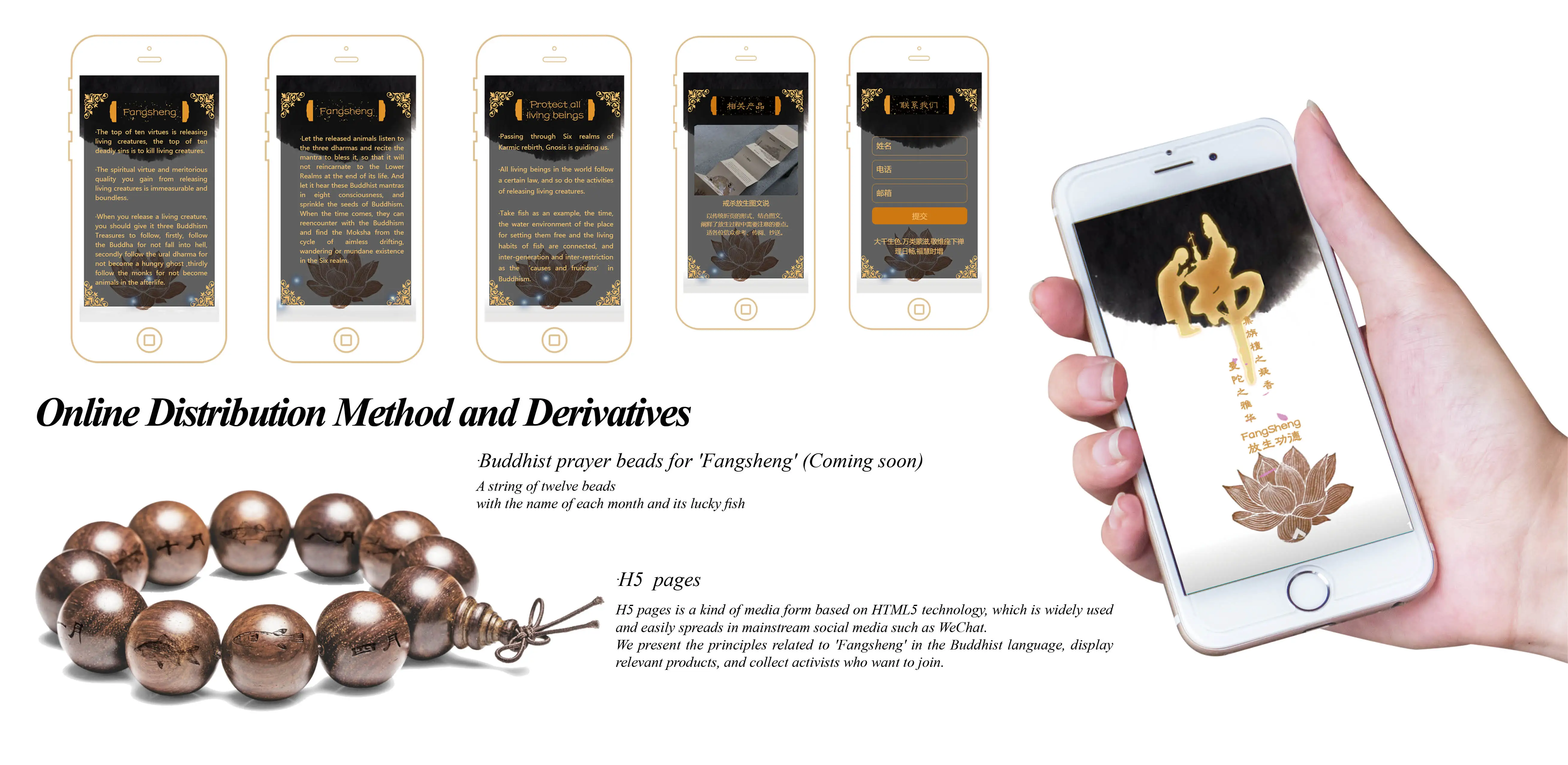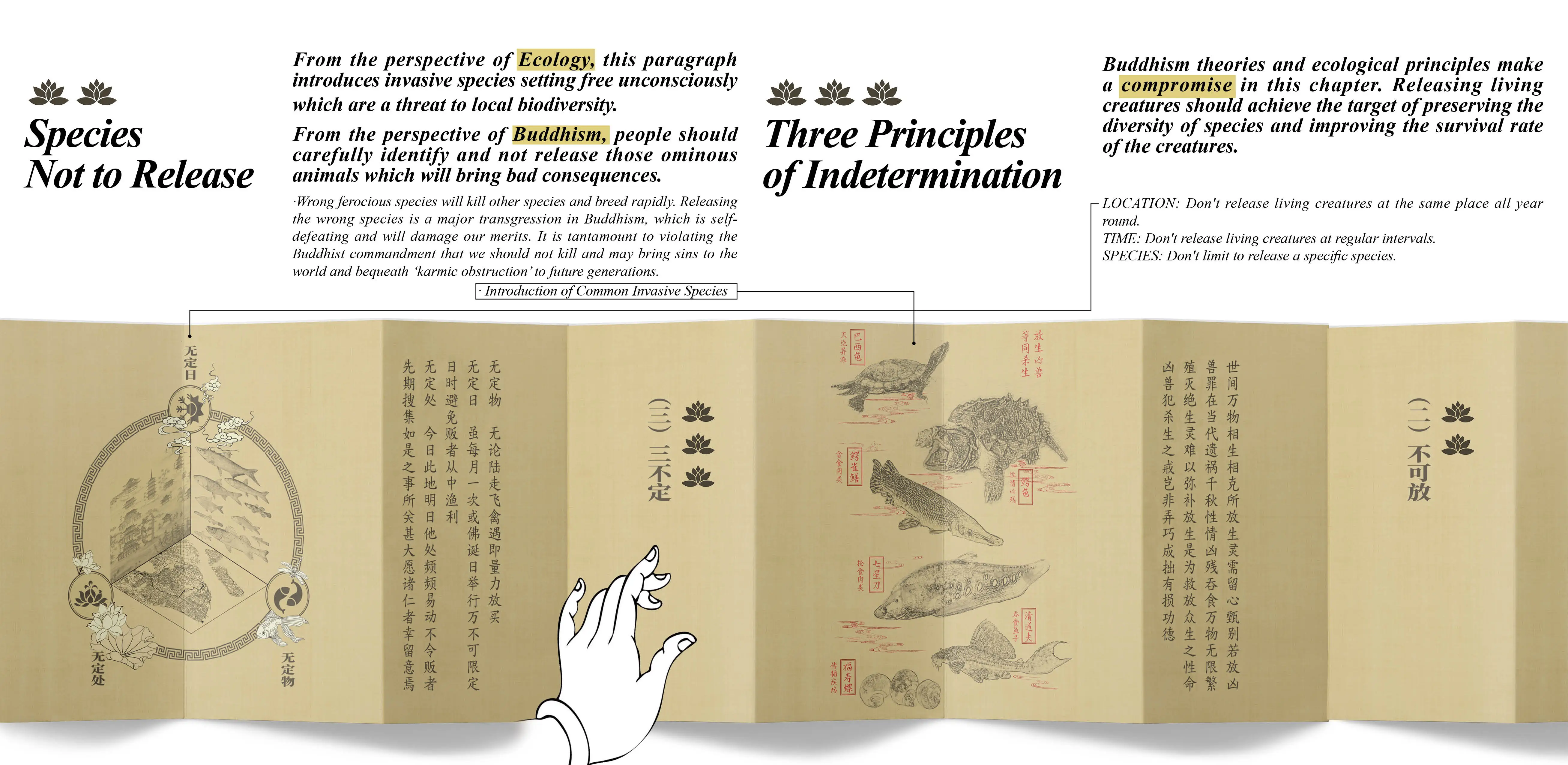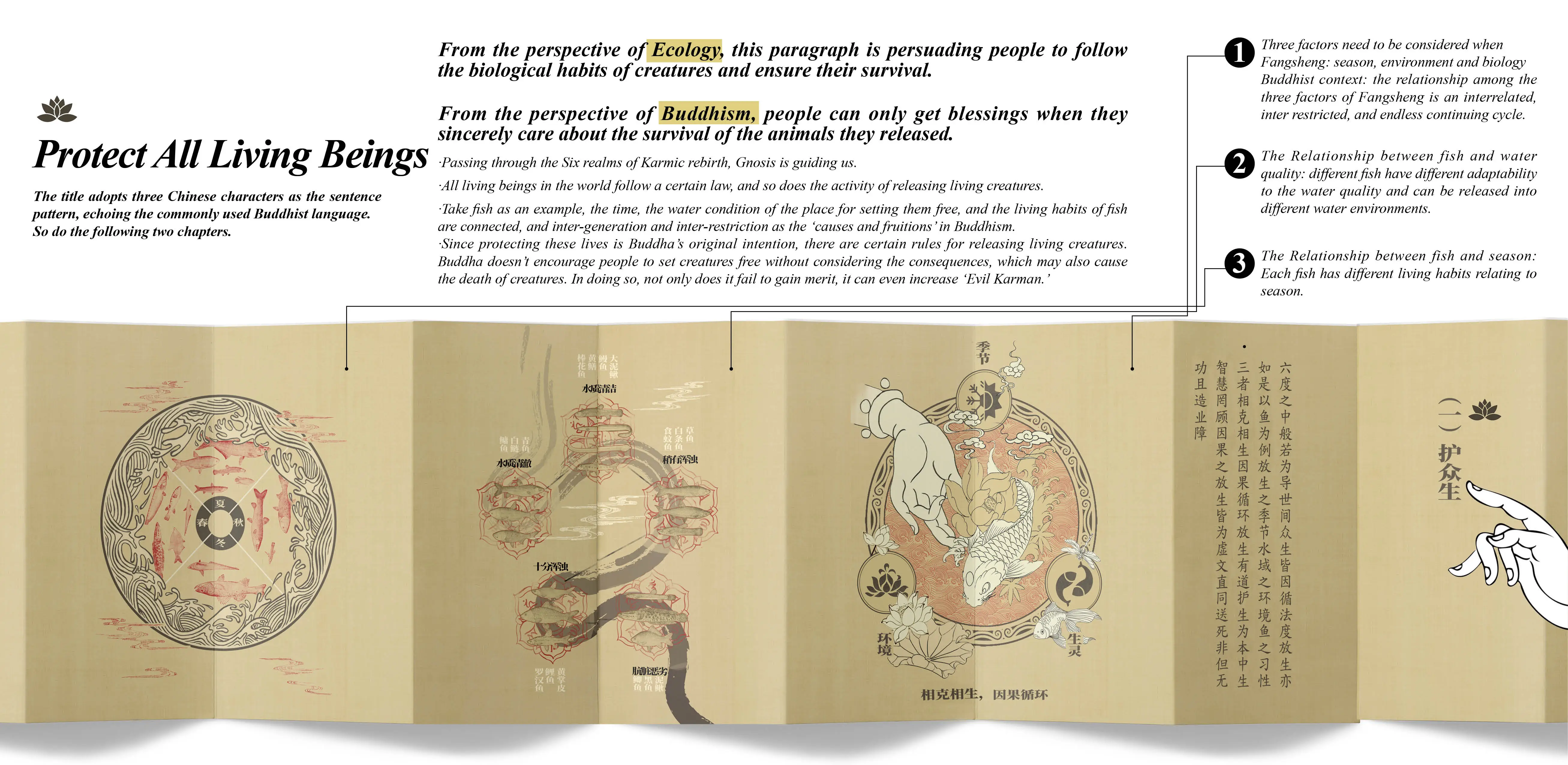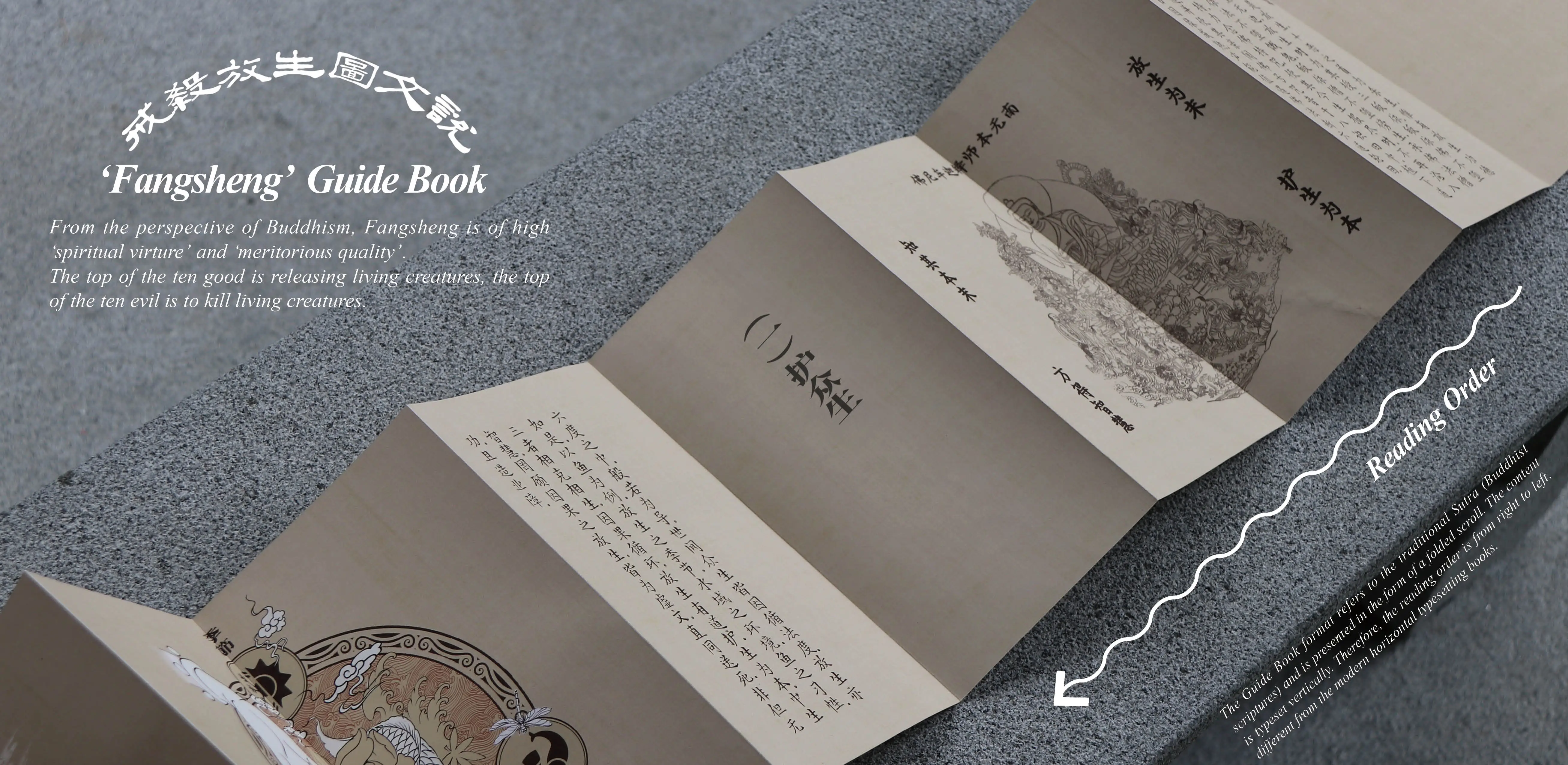 In this project, three products have been made——' Fangsheng' monthly calendar, 'Fangsheng' weekly calendar, and 'Fangsheng' guide book. They are produced to answer the question of “where”,“ when”, and“ how” to conduct 'Fangsheng' into an environmentally friendly and sustainable activity. The calendar is commonly used by Buddhist temples and believers to remember Buddhist festivals and is also preferred by older people. 'Fangsheng' guide book is designed in a folded form which is the same as ancient Buddhist classics. The form of products creates a familiar atmosphere for believers to read, making the content more persuasive.