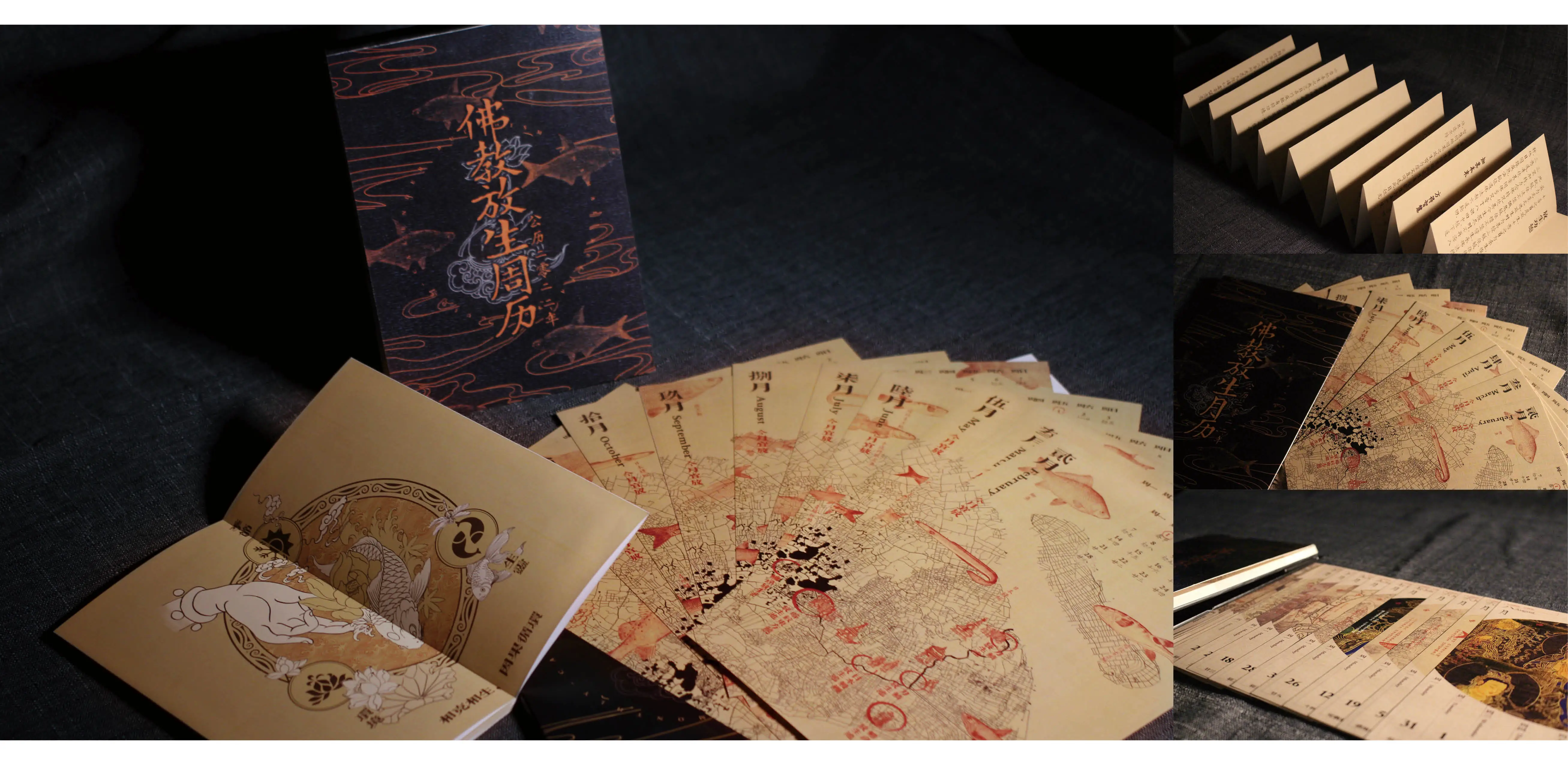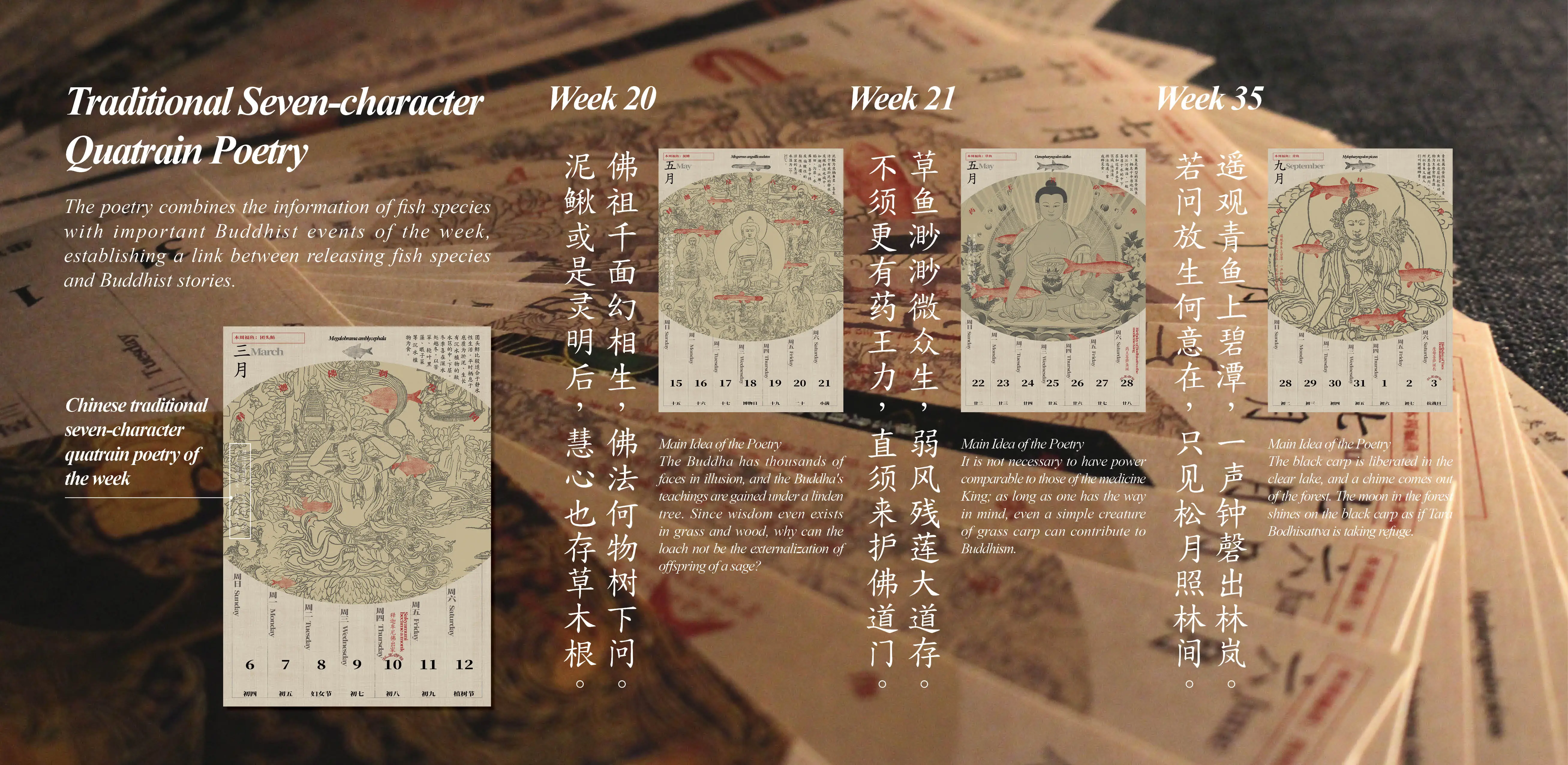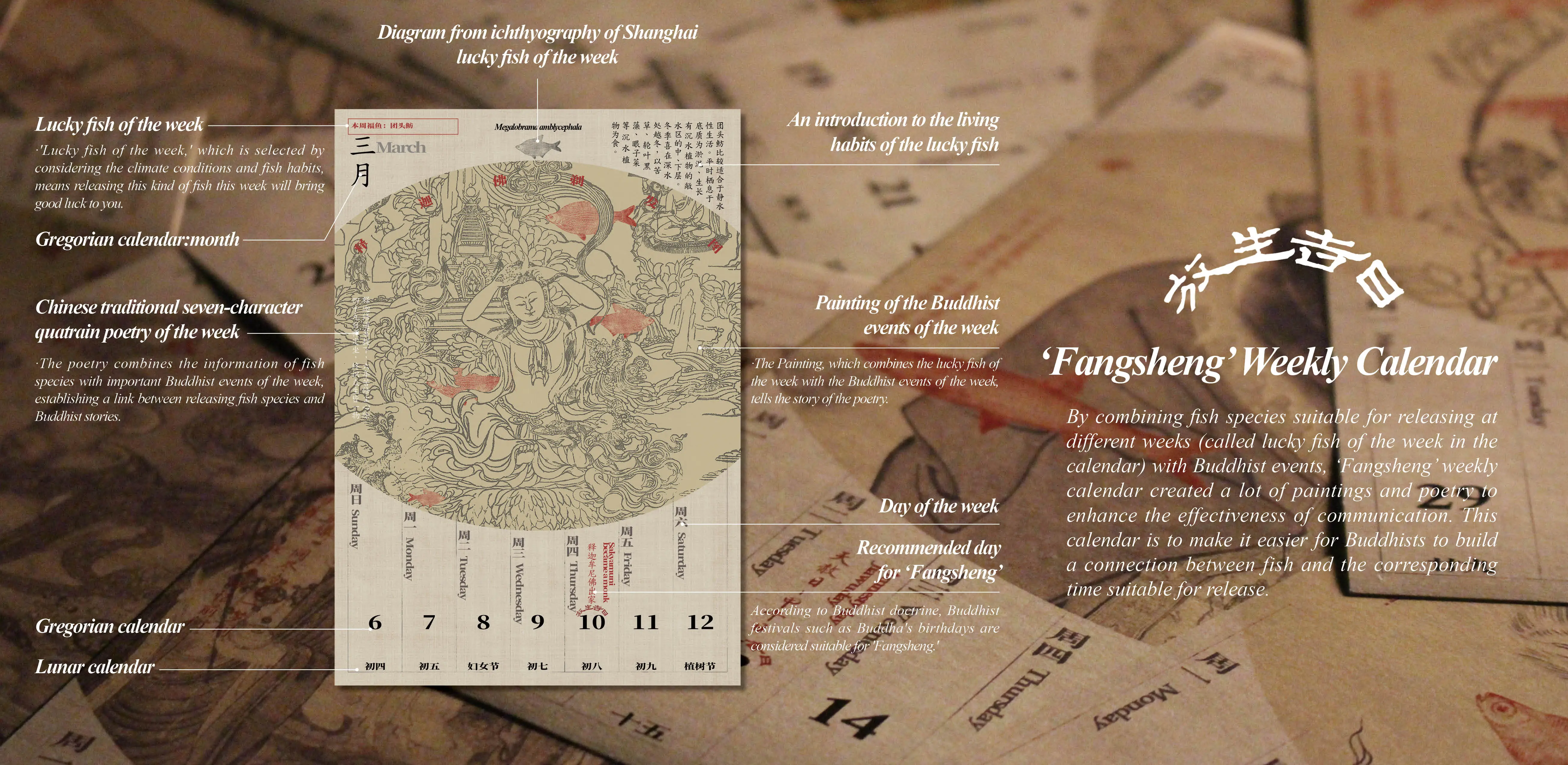 In the 'Fangsheng' weekly calendar, we create connections between Buddhism and fish for release from a more detailed perspective, and the popular science on fish habits has been added. Furthermore, by combining fish species suitable for releasing at different weeks (called lucky fish of this week in the calendar) with Buddhist events, we try to put a scientific ecological concept into 'Fangsheng' while maintaining its religious nature, and we also write poetries and make paintings to deepen the idea.