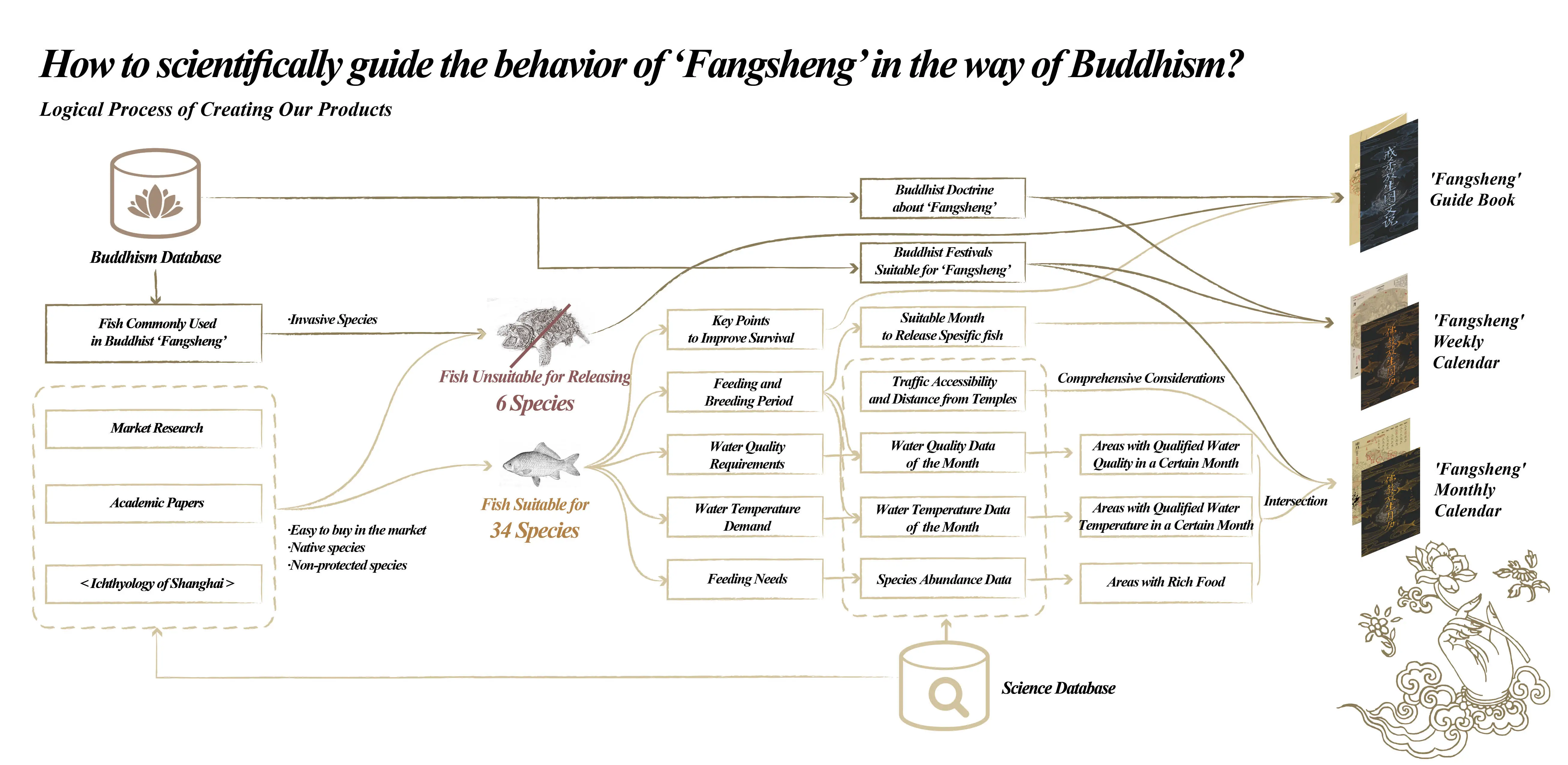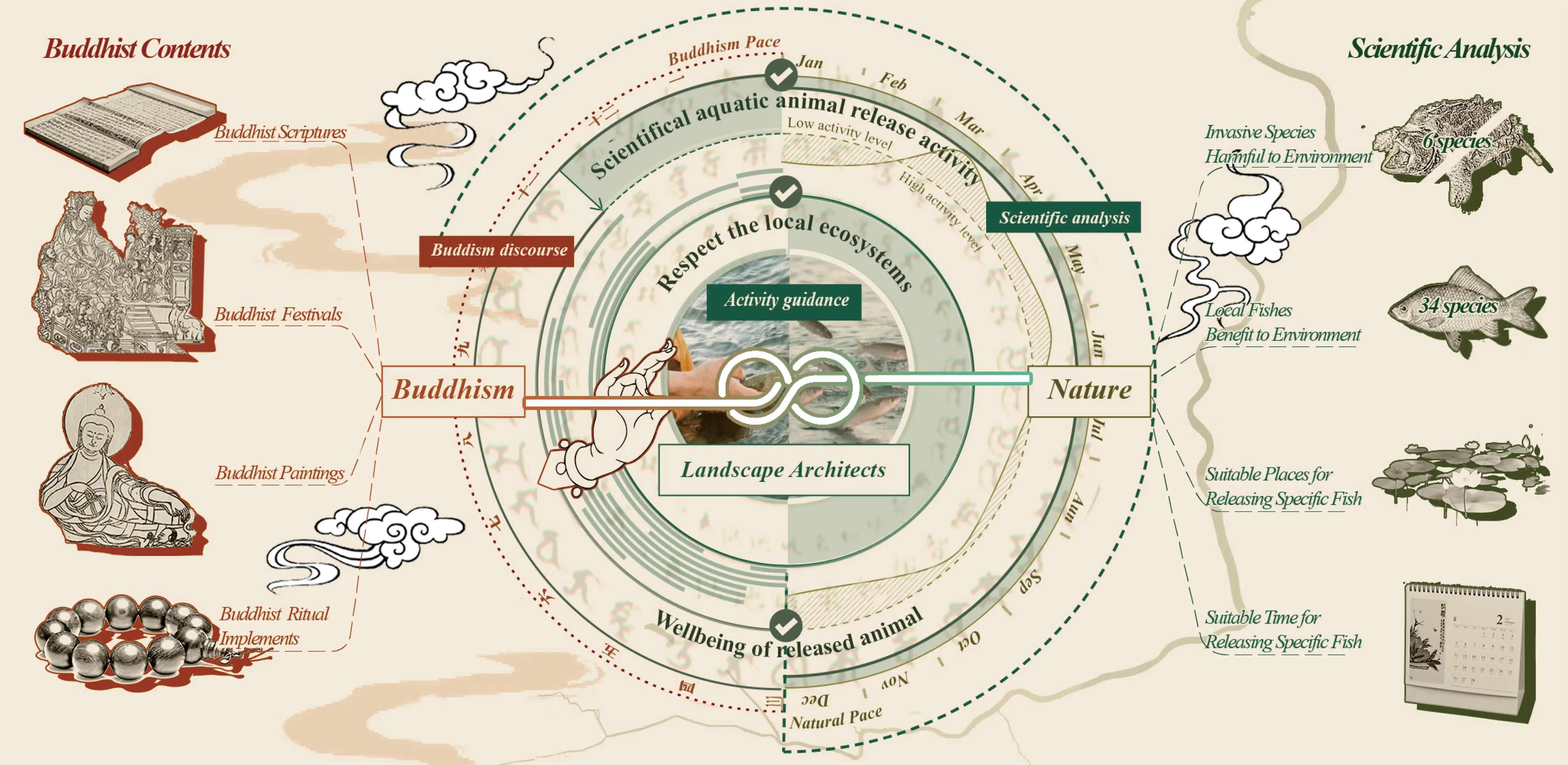 'Fangsheng' monthly calendar contains a map of Buddhist style, marking suitable places for releasing certain kinds of fish, called 'Fangsheng pool’, and the calendar next to the map marks the Buddhist festivals suitable for 'Fangsheng'. Guided by this calendar, Buddhist believers will understand when and where to release certain kinds of fish. The suggestion on the calendar is made through scientific methods, integrating multiple urban data of shanghai, such as the data of water quality, water temperature, and species abundance, which are integrated into GIS to assist decision making. In addition, the process gives full play to the advantages of landscape architects.