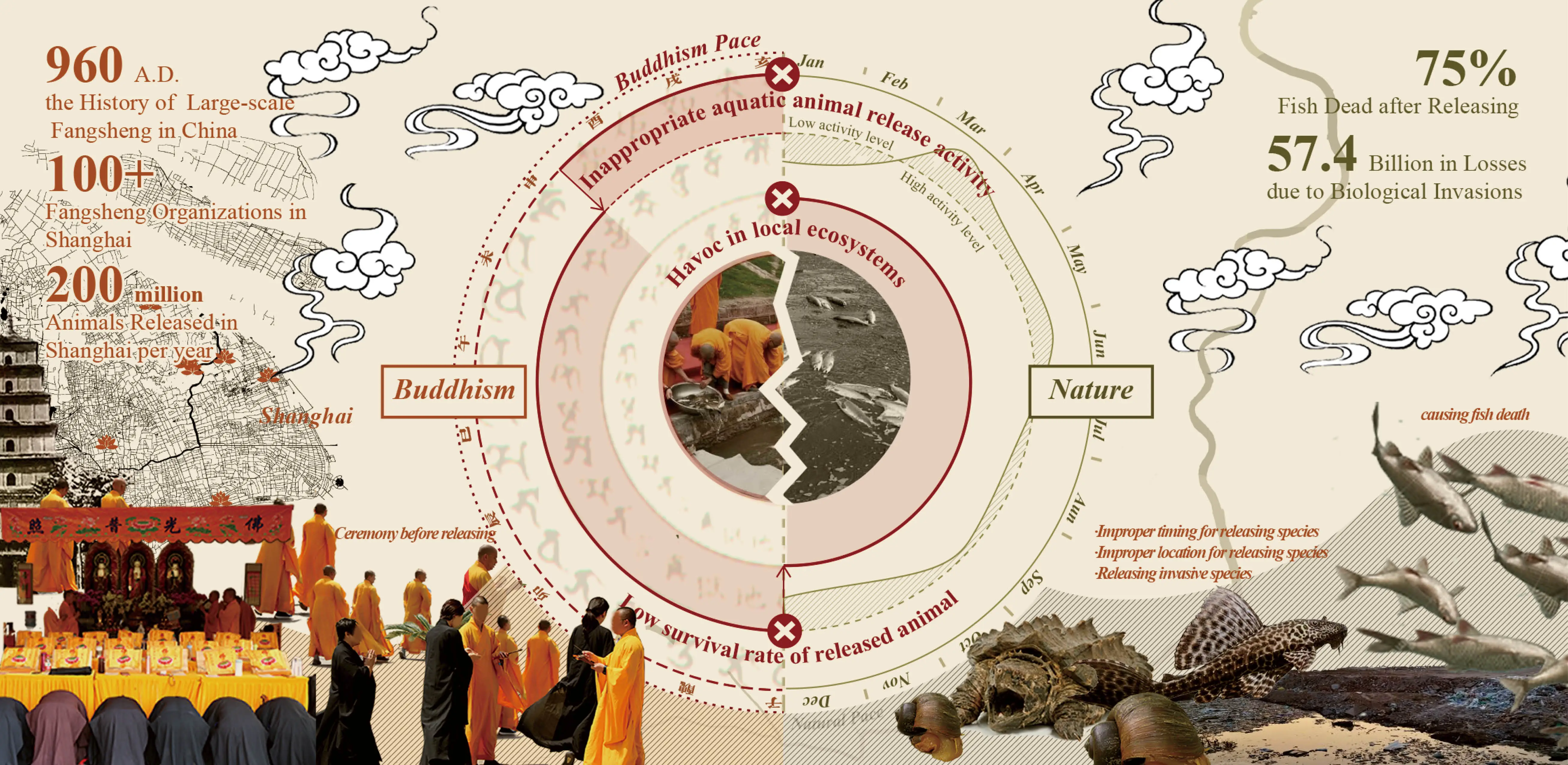 'Fangsheng’, or 'releasing animals’, to demonstrate compassion and earn merit, is a traditional Buddhist ritual in which captive creatures are freed, usually at a particular time. This practice has a long history since the Spring and Autumn period in China and remains popular today. Since Shanghai is a city with a large number of Buddhist believers, thousands of spontaneous 'Fangsheng' activities take place here annually, and tens of millions of fish are released into rivers.