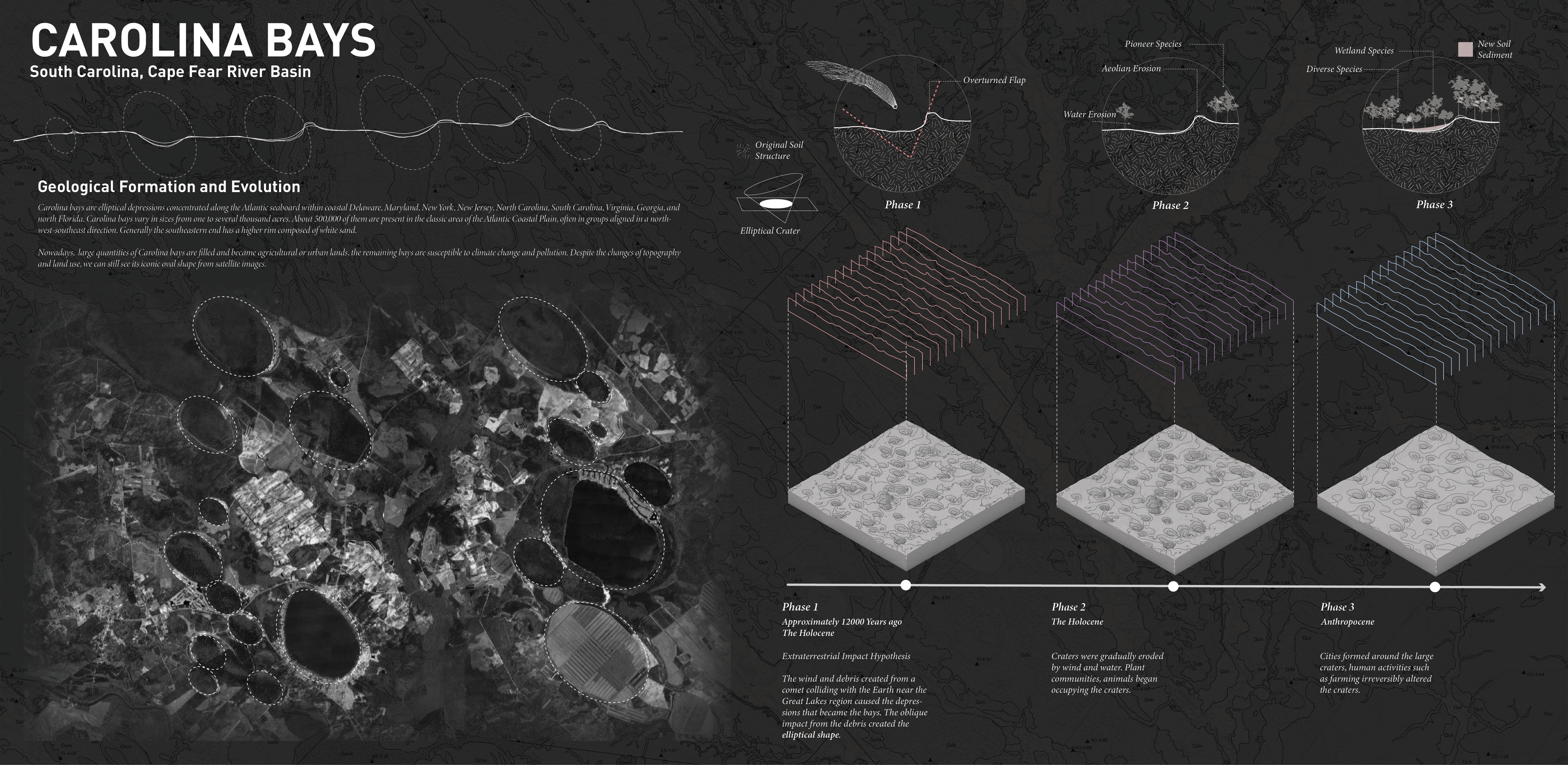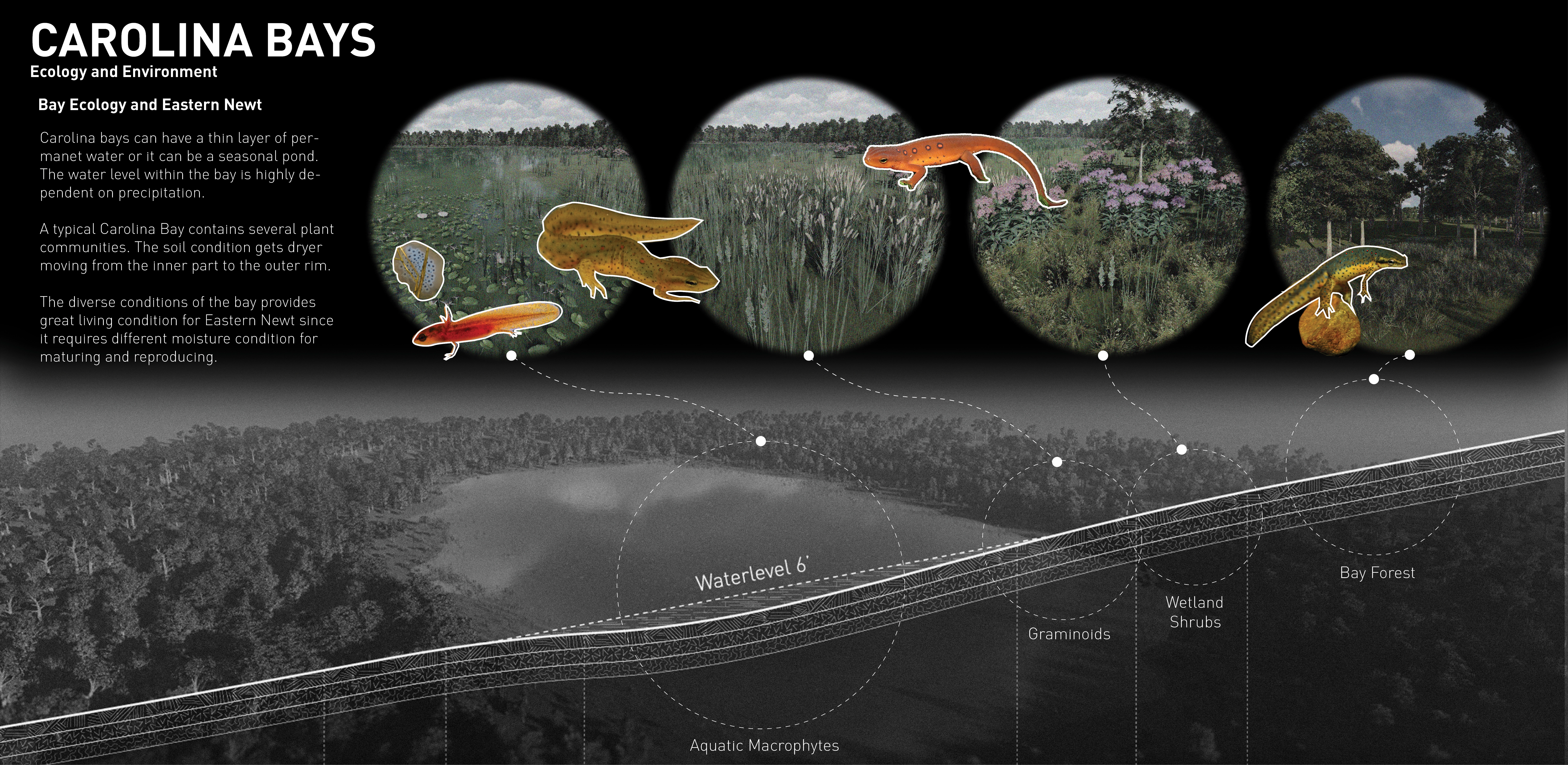 The project started as an inquiry of a seemingly bizarre geological feature, the Carolina Bays. From satellite imagery, the bays are tilted in the same angle, scattered on the southern coast of the United States. The bays vary in water level, some are permanent open water, others are seasonal ponds that depend on precipitation. The bays also vary in sizes and depth but are distinctive with their elliptical shape. The wide range of vegetation structures, moisture and soil condition make the Carolina Bays one of the places with the most biodiversity along the coastline, including some of the rare and endangered species.