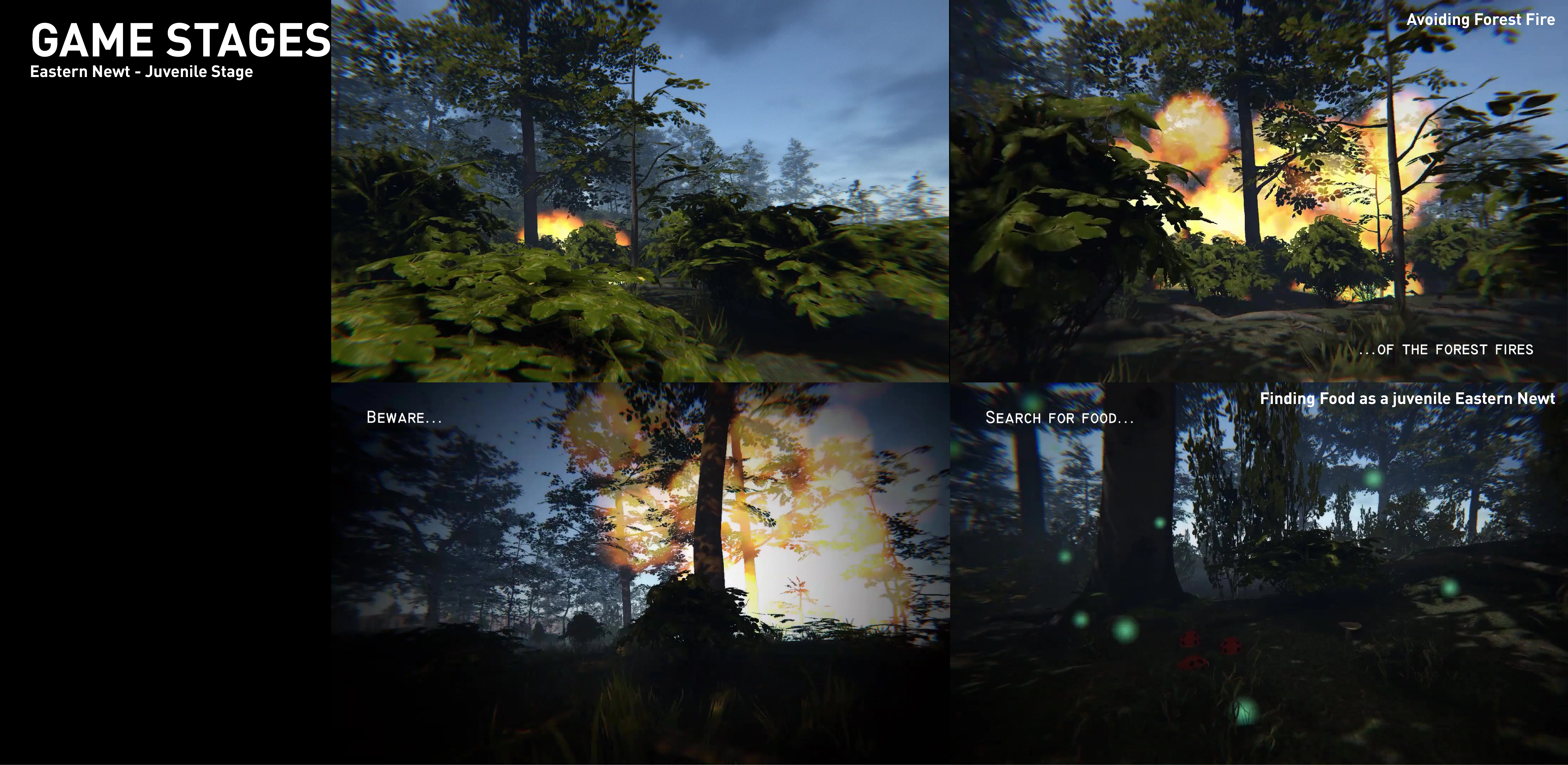 In this game, you are a male eastern newt at larva stage. Your mission is to survive and find another female eastern newt as your partner and go back to the water to reproduce. Survival is not an easy task in a bay with human activities and natural predators. Staying in the water for too long might be dangerous, for it is polluted by toxic chemicals that are discharged by human industries. Forest fires might occur due to extreme weather conditions, or it might be a prescribed burn by humans for maintenance purposes. You might lose your habitat due to urban development, or it could be inhabitable simply because of the lack of precipitation.