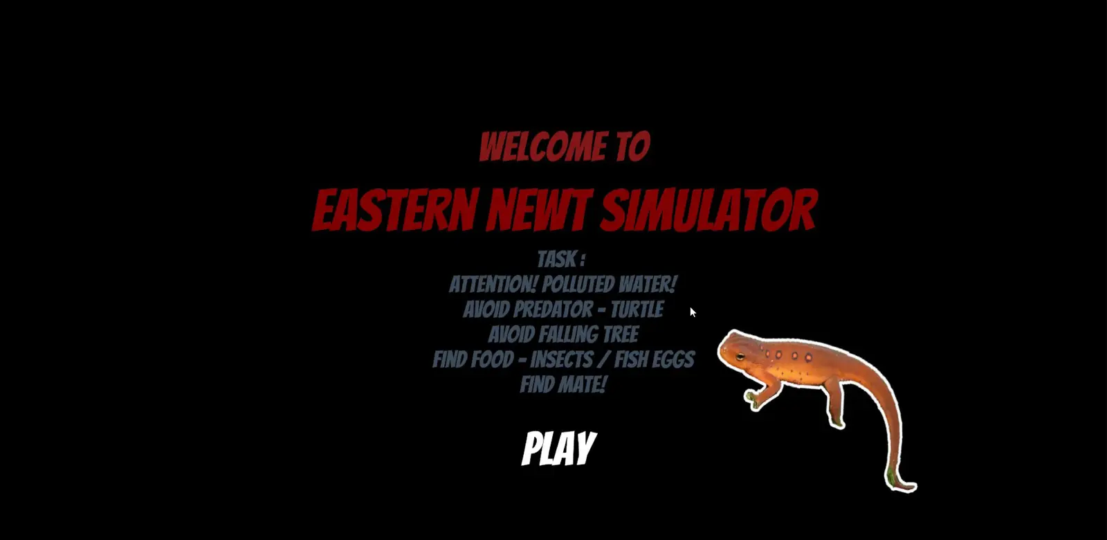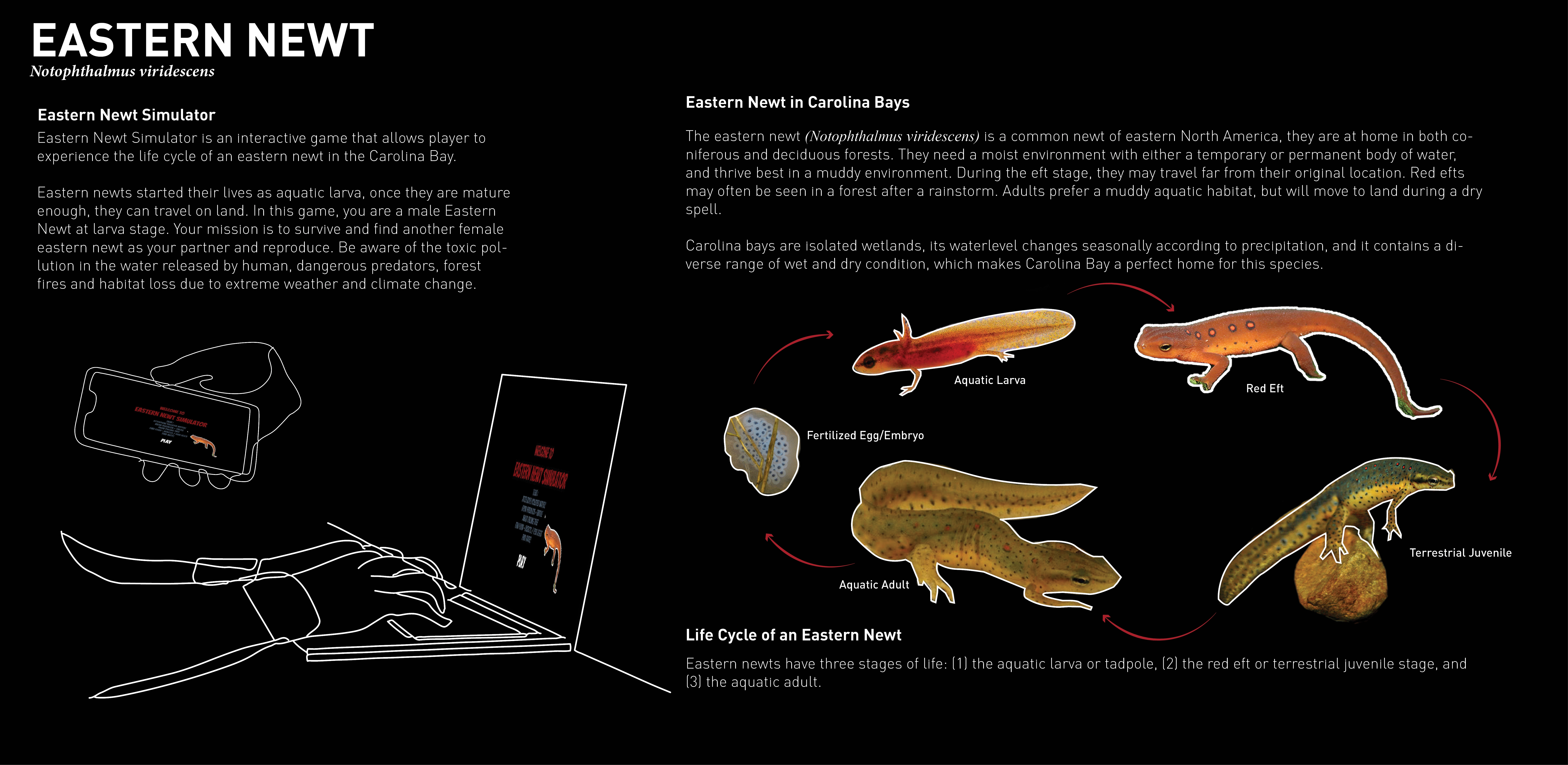 As an immersive and interactive video game, Eastern Newt Simulator focuses on the ecological dynamics of a particular sensitive indicator species in the Carolina Bays. Building on previous studies, the dynamic simulation raises awareness of climate change and its impact to fragile ecosystems. Utilizing the Unity game engine software, the project allows players to be a eastern newt larva and embark on an adventure to survive, grow and eventually find a mate to reproduce.