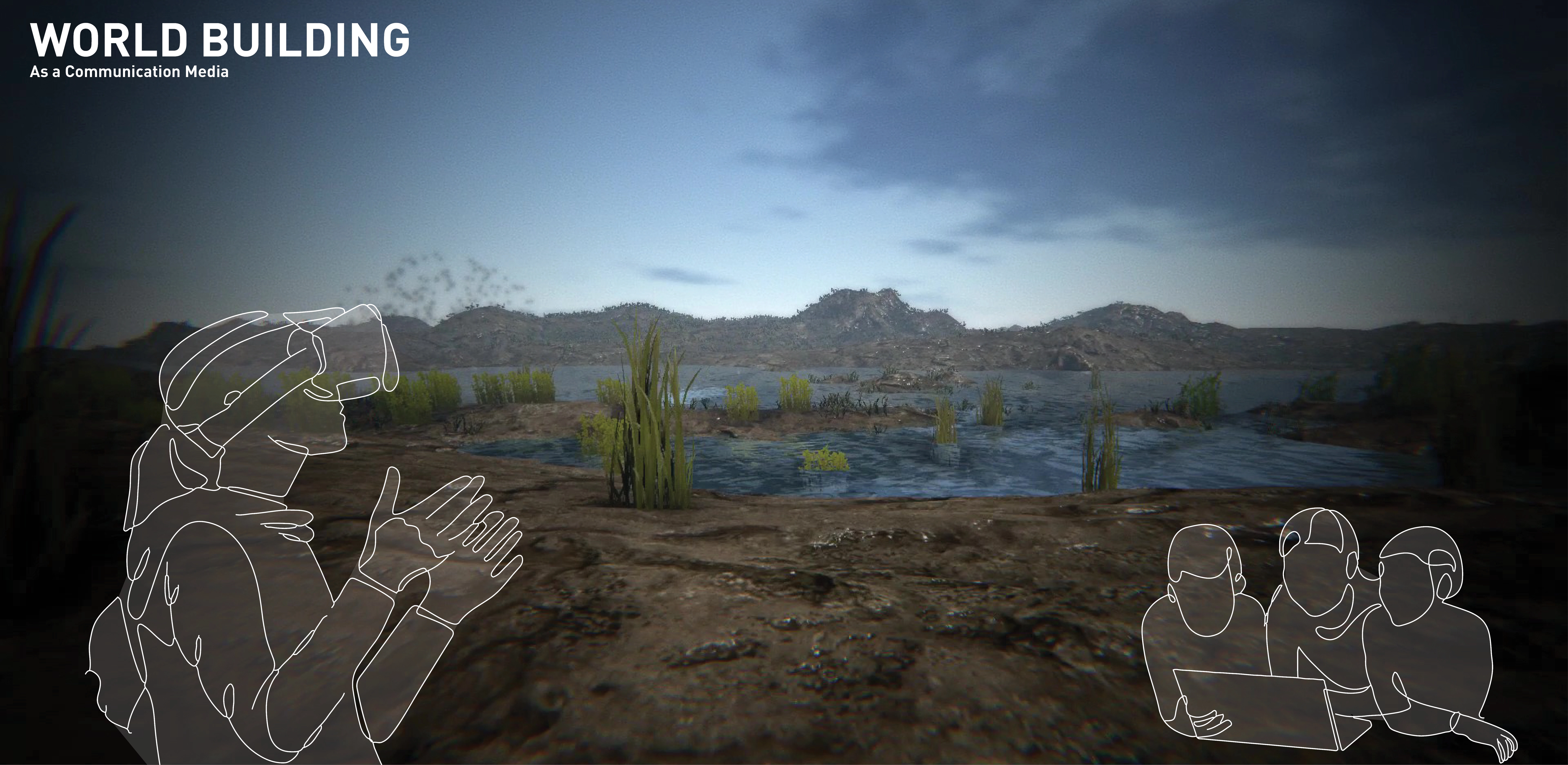World building through game engine software can be a powerful tool for landscape architects to visualize the impact of climate change to a wider audience. Unlike drawings or static 3D models, video games are particularly engaging, interactive, and exploratory. Through carefully choreographed worlding building, landscape architects can digitally transform their conceived space to a perceived space, and to convey their messages by encouraging players to discover and experience for themselves. In addition to the interactive nature of video games, it is also a well-established format of entertainment. Landscape architects can take advantages of this media and deploy our interdisciplinary skills of conceiving a space, choreographing a sequence of movements, synthesizing scientific data and studies and so on through gaming and world building. Furthermore, the media of gaming allows the audience to travel between physical locations and scales, to travel between temporal scales, and to experience inter-corporeality by place oneself in different bodies.