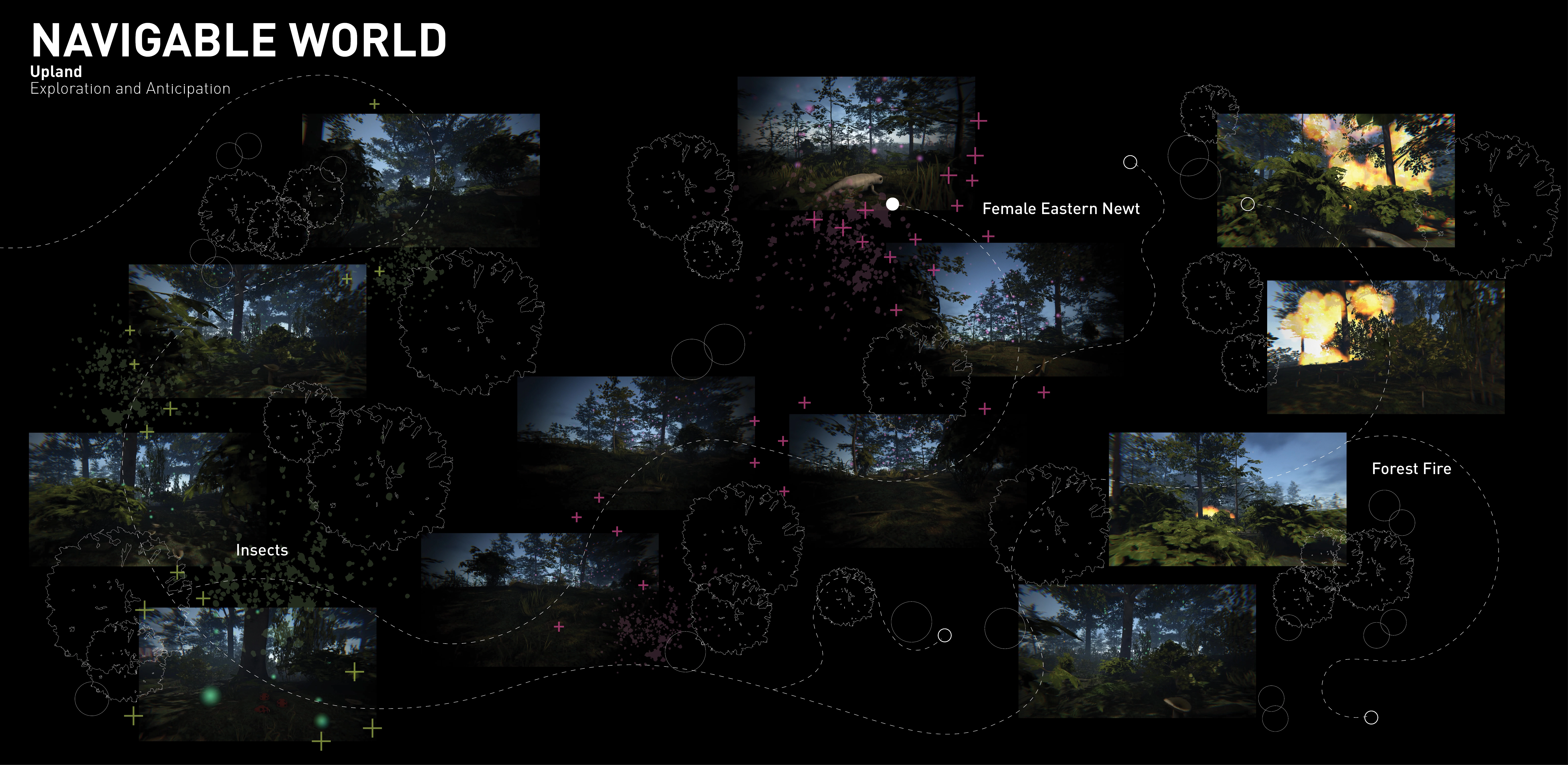 The integration of research and virtual world building through game making gives landscape architects a more communicable tool to express our ideas and concerns to a wider audience. It also gives the audience more agency in participating in learning and exploring the relationships and entanglements compared to a complex diagram or a piece of scientific paper. The instant visual and auditory feedback, the exploratory nature of a video game provides an alternative way of communicating ideas to non-designers.