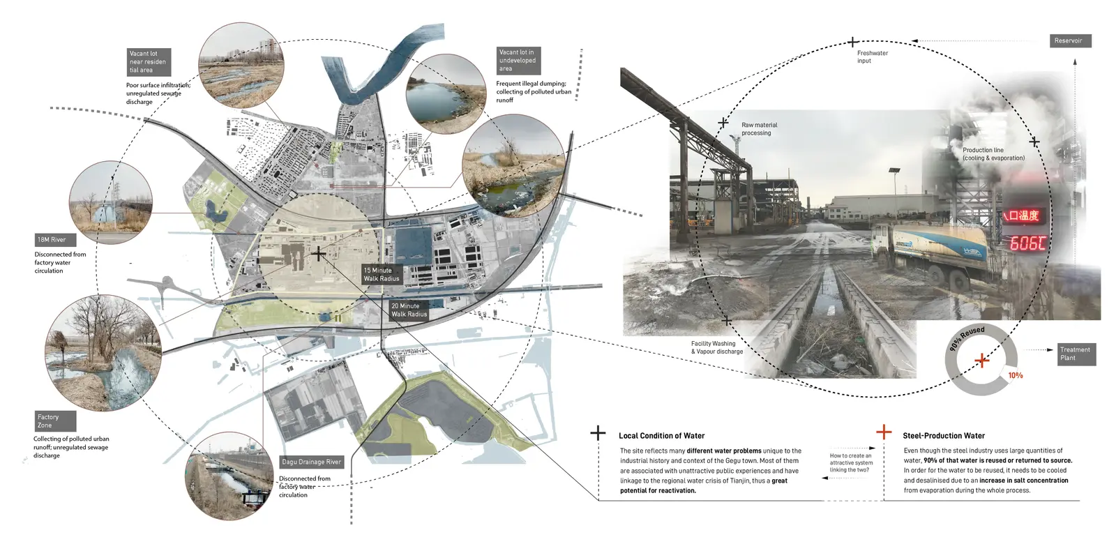 Tianjin, as the port city with an ongoing legacy of coastal trades and industries, is now facing severe hydrological problems: the scarcity, accelerating upstream pollution, and high groundwater salinity. Situated in such context, compounded by its unique industrial heritage now threatened by the top-down land-use&relocation policy, the town of Gegu with Rockcheck Steel Plant as its biggest manufacturer urges a resilient framework to both honor its cultural identity as an industrial powerhouse and restore a healthy link between the people and water.