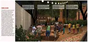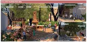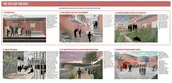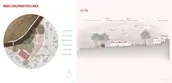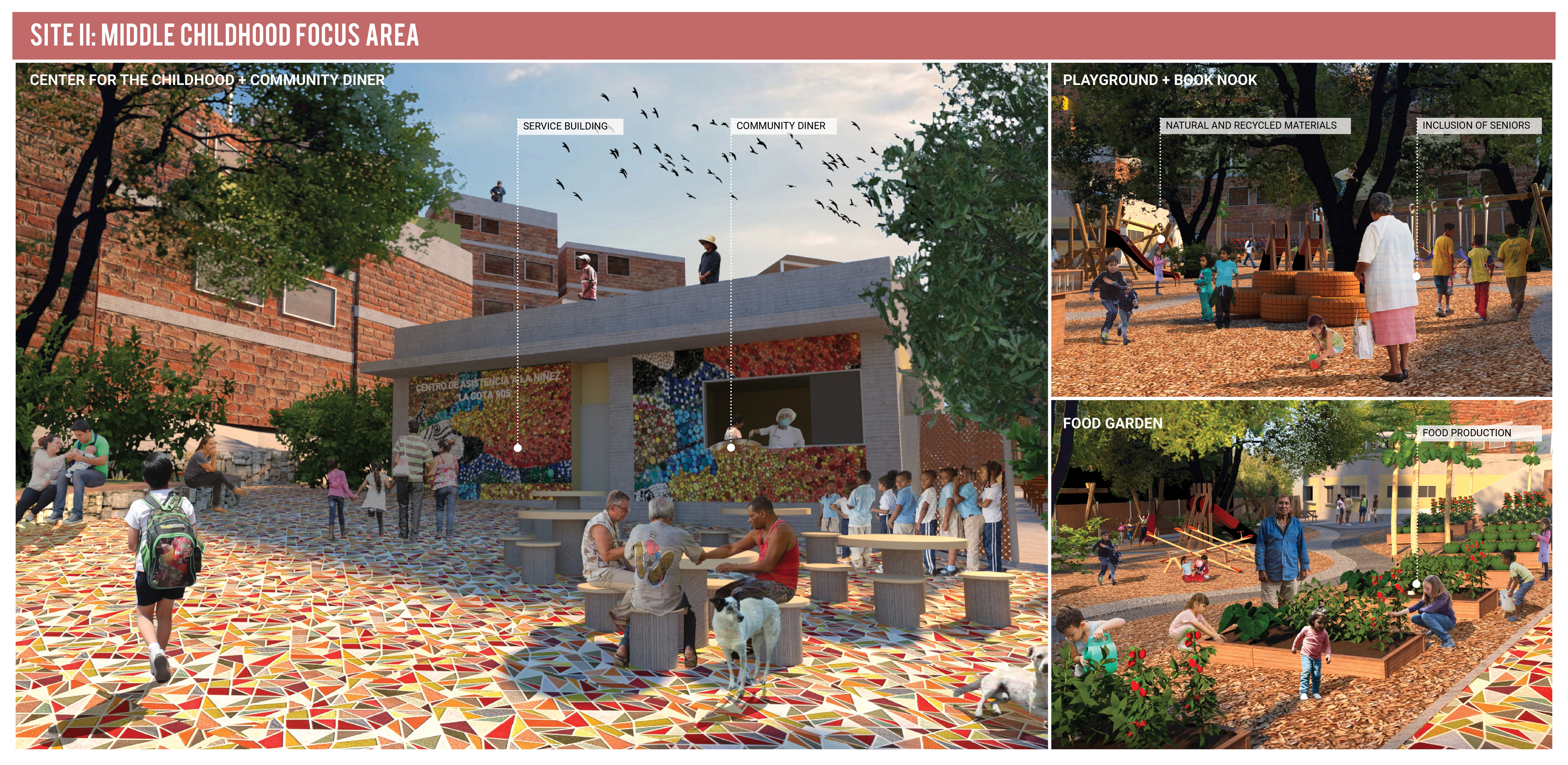 Next, the Middle Childhood Focus Area is located on the grounds of an existing mechanical workshop. This second intervention targets middle-aged childhood needs and aims to provide childcare services to the community and assistance to its most vulnerable members. The Middle Childhood Focus Area includes multiple outdoor areas for recreation and a service building that offers educational programming, including an internet room, a library, a community kitchen, and washrooms. This childcare complex relies on active seniors to participate in the care of the children as an opportunity to generate income and build stronger community ties, while making childcare services affordable for parents. This provides a solution to the issue of unsupervised kids running the risk of ending up in undesirable situations. Depending on the availability of resources, the space can be subdivided and implemented into three phases. The first one is the east plaza, part of the front garden, and the building, to start functioning as a small childcare center. Second, the book nook and the playground, and third the food garden and all connecting paths. These services within the Middle Childhood Focus Area aim to ease the burden of parents, reduce risk factors, and keep children from leaving their communities at an early age.