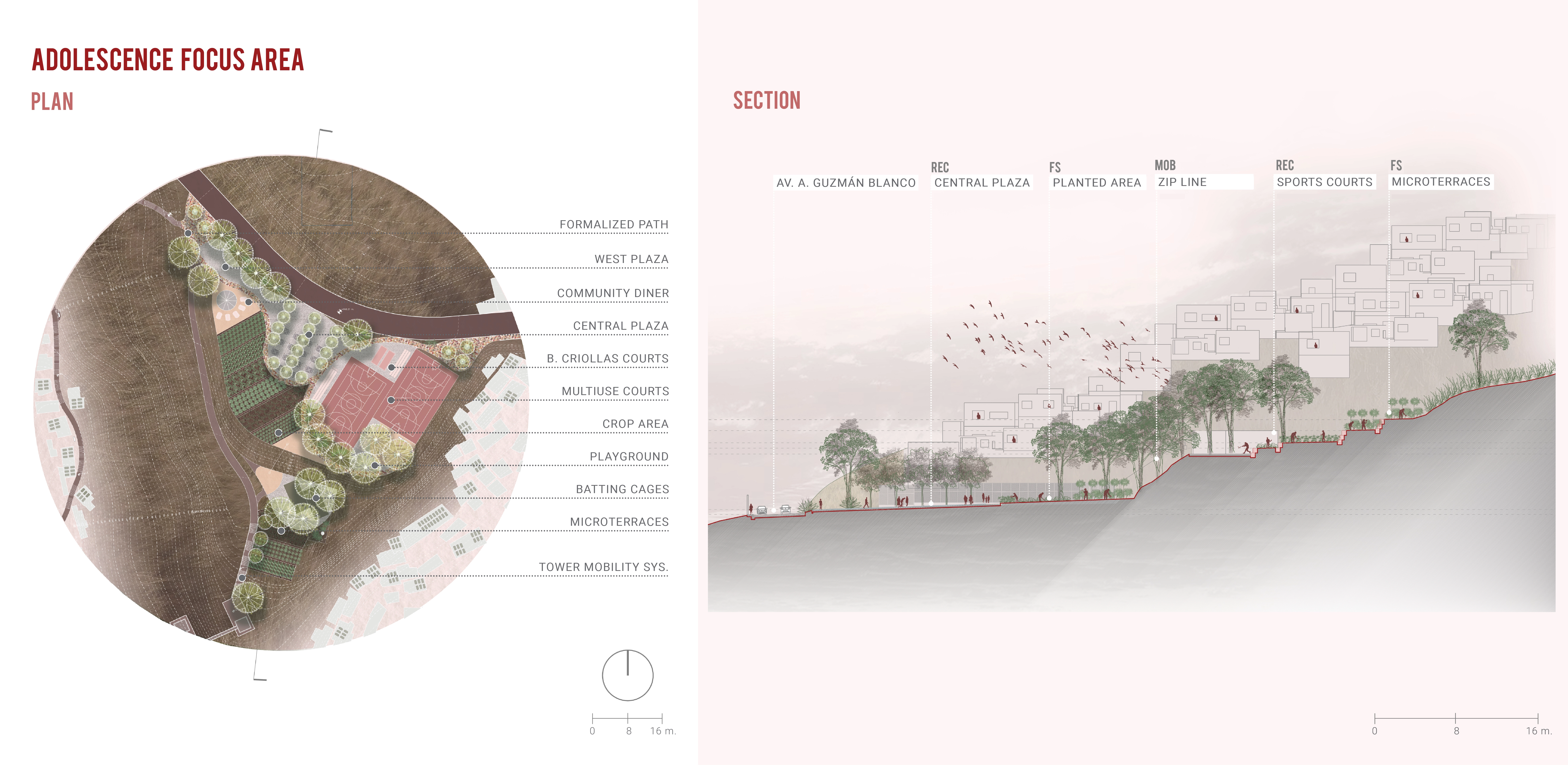 Lastly, The Adolescent Focus Area is composed of three programmatic areas arranged to create a space that serves multiple age groups. The first area is the sports complex. The intention is to host sports tournaments and practices that bring the youth of La Cota 905 together with the youth of other areas in Caracas around sports and teamwork. The second element relates to food security. Eighteen hundred square meters of crop area plus a community dinner are devoted to increasing local food production. The focus on community food production introduces adults to the space and encourages young people to learn about food production from older community members. The final element is two flexible plazas. Programming for these spaces will be determined based on community needs but are the appropriate size for artisan and food community markets or to host community gatherings. The Adolescent Focus Area could be phased over four periods to plan and develop each space to align with community needs.