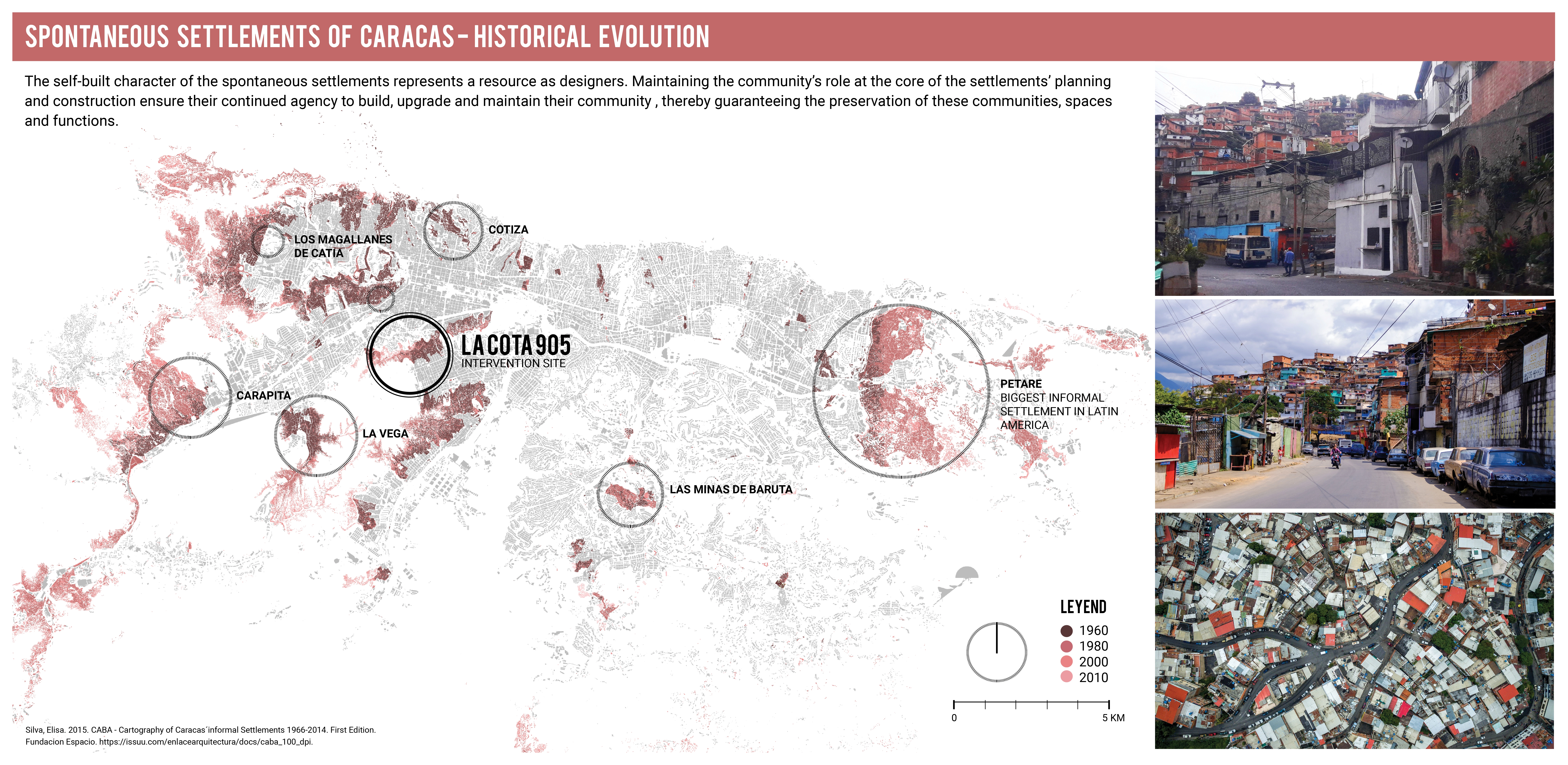Informal settlements are self-built areas often located on land deemed unsuitable for construction according to local regulations. In Venezuela, these communities originated with migration from rural to urban areas for economic opportunities during the country’s oil boom beginning in the 1920s. Today, these communities are severely under-resourced and are marked by high rates of poverty and violence. Spatially, the density in informal settlements is easily four times greater than of the planned city, and homes are often built on slopes greater than 40%, creating numerous safety and accessibility challenges. Through a series of public space interventions, this project reimagines the role of landscape architecture to work with existing community contexts to design in response to local materials, topographical conditions, and community needs to reduce the factors that lead to cycles of violence.