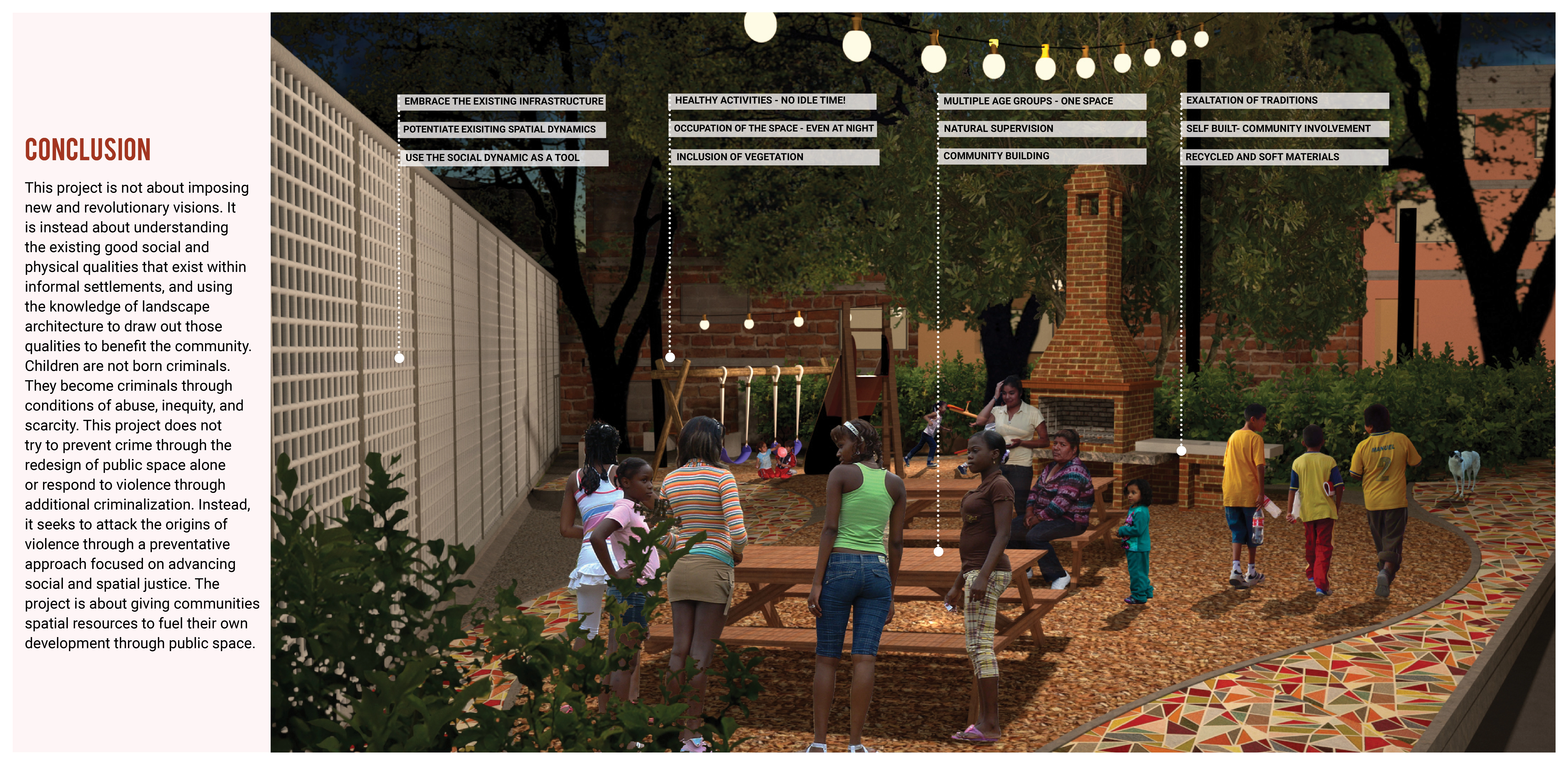 This project is not about imposing new and revolutionary visions. It is instead about understanding the existing good social and physical qualities that exist within informal settlements, and using the knowledge of landscape architecture to draw out those qualities to benefit the community. Children are not born criminals. They become criminals through conditions of abuse, inequity, and scarcity. This project does not try to prevent crime through the redesign of public space alone or respond to violence through additional criminalization. Instead, it seeks to attack the origins of violence through a preventative approach focused on advancing social and spatial justice. The project is about giving communities spatial resources to fuel their own development through public space.