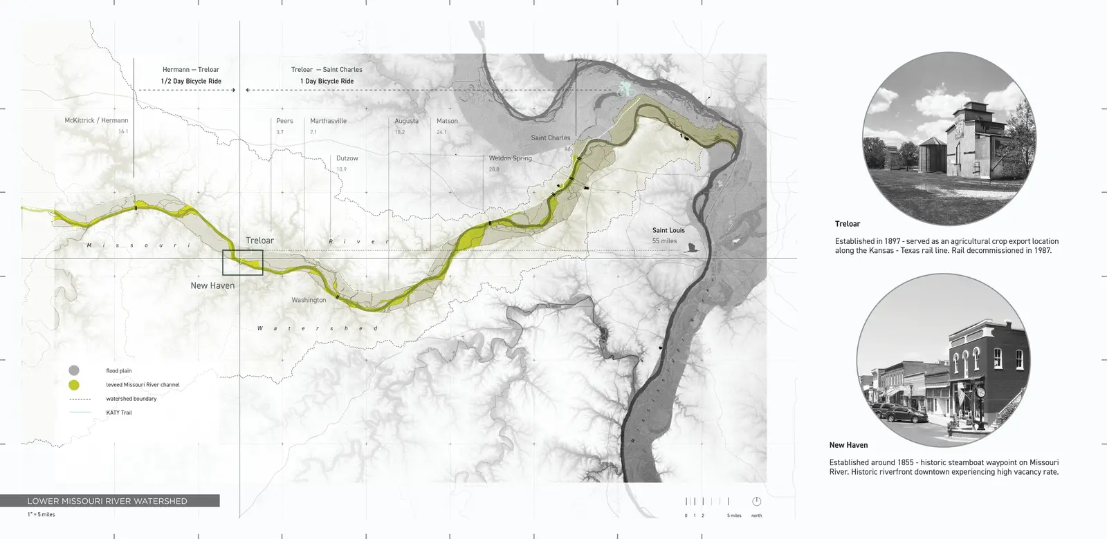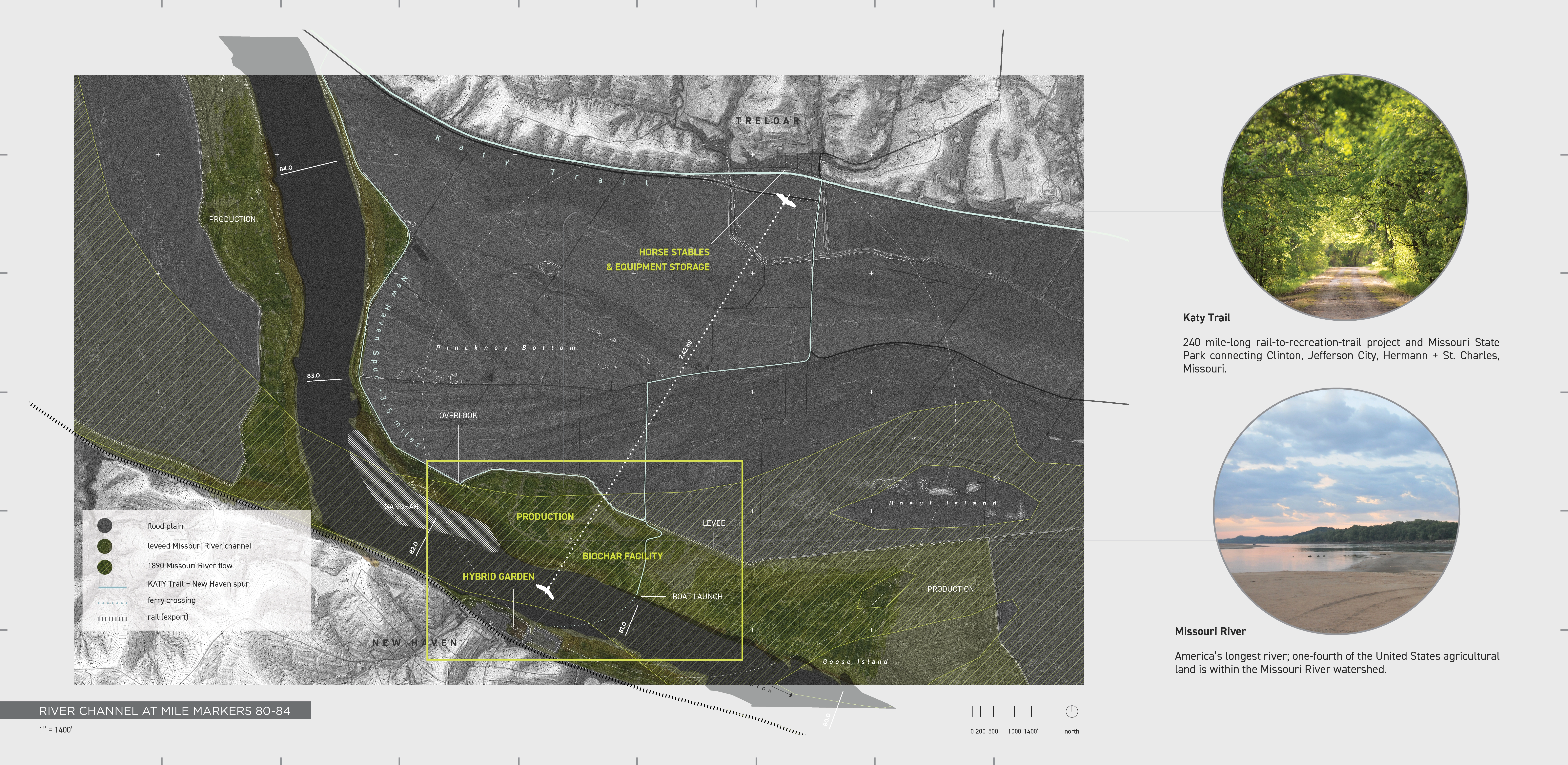 This proposal for the establishment of a biomass production operation within the river’s flood zone has integrated aspirations of ecological restoration, regional economic stability, and advancing social equity. The WRP is envisioned as a scalable equitable cooperative available to residents of New Haven, Treloar, and Missouri’s displaced indigenous communities, working in conjunction with the natural systems of the lower Missouri River Valley. In addition to the site’s potential for silviculture development, a 3.5 mile spur and ferry crossing connects the nearby Katy Trail to route cyclists between Treloar and New Haven. Campsites for Missouri River kayakers and canoeists and trail systems through the riparian woodland offer recreational opportunities for locals and visitors. Hybridized programs of production, research, and recreation expand the typology of rural public space to create opportunity for unconventional interactions between people, ecology, and place.