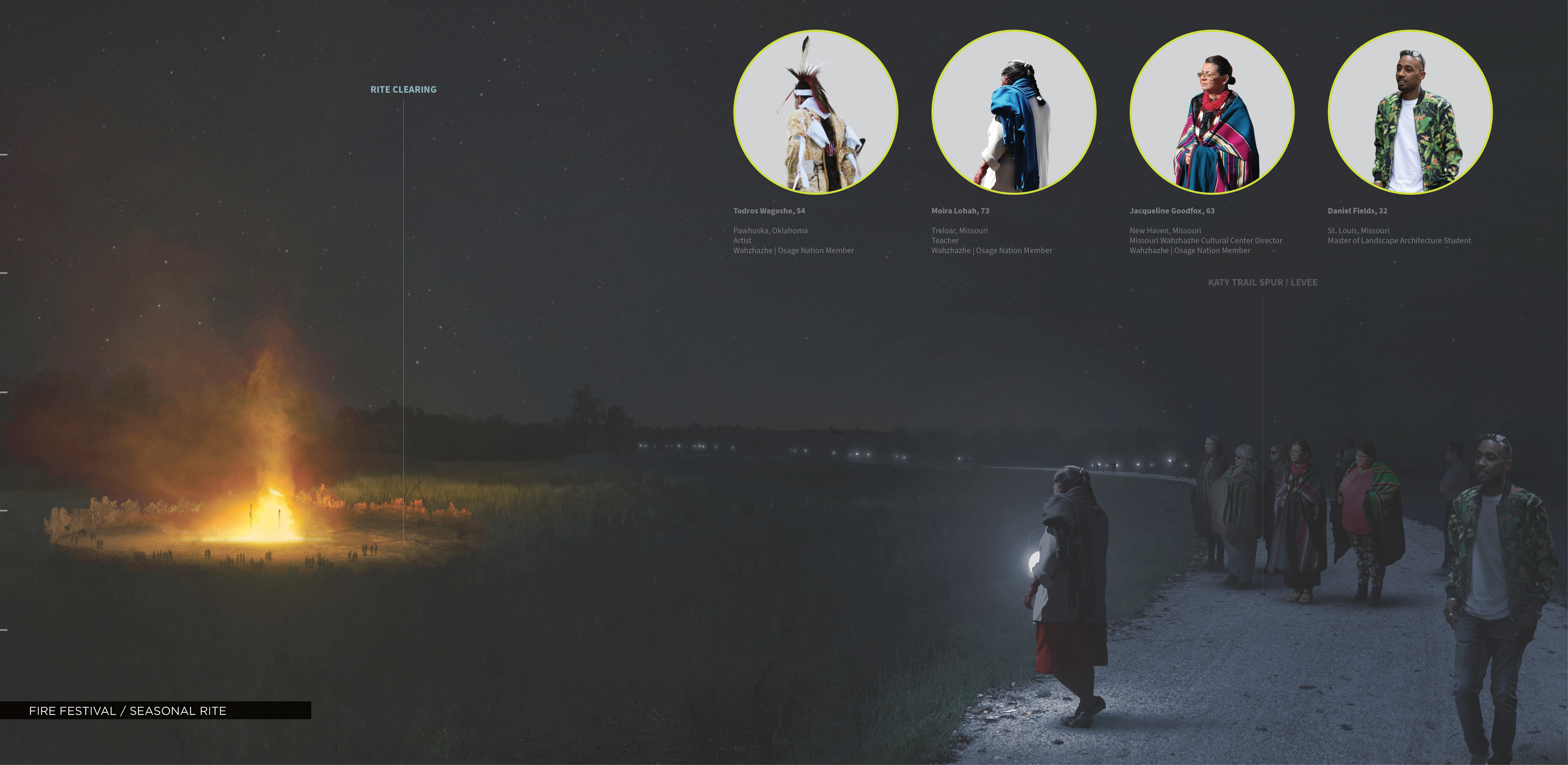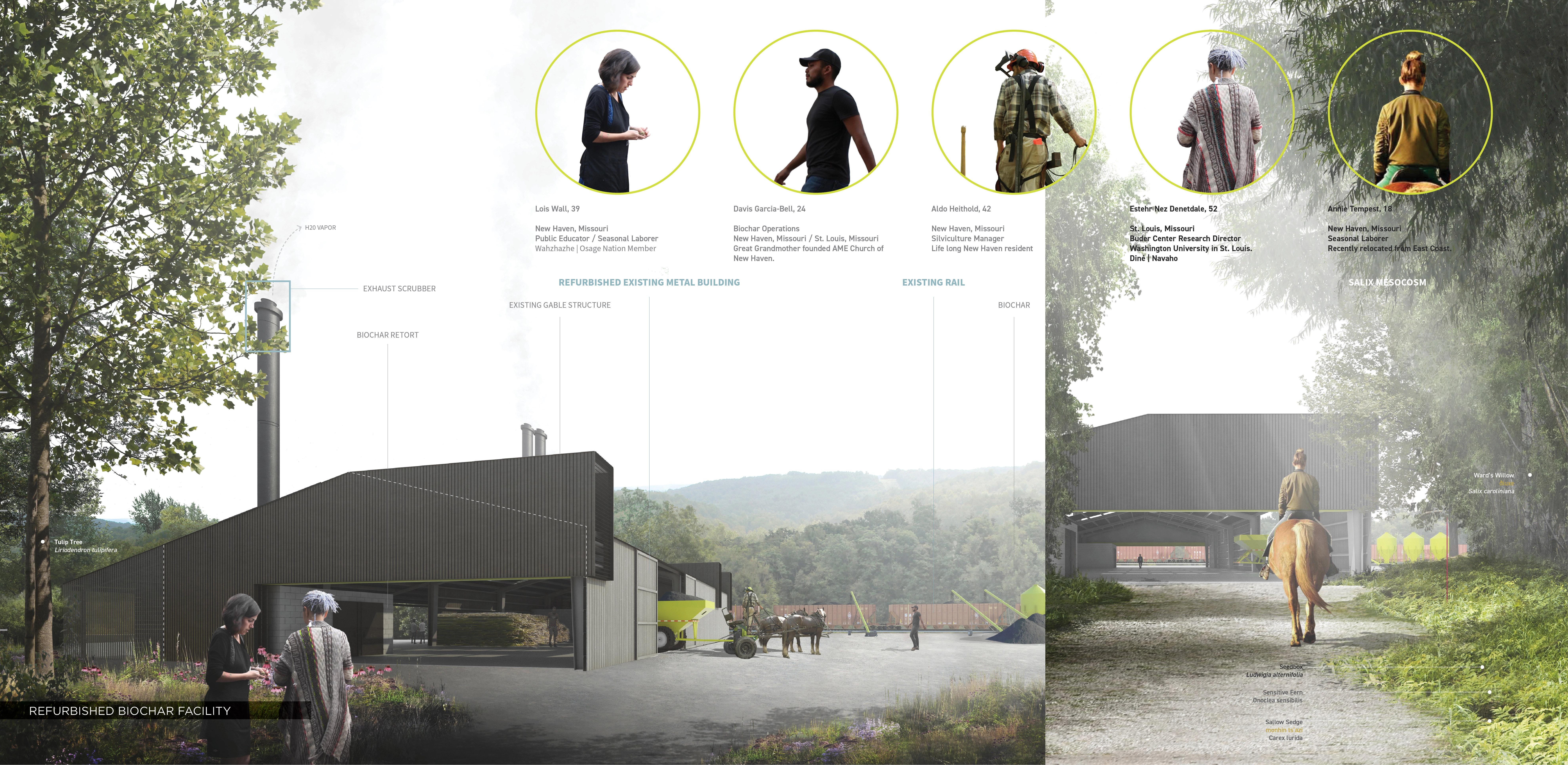 The Willow Resiliency Project proposes a biomass industry cooperative between rural communities and repatriated indigenous populations of the Lower Missouri River Valley. Hybridized program of production, research, and recreation expand the typology of rural public space and create opportunity for unconventional interactions between people, ecology, and place. The project calls for establishing an interspecies salix biomass crop within the river’s flood zone, and has integrated aspirations of ecological restoration, knowledge production, regional economic sustainability, and the advancement of social equity. When harvested and burned in a low-oxygen environment, willow cuttings are converted to biochar, a soil ameliorant that sequesters carbon, benefits agricultural crop yields and reduces irrigation demands in silt / sand soil profiles. In acknowledgment of the indigenous practice of utilizing fire for landscape management, the annual fire-rite festival marks the beginning of burn season and celebrates the interdependent nature of landscape and rural culture in the Missouri River Valley.