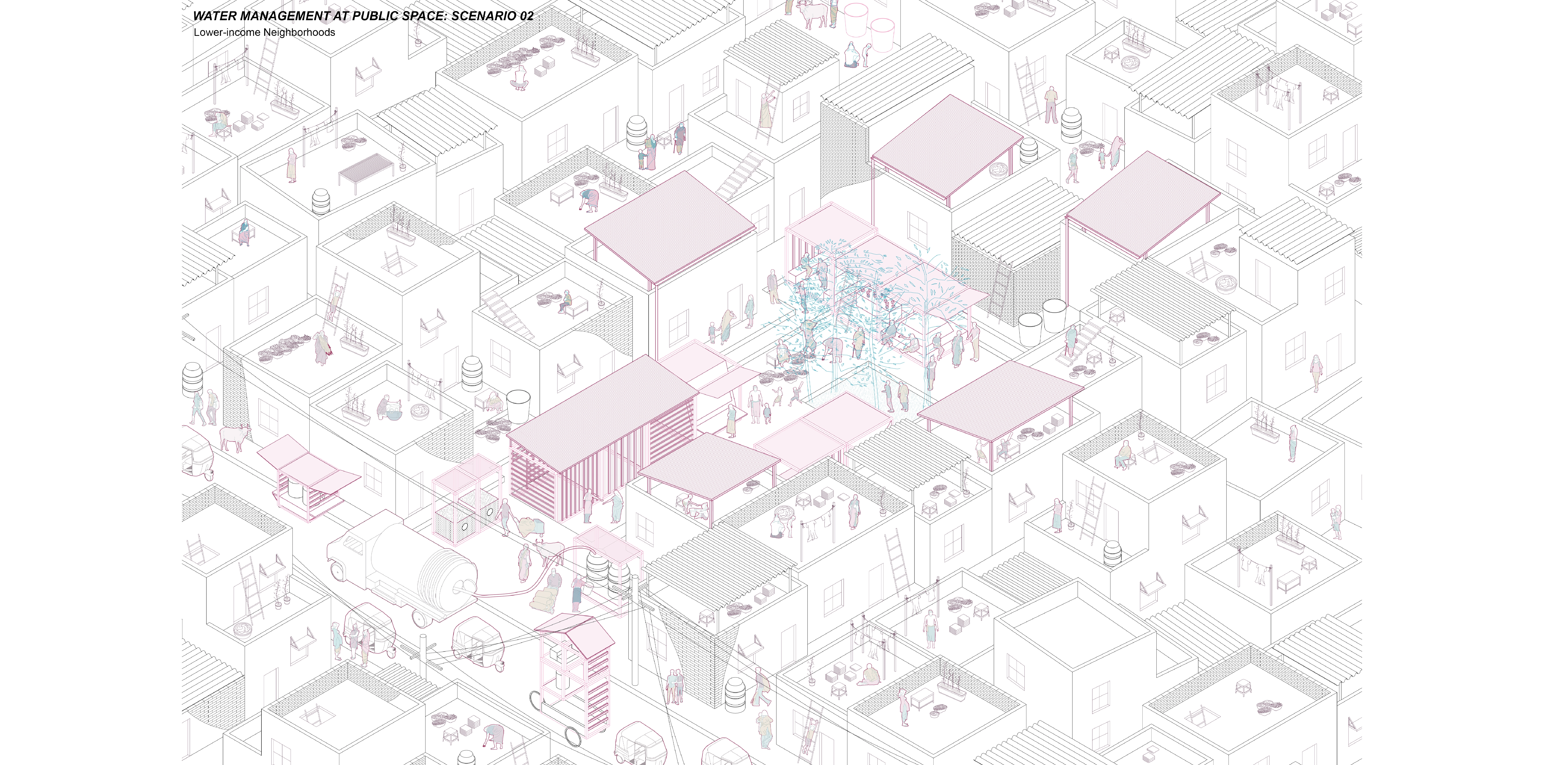 The intervention starts with proposing a system of water supply and disposal network in order to connect households to the city water network, while collected rainwater is stored locally in the neighborhoods and serves only nearby public toilets as gray water.