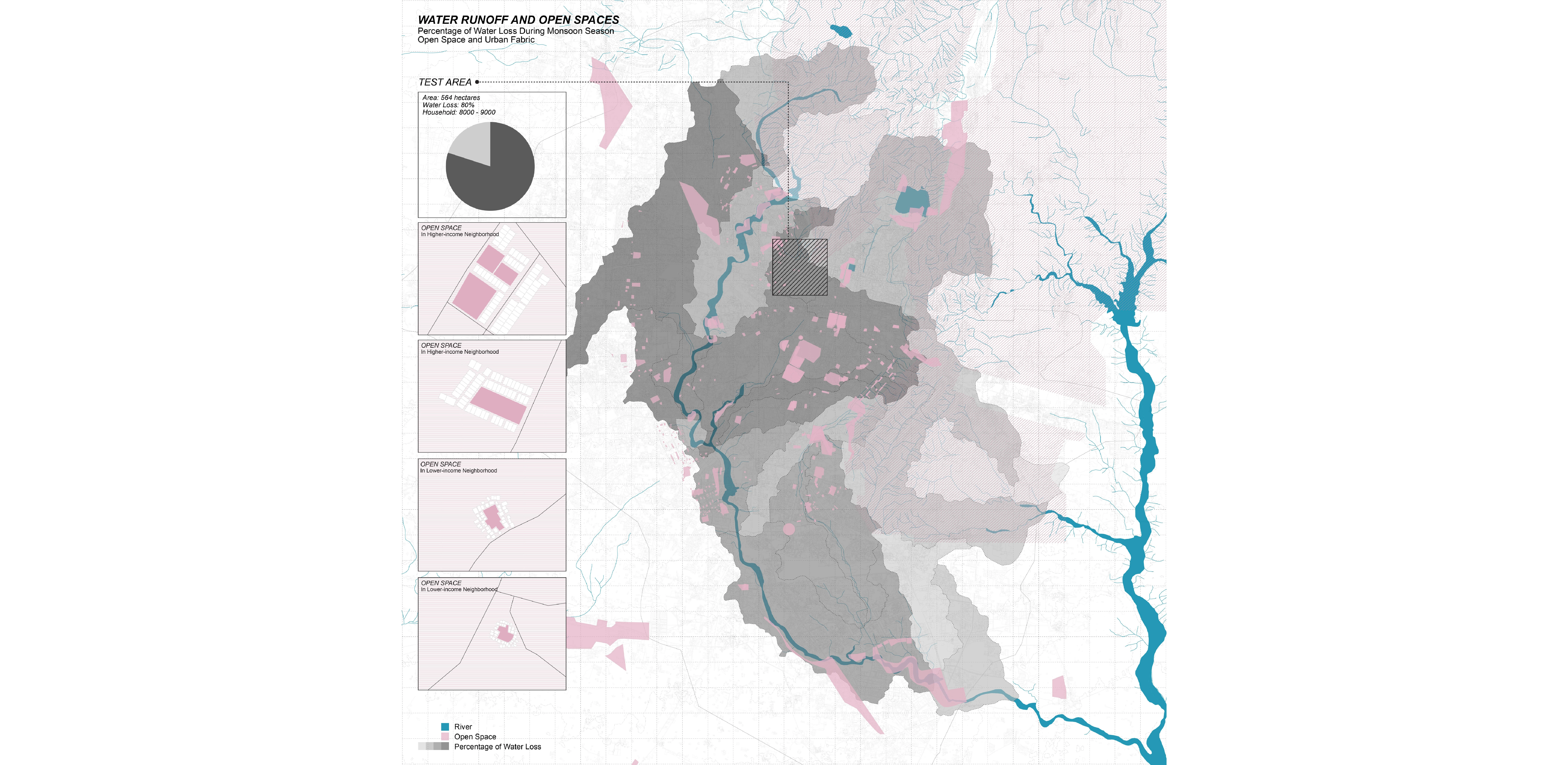 The test area has around 9000 households and around 80% water loss during monsoon seasons because of impervious surfaces. 48% of households do not have access to treated water; 83% of households are not connected to the closed drainage system.