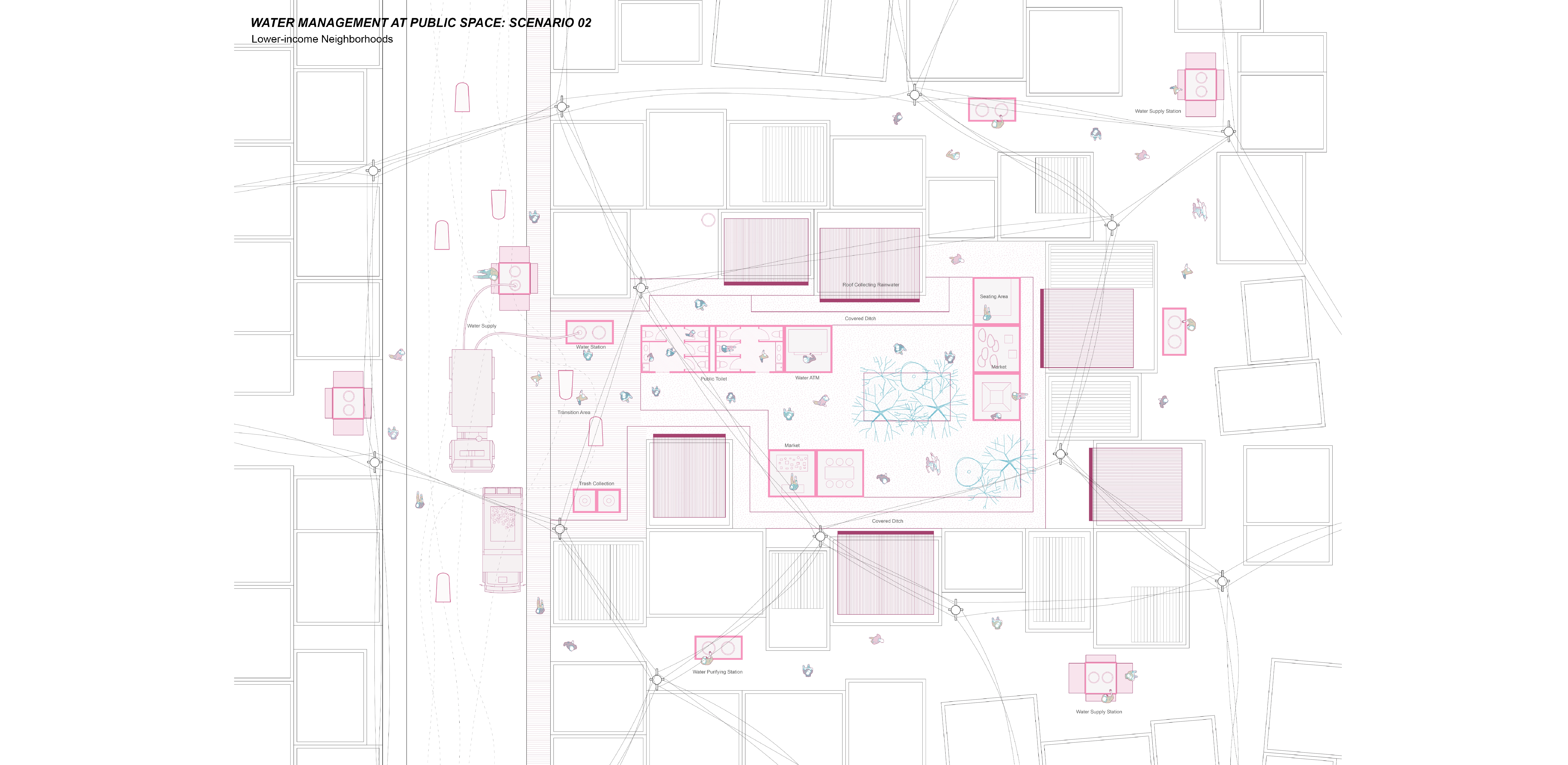 Then, a series of strategies for water management including improving current structures and building new structures are proposed, and these strategies could become a set of toolkits and prototypes that could be applied to multiple places. The whole water lifecycle - fresh water, domestic water use, waste water, and rainwater – are all considered. Prefabricated, light modular structures are inexpensive and easy to be installed at open spaces, and their dimensions are flexible according to different types of public spaces accommodating commercial and recreational activities. Potential programs of public spaces include shading area, market, handicraft studio, water supply station, water purifying station and public toilet, integrating daily activities with water use and sanitation management.