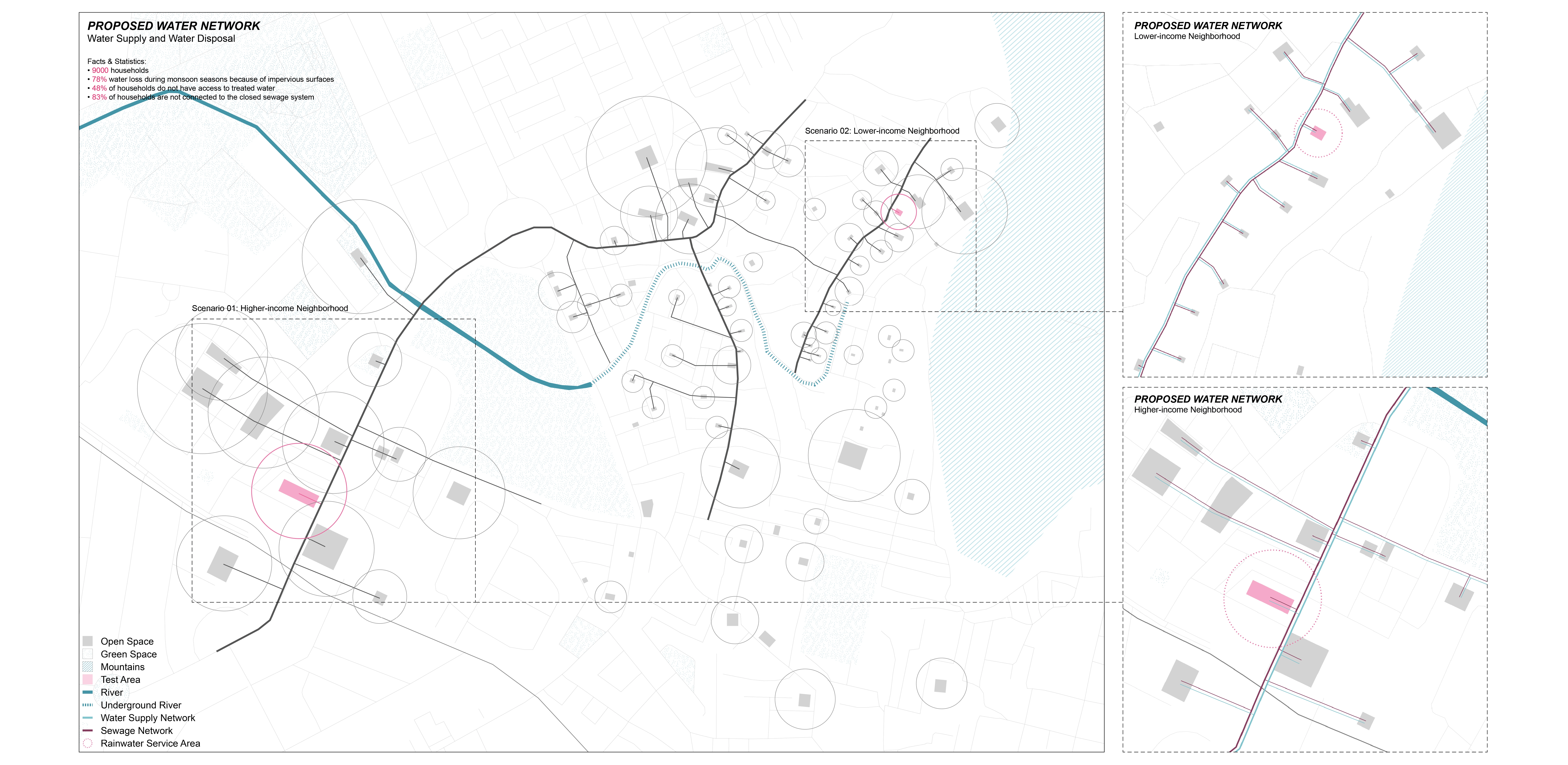 Based on investigations on the current water use at housing, community and urban scale, the project envisions an alternative way to manage the whole water lifecycle including water supply, water consumption, water disposal and water harvesting, by the design of various water infrastructures. These water strategies are combined with public spaces in the community, providing better quality of public spaces while giving visibility to the water process.