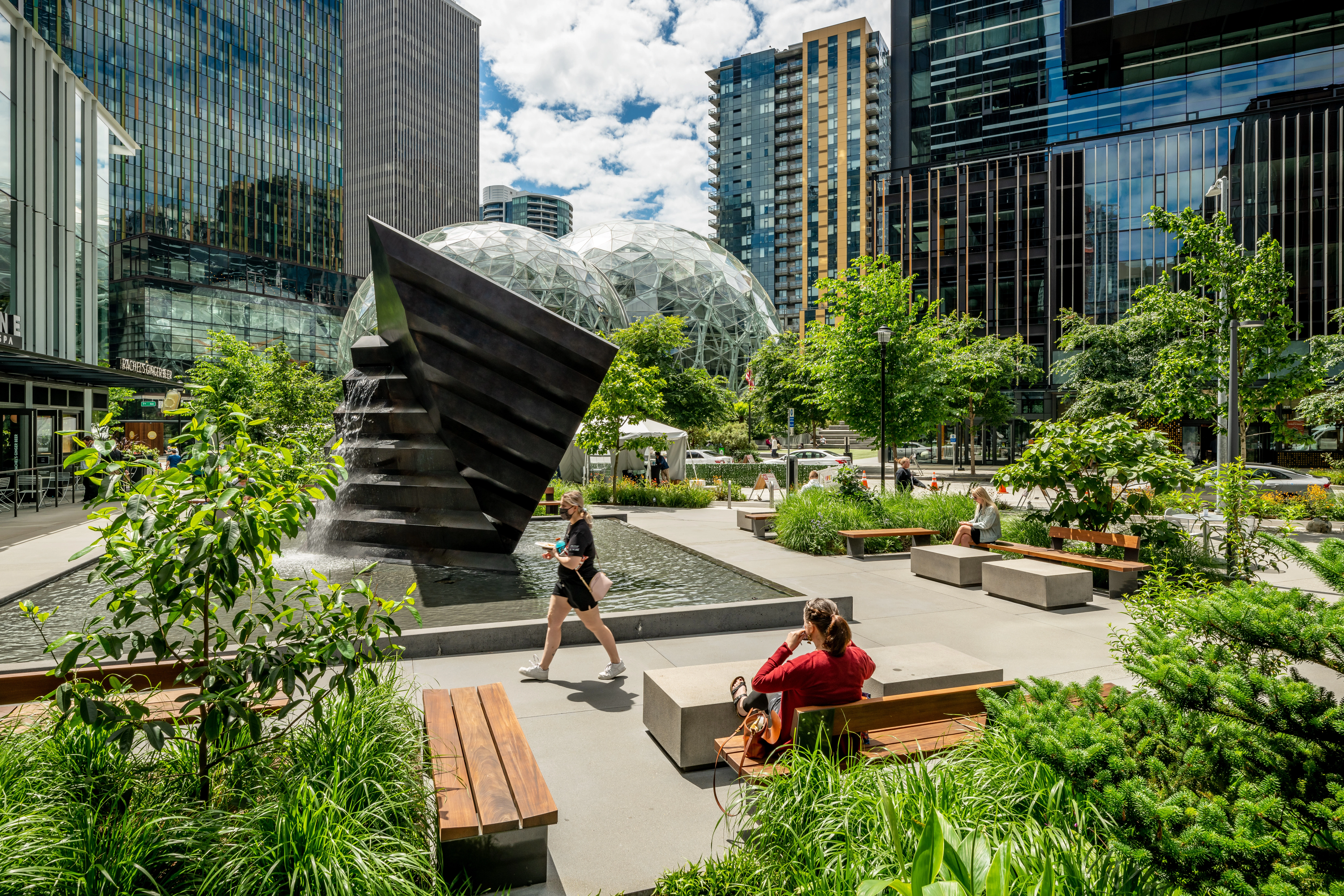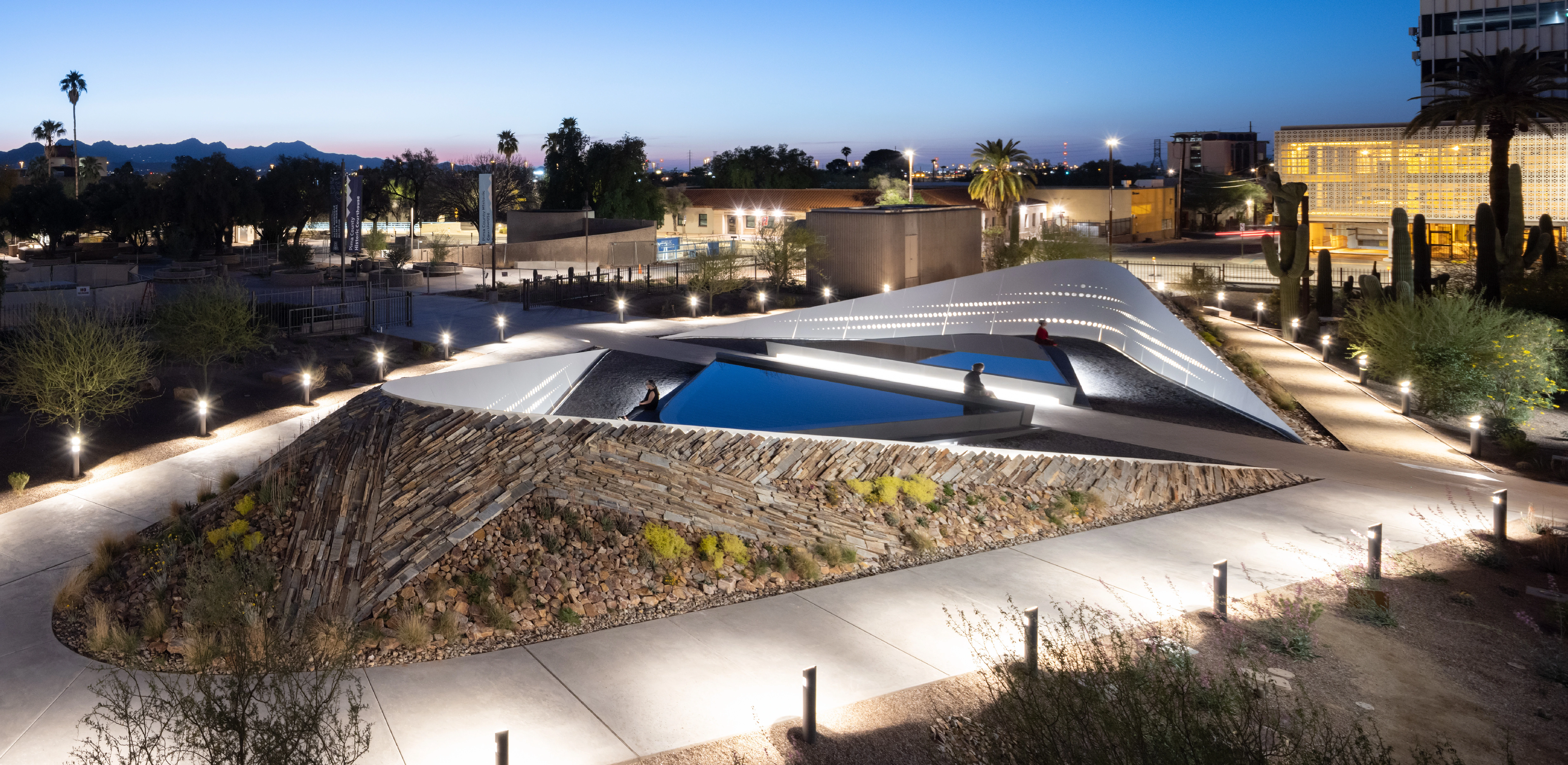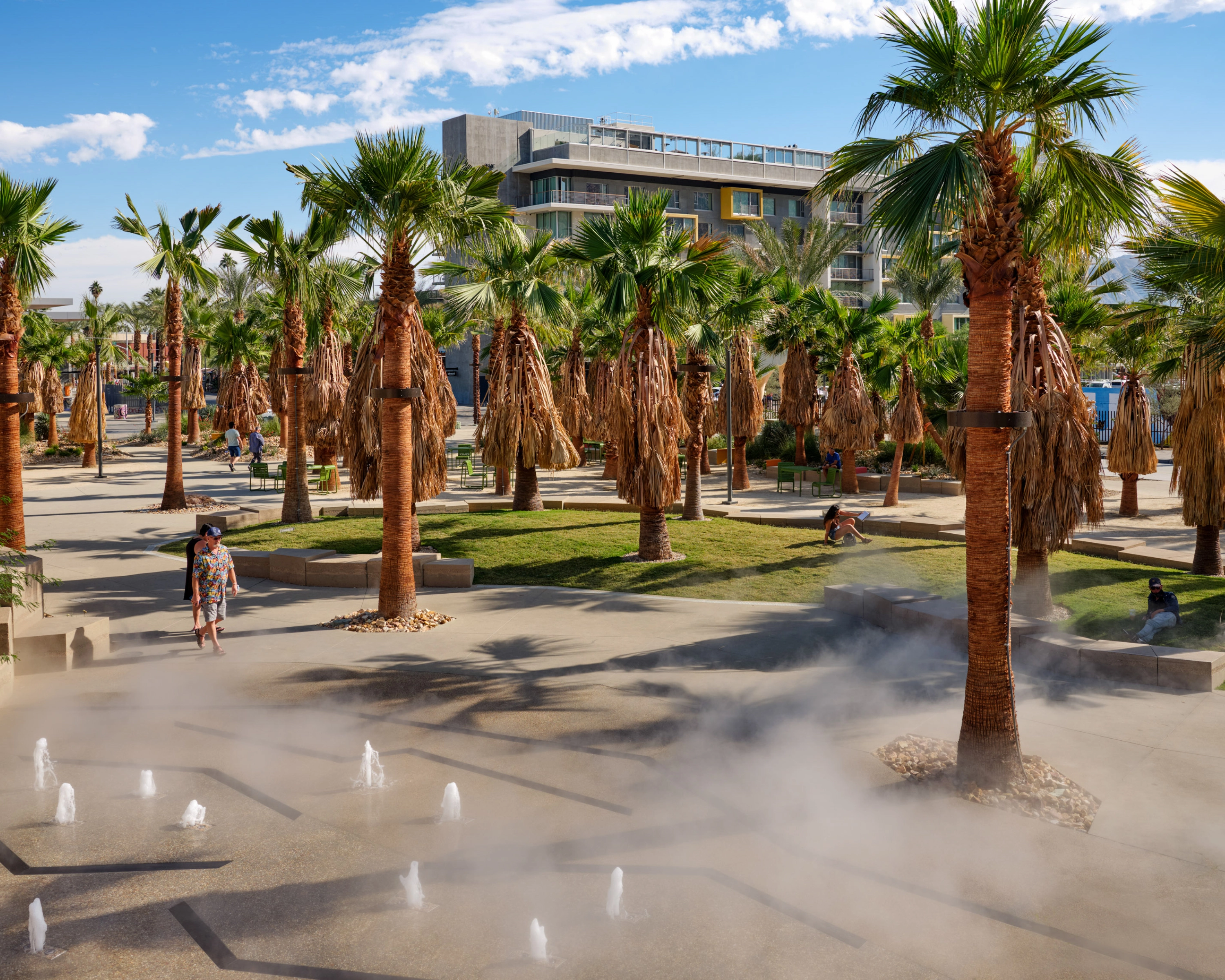 Palm Springs Downtown Park is an inviting 1.5-acre urban oasis for residents and visitors to Palm Springs, a design-forward desert destination nestled along the base of the San Jacinto Mountains along the southwestern boundary of the Coachella Valley in California's Sonoran Desert. The park lies in the ancestral homeland of the Agua Caliente band of the Cahuilla people who seasonally migrated between the shady palm groves and meltwater creeks of mountain canyons in summer and the hot springs and temperate climate of the valley floor in winter. The park is also located on the historic site of Nellie Coffman’s Desert Inn. An early booster of Palm Springs, Coffman stressed the space, stillness, solitude, and simplicity of Palm Springs. Nellie’s “four S’s” would inspire the park’s design, which amplifies the intrinsic qualities of this extraordinary place to immerse visitors in the multisensory beauty of the desert and celebrate Palm Springs’ legacy as a destination for health, nature, and pleasure seekers. The park is made up of three spaces: the Palm Grove, the Outcrop, and the Theater.