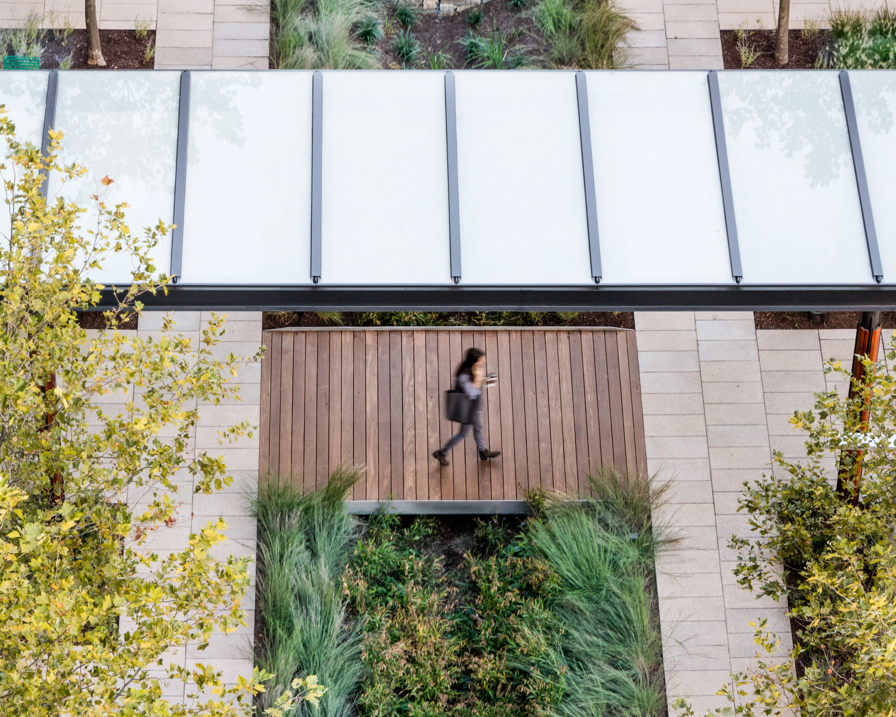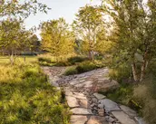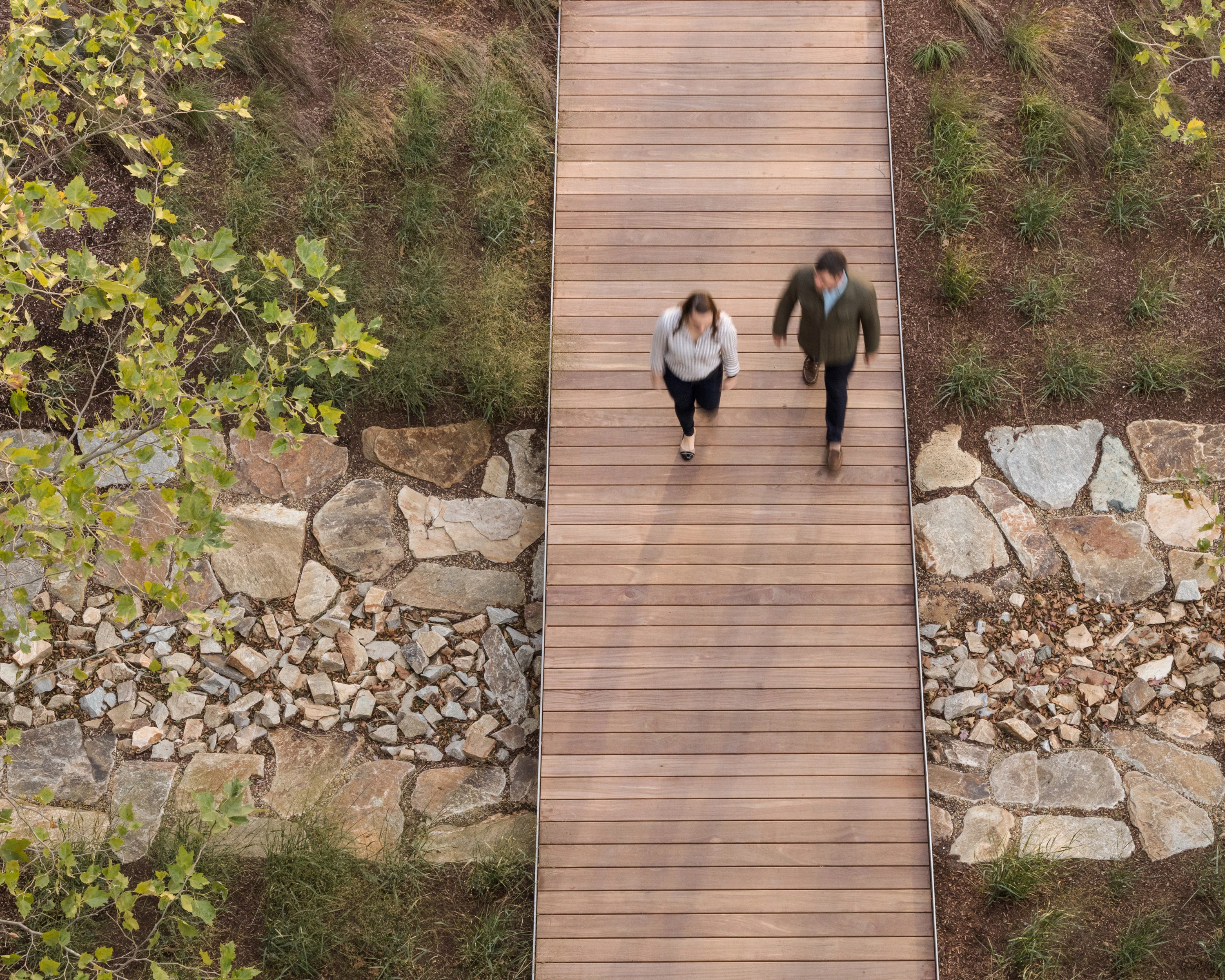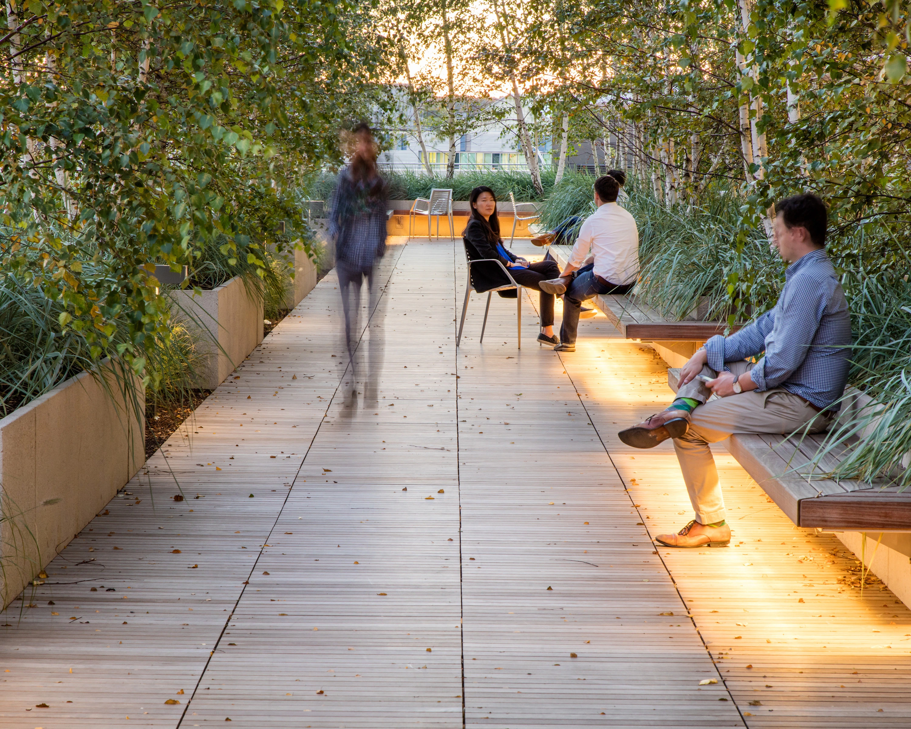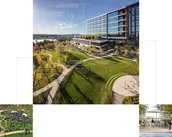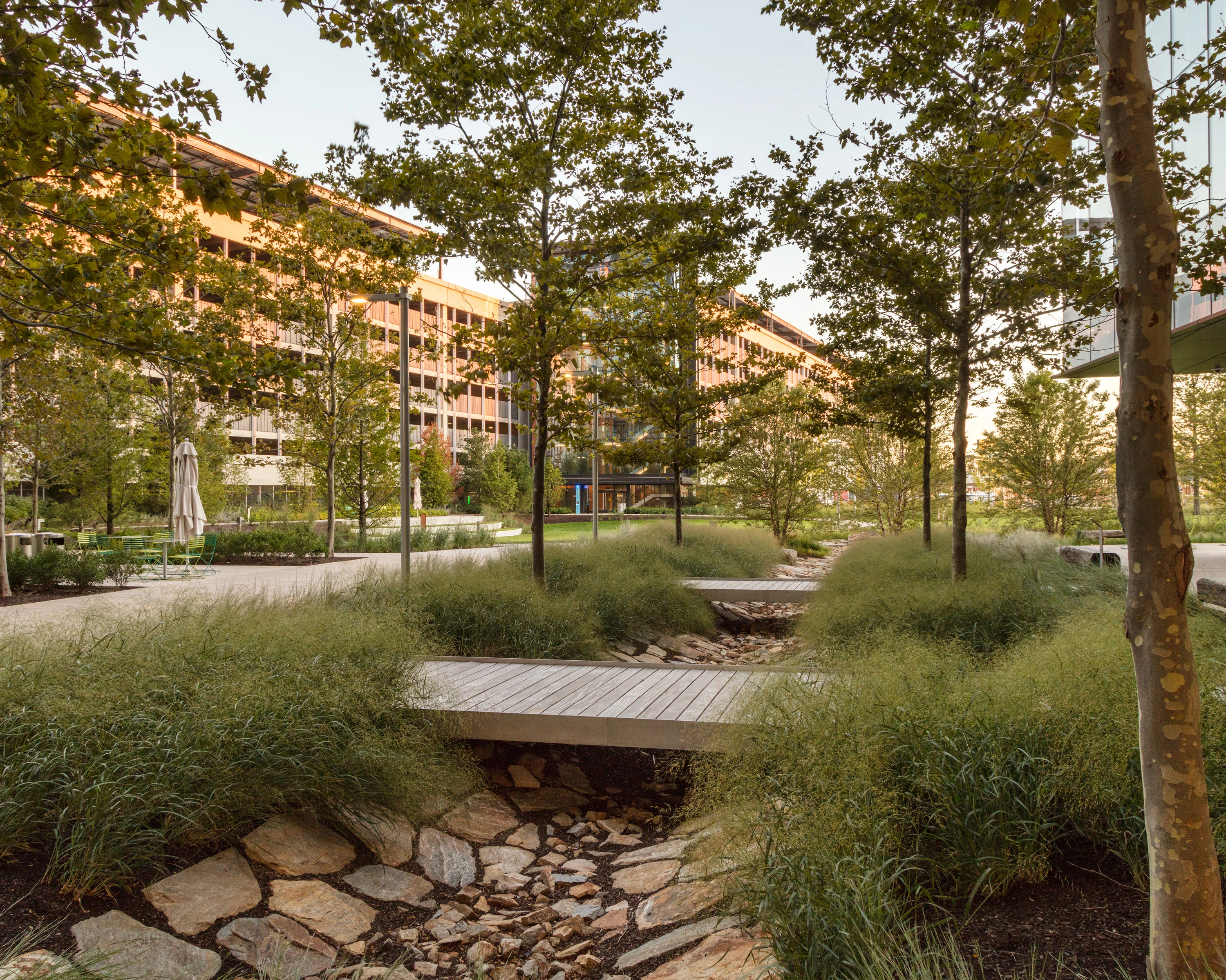 The construction of MassGeneral Brigham’s Administrative Campus, the region’s largest healthcare provider, provides a consolidated campus for the state’s largest employer, and an anchor in the burgeoning district of the city. The campus establishes a socially and ecologically sustainable locus within the 45-acre mixed-use transit-oriented development, Assembly Row. The former 9-acre brownfield site is reimagined as an open campus that serves the organization’s 4,500 employees and extends outward to welcome the growing mixed-use community within the district. The landscape architect made this unique arrangement possible by developing a range of formal to informal spaces, establishing an atmosphere of work, play, and community. Formal gridded courtyards facilitate clear indoor-outdoor connections that transform into winding paths and groves of trees that lead guests to a natural realm, all within the same campus. By using a combination of geometric and organic forms, native/adaptive plants, and local, sustainable building materials, the contemporary campus is at once a reflection of its New England context, as well as a new interpretation of a shared landscape experience.