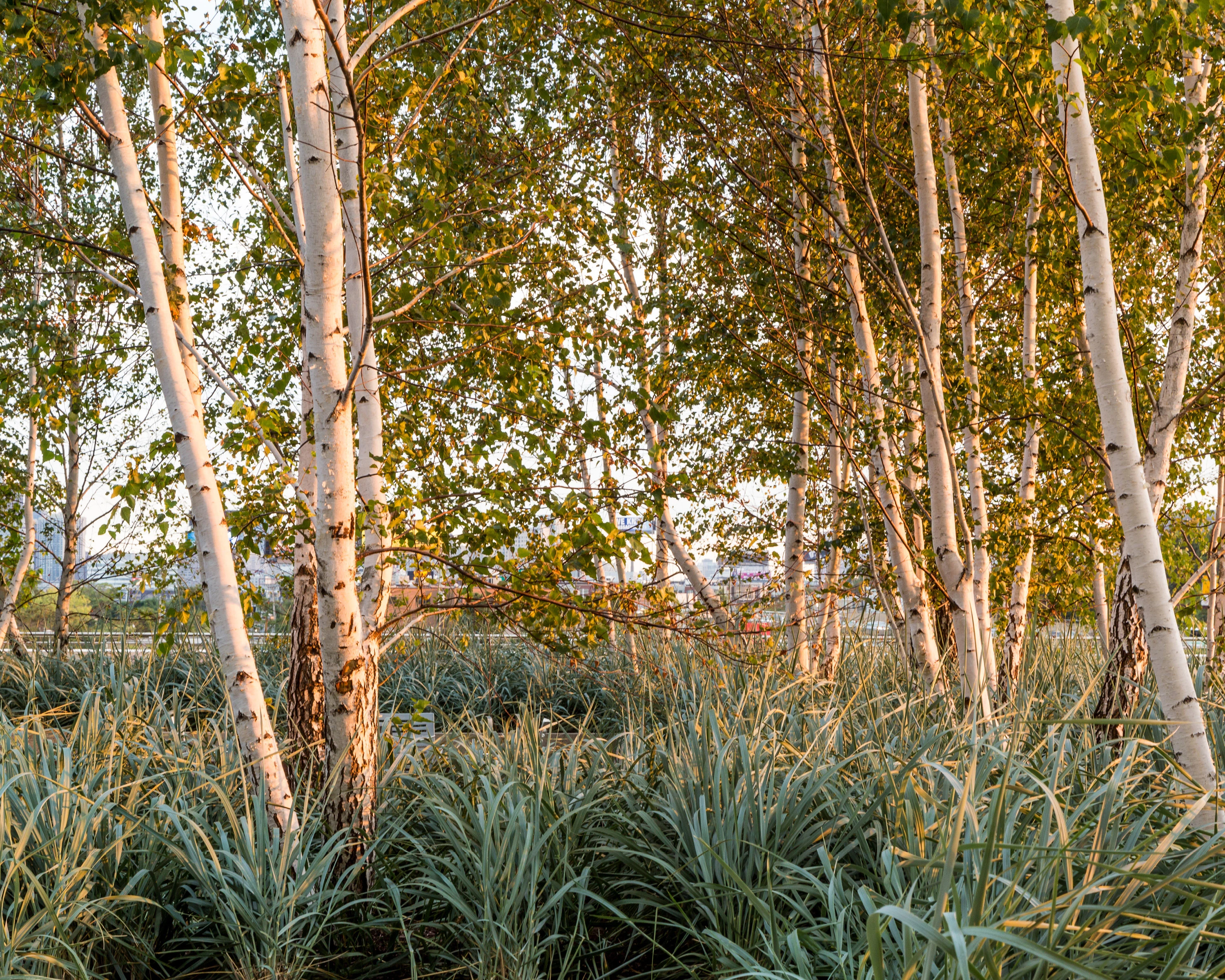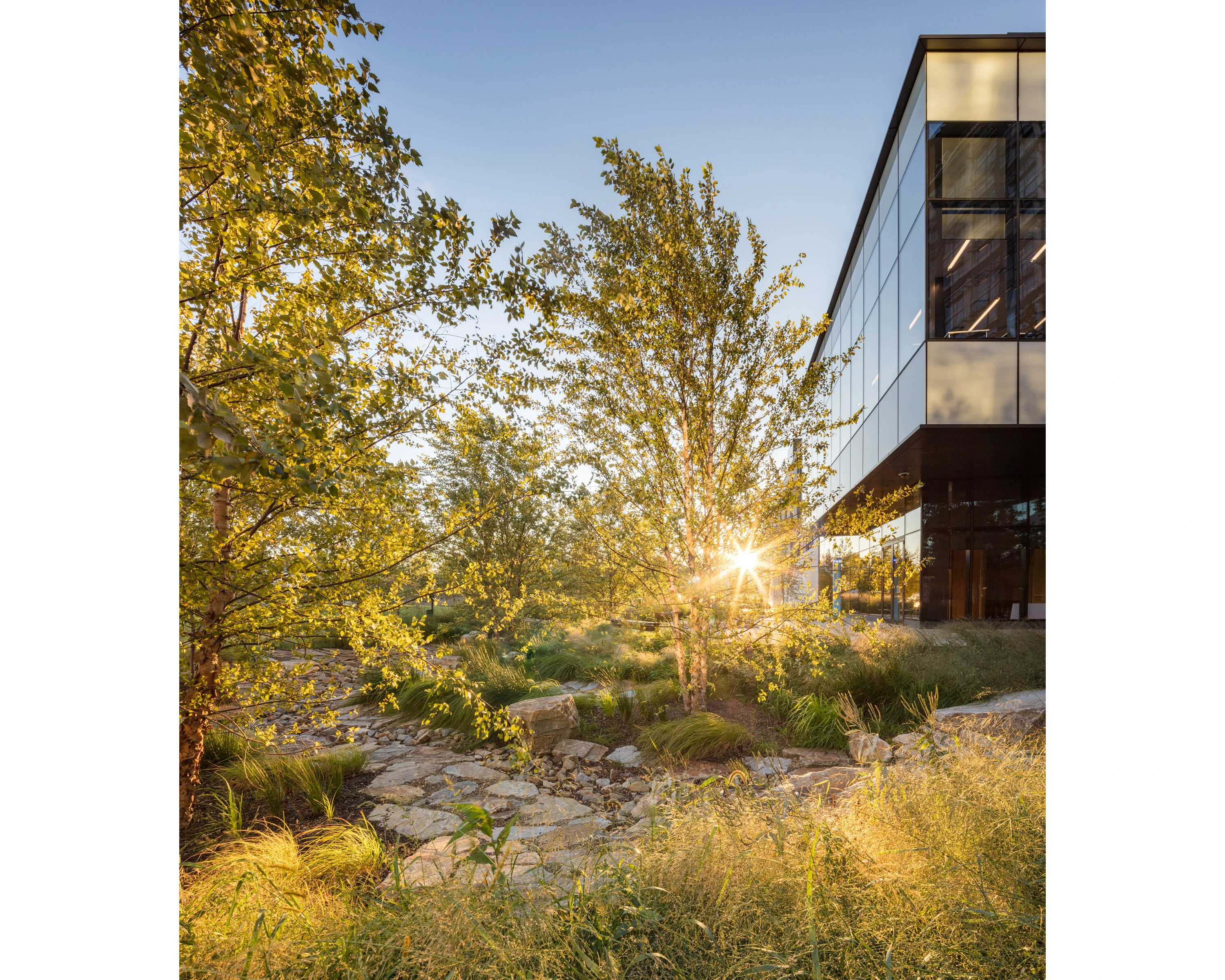 MassGeneral Brigham is the largest employer, hospital network, and physician’s organization in Massachusetts. The organization sought to consolidate its administrative operations into one location to better serve its subscribers and create a cohesive campus built on wellness and cooperation. The goal for the landscape architect was to provide a series of outdoor spaces that would scale with a new 850,000-SF building, and fuse the landscape with the transit and development influences that would continue to draw new residents and visitors to the district. The campus is located in Assembly Row, a 45-acre mixed-use transit-oriented development in Somerville, MA redeveloped by Federal Realty Investment Trust. Prior to redevelopment, the site was a Ford Motor Company assembly plant and one of the region’s strongest industrial employment centers. After the failure of Ford’s Edsel Division and the construction of nearby highways, the area fell into disrepair and saw little activity until the City of Somerville’s push for urban renewal. The client found the site attractive because it provided an array of amenities for its employees to live, work, and play. To the north, the site is adjacent to the high density, mixed-use residential complex of Assembly Square. To the east, the campus is adjacent to the Assembly Row T station and a shared use path to Boston, both encouraging commuters to use public transit or bipedal transportation. The campus’s direct connection to the train station allows the campus to act as an urban portal for visitors to flow through. Despite its highly programmed adjacencies, the site had many physical challenges. Its proximity to the Mystic River, the Boston Harbor, and the Amelia Earhart Dam subjected it to risks of sea level rise and strong onshore winds. The Northern Expressway and nearby train tracks generated significant amounts of noise pollution. Since the site was originally purposed for industrial use, the landscape architect also had to address existing brownfield conditions. These site challenges pushed sustainability and resiliency to the forefront of the landscape architect’s design priorities. The design team spent months studying NOAA data of the area’s tidal changes and sea level rise projections. In partnership with an environmental consultant, the team conducted noise, sun, and wind studies to inform the design. Significant soil and ground improvements had to be made, including the removal of 3.5 feet of contaminated soil off-site. To prevent fresh soil from settling, piles were drilled 60 to 80 feet into the bedrock and filled with compacted gravel. The entire site was then capped with fresh soil to appropriate elevations that would provide resiliency to the building from the potentials of sea level rise. The landscape architect addressed other site challenges by creatively incorporating functional and sustainable green infrastructure into the open spaces. The stormwater management system features a rain garden, detention ponds, and a large bioswale that overflows into a dry creek. Altogether, the stormwater infrastructure captures 100% of stormwater on-site. The thoughtfully conceived planting design places trees and plants in critical areas to mitigate wind and noise. A linear grove of trees located at the building’s entryway portal combat 17 mph winds from a funnel wind effect. Groves of trees line the site’s open perimeters to reduce nearby street and transit noise. Overall, the design created over 1.8 acres of permeable surface and added 333 trees that sequester approximately 40,000 pounds of carbon annually. The landscape architect made a conscious effort to design these sustainable elements attractively. The sustainable hardware features are visible in the design to enhance the overall aesthetic and character of the site, as well as encourage everyday guest interaction. The rain garden, outfitted with native coastal plants, prominently intersects the formal courtyard and the connecting path between the building and parking structure. The bioswale and dry creek are created with local New England stone, and its design transitions from a structured trough that mimics the revetment stone of the nearby Mystic River into a natural, winding creek shaded by River Birch. The large detention basins blend into the 2.5-acre event lawn and complement the space’s varying elevations. Even the custom benches are made from reclaimed wood, salvaged from the client’s Charlestown site and restored to expose their natural grain. Signage around the site accompany these sustainable features and educate guests on each element’s contribution to sustainability. The client’s commitment to sustainability was not only environmental, but also social. Much of the site’s open space and even the building’s conference center is open and free for public use. The ground floor of the building’s northern edge features retail space that parallels the Assembly Square development. To bring this public-private campus to life, the landscape architect performed a range of programming and spatial studies to develop the appropriate private, semi-private, and public amenities. The design had to consider to two very different guest experiences: the 4,500 employees who use the site daily and the visitors who pass through or live nearby. The design solution achieves this by contextualizing each space with the appropriate privacy level and its intended use. Private and semi-private courtyards are work-enabled spaces designed formally on an architectural grid to promote inside-outside connections with the building. In contrast, the streetscape, open event lawn, and fitness trail are outward facing, porous, and informal, designed to encourage visitors to wander and stay outdoors. The sinuous fitness trail loops around the lawn and guides guests on a journey through groves of Maple, Gingko and Redwood. The event lawn hosts company and community events throughout the yea