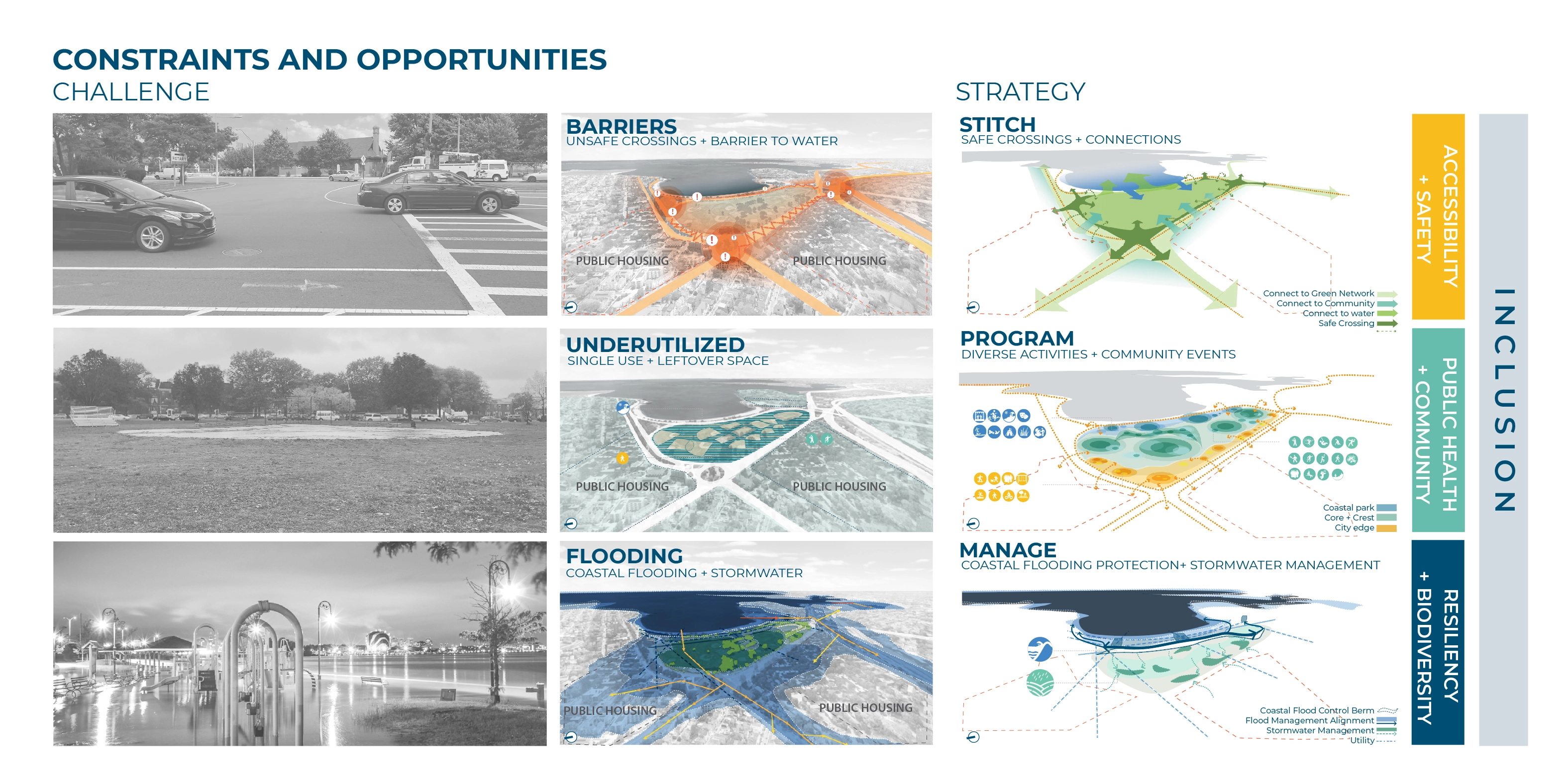 As Boston’s largest waterfront park, the renewed and reprogrammed park will form a resilient buffer between rising seas and adjacent residents, and a new link that connects the Emerald Necklace to the harbor. Recreational capacity will be increased through stormwater management on frequently flooded fields along with new programming such as adventure play, community gardens, barbeque areas, and a community resource center. The inclusion of underserved groups and special interest groups in the process was lauded as “exceptional” by the jury.