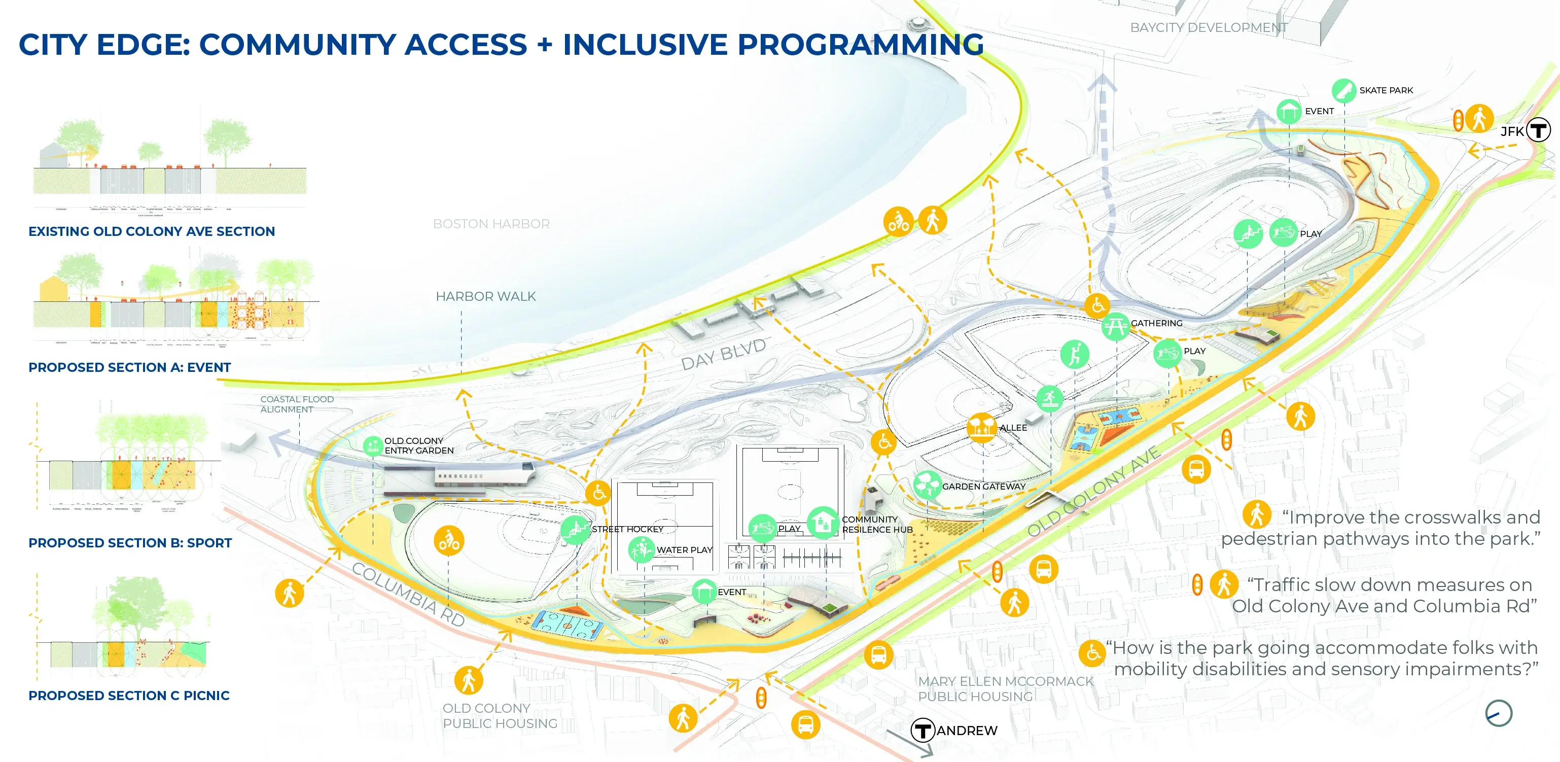 The reimagining of Moakley Park represents Boston’s greatest open space investment since Olmsted’s Emerald Necklace. As the city transforms its relationship to its Harbor–rediscovering it while simultaneously preparing for sea level rise–Moakley will play a key role as Boston’s largest waterfront park, and a new link that connects the Necklace to the Harbor. The plan responds to pressing needs by addressing climate change, biodiversity, inclusion, and access. The future park will be a resilient open space that protects residents while connecting Boston to its greatest natural resource, the Harbor. The renewed and reprogrammed park will serve a broad audience from the immediately adjacent neighborhoods of Dorchester, Roxbury, and South Boston, all of which are currently lacking in open space. Accessible by transit, Moakley Park is also poised to become a beachfront destination for all Bostonians, in a city where everyday interactions with the waterfront are rare. In addition, the park will form a resilient buffer between Boston Harbor and two major public housing developments, Mary Ellen McCormack and Old Colony Houses, protecting these from flooding for the coming decades. As the surrounding neighborhoods gentrify, the preservation of these complexes will be essential to maintaining a diverse community at the heart of the city. Within this context, thoughtful and inclusive communication and engagement were essential to the planning process. The team also chose to prioritize design strategies that will attract the broadest possible audience to the park and serve the needs of diverse residents–sending a clear signal that the park is for everyone. Stakeholder and Community Involvement The goal of attracting new and diverse users to the park was a major driver of the public engagement process. The team formed critical partnerships to expand reach, including with the non-profit Boston Harbor Now, as well as community leaders representing organizations such as the South Boston Neighborhood House. Prior to COVID-19, the foundation of the engagement strategy was Community Open Houses and on-site events, including ‘Discover Moakley!’–a daylong community event organized to bring fun and energy to the park with local vendors, an activated street, and booths for community input and resiliency education. These efforts were amplified with digital and physical surveys, one-on-one interviews, and mapping activities; this allowed the team to initiate conversations with community members about how the park is used, and better understand their hopes for its future. The pandemic demanded a rapid transformation, pushing the team to generate ideas that in fact expanded the reach of the effort, using strategies such as online surveys, virtual tours, and interactive video meetings. To increase the impact of the plan, the design team also initiated a set of topical meetings focused on climate resilience and economic development to coordinate with ongoing efforts of others working on adjacent properties. These included conversations with developers currently working on the adjacent redevelopment sites at Mary Ellen McCormack Houses and Bayside Expo Center; stakeholders such as UMass Boston, the Massachusetts Department of Conservation and Recreation, and the Boston Planning and Development Agency; as well as other consulting teams working on City-led plans for nearby Morrissey Boulevard and Climate Ready Dorchester. Feedback directly informed the park design–from the number of ball fields, to the location of event spaces, to the types of programming located along the park edge closest to local residents. After hearing concerns regarding the City’s ability to maintain amenities, a monthly park clean-up was initiated by Boston Harbor Now, Parks staff, and the design team. These early efforts have already been met with appreciation and even participation by some volunteer community members. Climate change, resilience, and sustainability Originally a salt marsh and mudflat, Moakley has been unofficially used for recreation since 1909 when it served as first a garbage dump and a playground. Filled in 1919 with harbor-dredged clay, the site’s flat, impermeable soil already presents problems today, as mild rain events often cause flooding and leave recreational amenities unusable. To address infiltration issues, the plan proposes to incorporate green infrastructure strategies across the site, including stormwater meadows, corridors, tree trenches, and porous pavement. The park’s existing flood issues proved to be a useful entry point for the design team in communicating the need for long-range flood protection and stormwater management to the community of current park users, who have already experienced their impact. On a longer-term timeline, sea level rise projections predict a 21-40” water level increase in Boston Harbor within 50-60 years. At the top of this range, floodwaters entering through Moakley in a 100-year storm would join two other flood pathways, not only inundating the adjacent housing complexes but also sending water deep into Boston’s South End. The plan proposes an engineered flood-protection wall which is embedded into the park’s topography and programming such that it doesn’t cut the community off from the waterfront–for instance, one segment of the wall serves as an amphitheater seating space with views to the water. At the coastal edge, restored dunes will soften the impact of wave action and provide essential habitat. This coastal edge is an exciting and challenging landscape, forcing the team to consider successional growth, rising groundwater, and saline inundation over time. It also presents an opportunity to increase biodiversity: the plan proposes introducing over 500 new trees that will contribute to heat reduction and the health of Boston’s urban forest, alongside a mix of native plants including coastal marsh species, maritime shrublands, and woodland