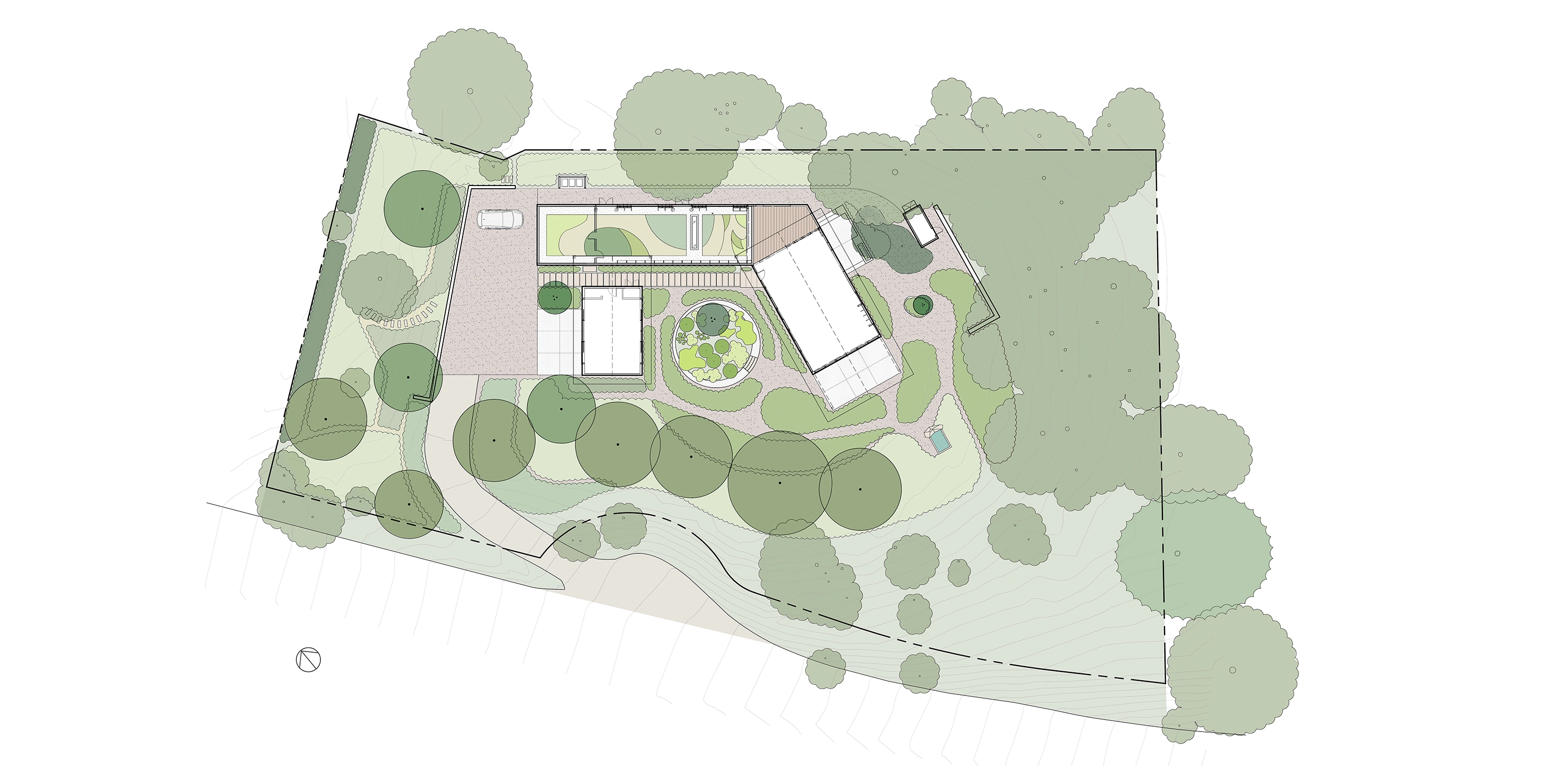 REQUIREMENTS AND SCOPE: A one-acre property was designed in conjunction with the demolition of an existing home and the construction of a new single-family residence, designed as three connected buildings. The site is on a gentle slope, on the edges of a 90-acre regional preserve of rolling oak woodlands in the San Francisco Bay Area’s western mid-peninsula. The previous home had a larger footprint and contained an asphalt driveway and cement terraces. The owners wanted to construct a home with high environmental sensitivity that responded to the site character. The clients are inventive artists, skilled makers and experienced horticulturalists. Inside their new home of three shed-like structures, the owners asked the architects for spaces dedicated to creativity: studios, a workshop, galleries and an extensive library. Outside, the client desired a native garden, one that would blend with the surrounding open space preserve and be sustainable in design and operation. DESIGN PROGRAM AND INTENT: The project had three main goals. 1. The character of the surrounding oak woodlands open space was to be reflected in the appearance of the property. As a key first step, the landscape architect and architect collaborated on orientating the buildings to both complement and safeguard the majestic oaks, while allowing a wide western view from the home’s two-story glass façade. This deliberate placement allowed the garden space to expand parallel to the oak grove canopy on the property and wrap around the main living level. The landscape architect used naturalistic plant groupings that blend the rectilinear lines of the wood-clad architecture into the surrounding oaks. Textured massings of native ground covers and shrubs spill over winding gravel paths. Rough-hewn stone walls define and extend the architectural space out into the landscape, their pebbly texture evoking natural rock outcrops on the site. The property does not use any fencing, encouraging woodland creatures to find habitat in the garden. The landscape architect designed a naturalistic look at the roofline, as well. A grass garden rests on the central building’s flat roof. Eight grass varieties, native wildflowers and bulbs were selected to show rotating variety in winter and summer months. This roof feature is viewed from the master bedroom deck, glimpsed from ground level, and framed in a focal window in the home’s double-height entry foyer. The roof garden plants, used in a 9-inch-deep tray system, were laid out by the landscape architect in swaths of color and texture. To help the client best observe the plant diversity from the master bedroom deck, the shortest materials are nearest the deck, progressing to the tallest grasses at the furthest end. The roof selections are low maintenance, with drip irrigation used only in summer months, when the temperatures in the area can reach over 90 degrees. 2. The property was to provide the innovative gardener-client places for plant experimentation and collection displays, reflecting the client’s commitment to philanthropy and education in support of horticulture. The client had cultivated an extensive succulent collection, formerly housed in individual pots. Now the collection is showcased in dynamic fashion. From the auto court, the compound is entered through a narrow passageway, which gives way to a dramatic reveal of the succulents in riotous variety, housed in a large, raised sculptural planter in the wide central courtyard. Carved from rugged Tufa Limestone by a sculptor-mason, this stone circle planting bed perfectly captures the client’s interest in both horticulture and artistry. The landscape architect created a zone for the client’s experimentations with native plants. At the property’s southern side, a potting shed is combined with a wide stone seat wall (also in Tufa), designed in wide proportions to serve as a work bench to hold pots and tools. This area is all gravel, enabling the client to dig anywhere to establish planting islands for new native varieties. The intention is for these experimental planting outposts to come and go, with successful trials being transplanted to established garden areas at the site’s broad western side. Nestled in this “plants lab” area, a culinary garden and outdoor grill are incorporated in a board-form cast concrete narrow terrace off the kitchen. 3. The conservation of resources on the property was paramount. Alternative water supplies: The property uses grey water and rainwater harvesting systems for a significant source of irrigation water. Greywater from the home is collected in a 250-gallon above-ground tank, screened, filtered, then pumped into the irrigation system. Rainwater is harvested into a 5,100-gallon underground tank, filtered, then fed to the irrigation system. The first year estimate is 25,355 gallons collected, which covers approximately 13% of irrigation needs for the property. The thoughtful planting design reduced the irrigation consumption to 48% of the total allowed by the County of San Mateo; the addition of the greywater/rainwater reduces the use to 33% of allowed. Minimal grading and thoughtful siting: Due to the strategic siting of the home, grading on the property was minimal. The landscape architect worked closely with the architect when envisioning the placement of the home. The final location of the three structures allowed for key benefits: preservation of a group of Pacific Manzanita trees; establishment of a safe, clear distance from a native oak grove; and creation of the southern experimental planting area, bounded by the low stone seat wall. This wall also serves as a distinct visual boundary between ‘designed space’ and the established southern oak grove. At the property’s opposite side, the north hill required a 4-foot-high retaining wall. This expanse became another opportunity to commission the stone circle’s sculptor-mason to craft a pronounced edge to the constructed lan