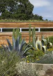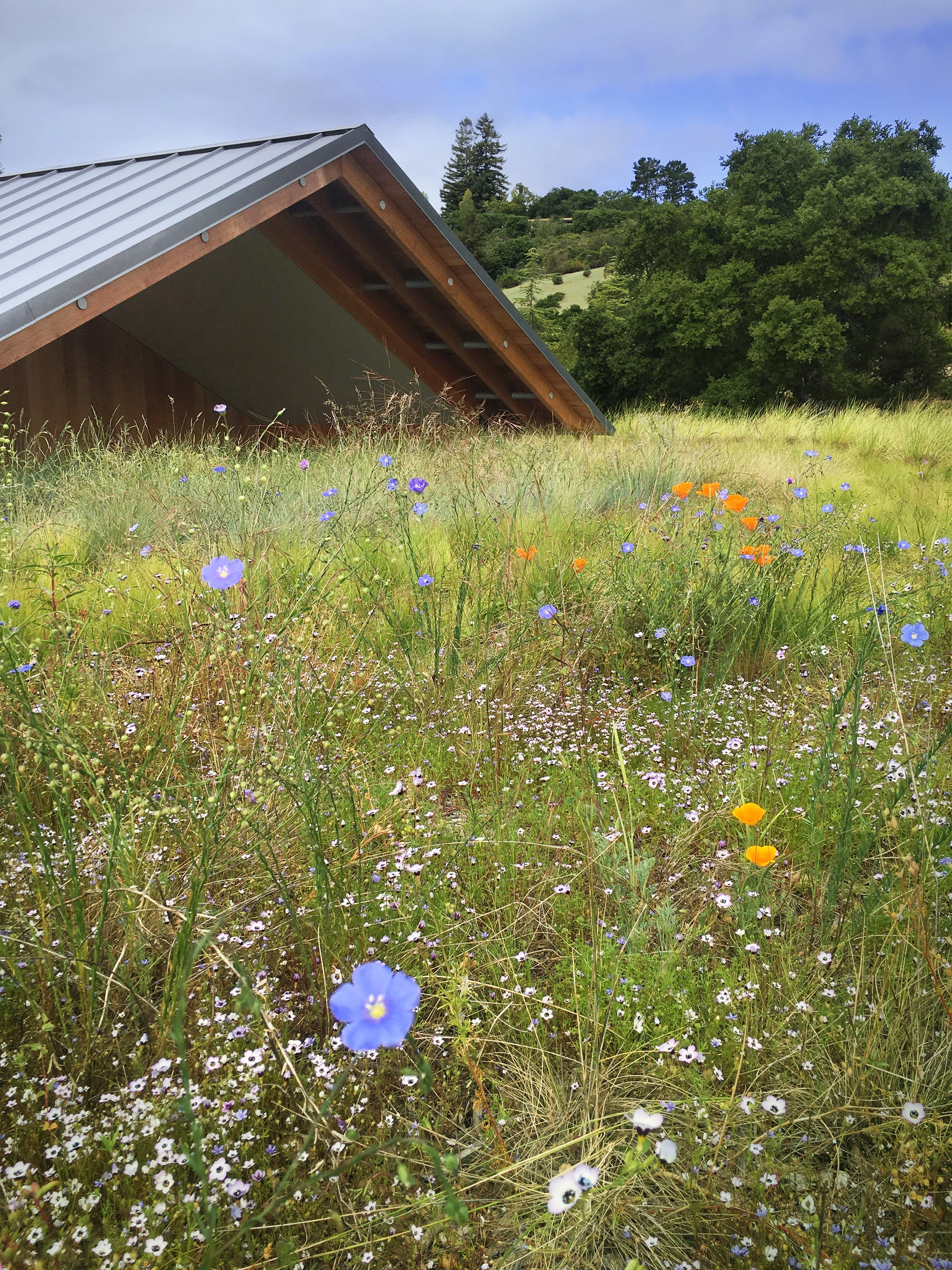 This hillside property evokes the natural character of an adjoining 90-acre oak woodland regional preserve. Eschewing fencing and lawn, the highly-textured design uses native plantings throughout a contemporary compound of interlinked residence and studios. The horticulturist-owner envisioned a landscape that welcomed wildlife, provided habitat and offered an opportunity to experiment with the diversity of regional plantings. Rainwater harvesting, permeable surfaces, drought-tolerant plants and a greywater irrigation system enforce the goal of conserving resources, resulting in landscape irrigation that uses only 33% of its county-mandated allotment. An insulating roof garden of native grasses and wildflowers blends the shed-style architecture to the site. Reflecting the client's artistic interests, a sculptural planting bed of rough-hewn stone frames their extensive succulent collection in the central courtyard. Thoughtful siting preserved a manzanita grove, safeguarded existing oaks, and framed wide views from both winding paths and interior spaces. This property now seamlessly blends with its majestic surroundings at both ground and roof levels, respecting and extending the qualities of the neighboring nature preserve and its pristine California landscape.