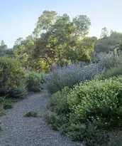 - Shrubs: Heteromeles arbutifolia/Toyon, Prunus ilicifolia/Hollyleaf Cherry, Rhamnus californica/California Coffeeberry, Rhus integrifolia/Lemondade Berry, Romneya coulteri/Matilija Poppy, Rosmarinus officinalis 'Barbeque'/Barbeque Rosemary.