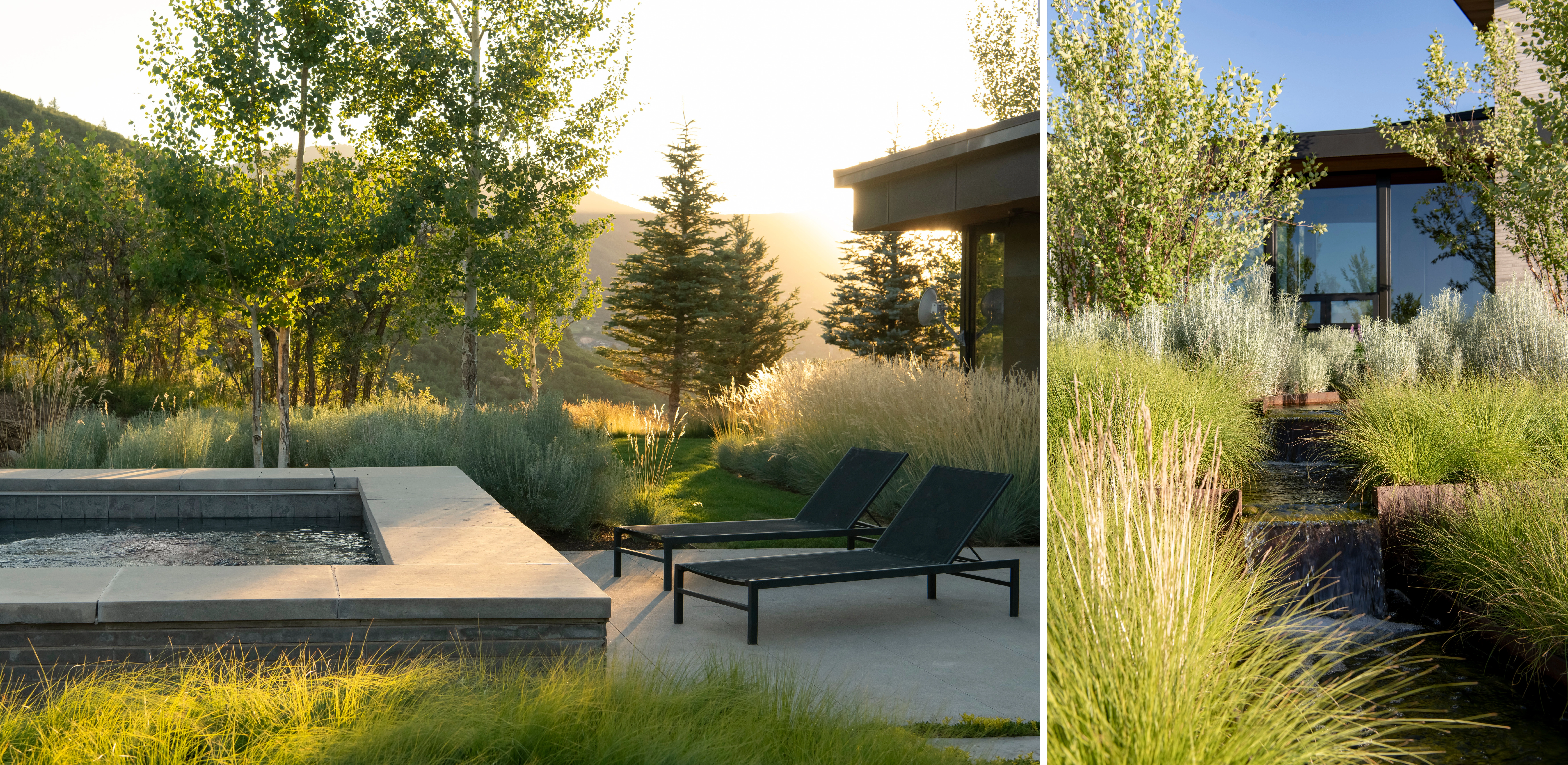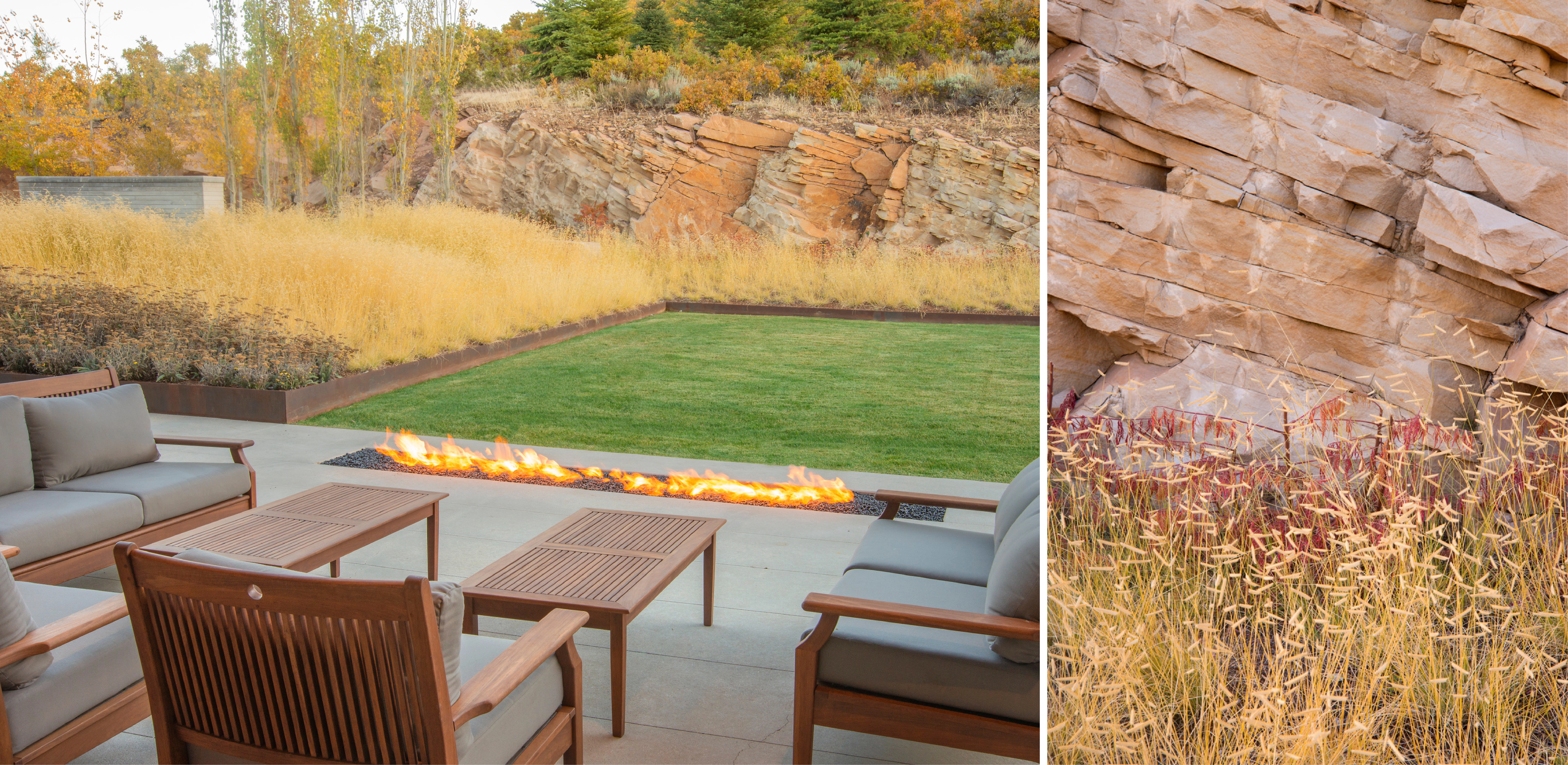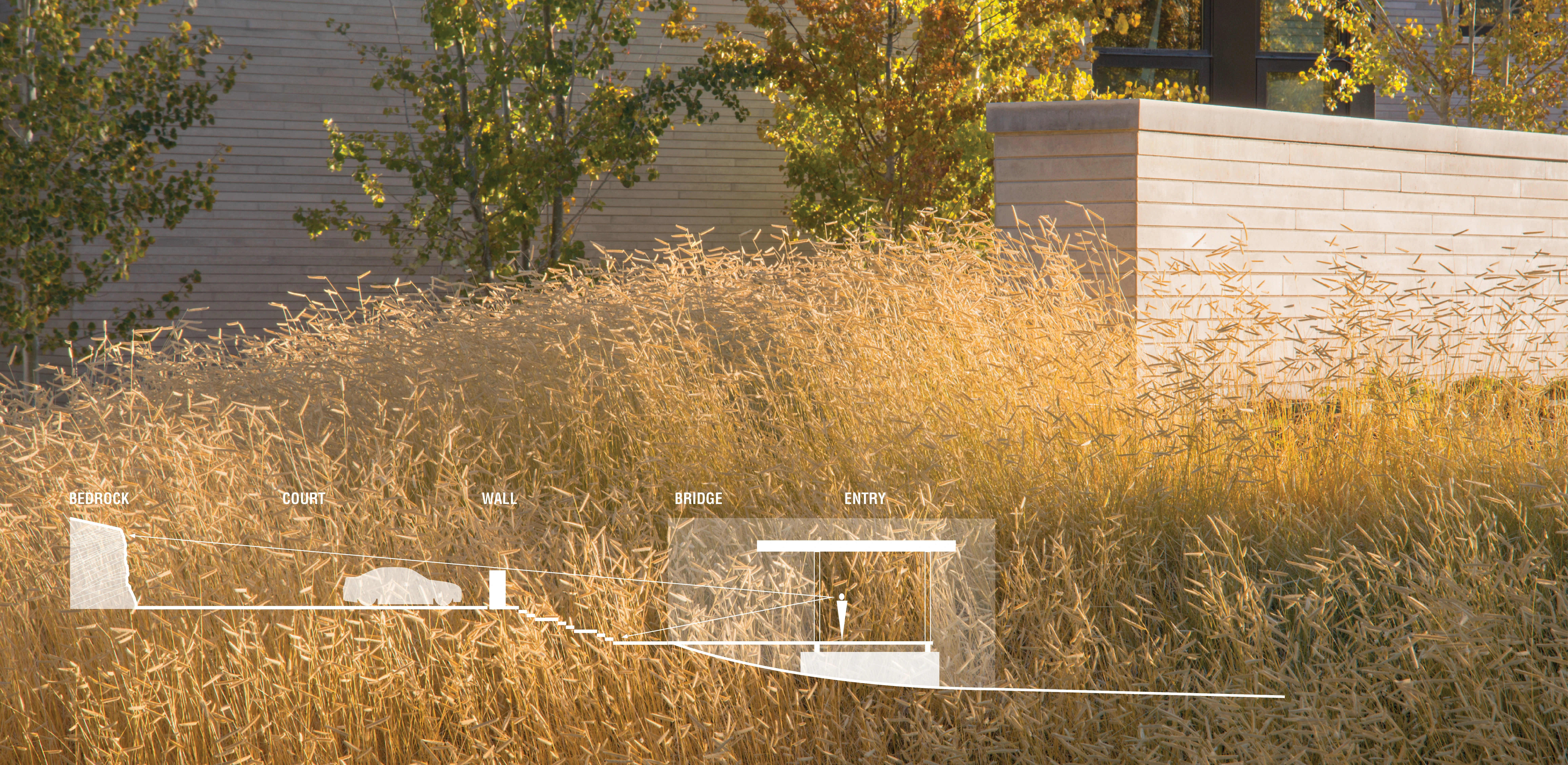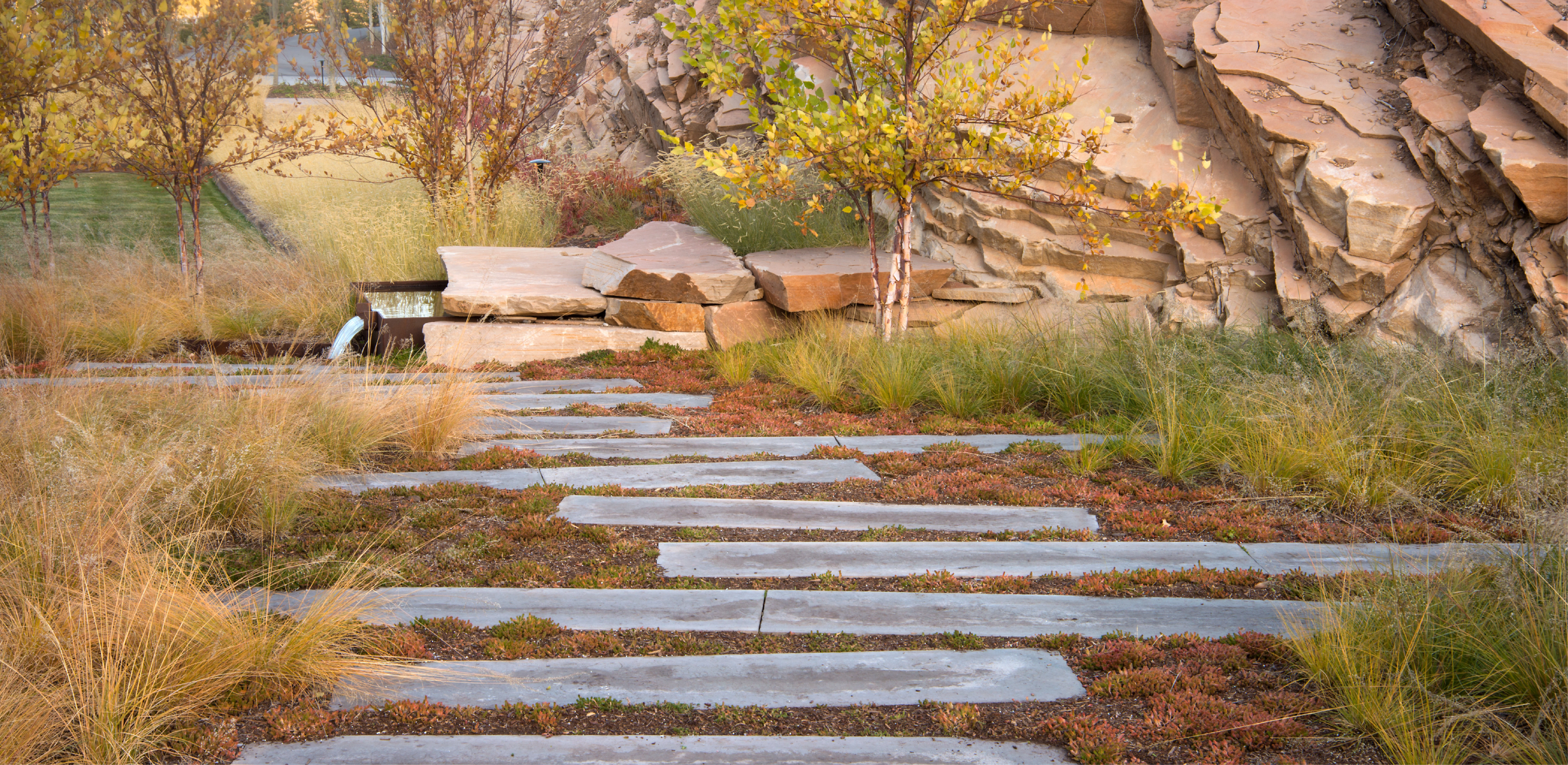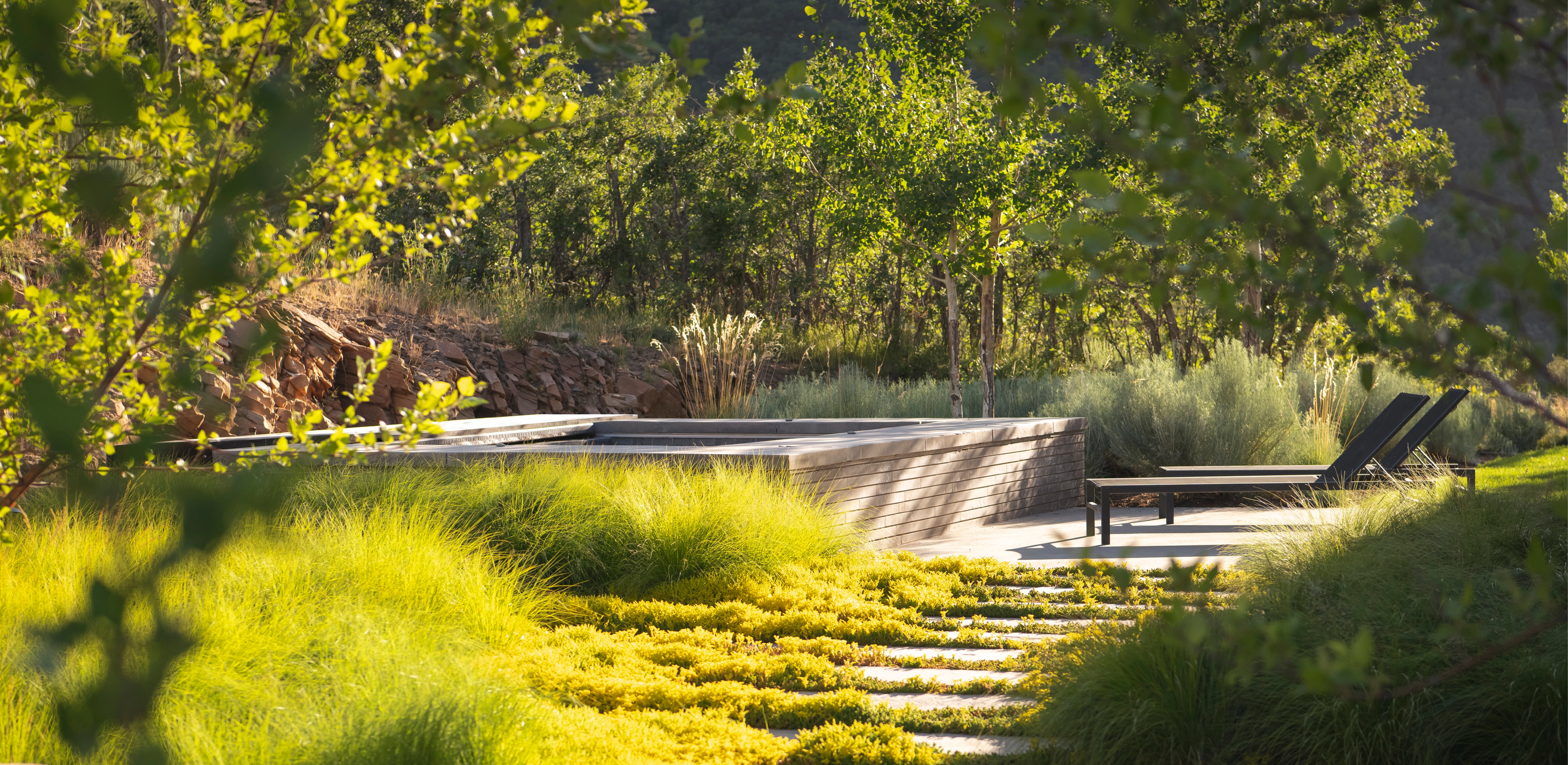 VISION Rising majestically from the Salt Lake Valley in northeast Utah, the Wasatch Range is highly regarded for its access to backcountry skiing, mountain biking, and hiking. These recreational opportunities enticed a family of outdoor enthusiasts to realize their dream of creating a four-season, recreational “base camp” for family and friends. CONTEXT The 20-acre site rests within the Wasatch Back, a distinctive geological sub-formation of granitic intrusions and eroded sedimentary patterns, shaped by powerful natural forces. Situated upon the northern face of a windswept bluff, the site is comprised of Nugget Sandstone, a pale-grayish-orange stone with cross-bedding characteristics. At 8,800’ in elevation, the bluff is characterized by oak-mountain shrublands, a transitional ecosystem of the Semiarid Foothills Ecoregion defined by a dominant mosiac of Gambel oak, mountain mahogany, grama grass, and sagebrush. Gambel oak is a slow-growing, drought-tolerant hardwood which offers critical nutritional value and shelter to indigenous wildlife, but absent of proper maintenance, turns into highly flammable fuel for wildfires. CHALLENGE In order to integrate the home into the existing geologic formation, the architectural team created a concept wherein the design responds to its surroundings via a trio of contemporary pavilions, designed to engage the expansive panorama to the north, and capture sunlight, emanating from the south. Predominantly one-story, the individual structures divide and organize living areas into two distinctive wings that link to a central entertainment space via glass bridges. As is typical in sites with rocky slopes, excavation is not always a careful and methodical process. Here, the first attempt to accommodate the home resulted in an extensive cut, exposing a 400-foot-long sandstone ledge that extends 10’ above the home’s finished floor elevation. Original engineered plans proposed a series of costly conventional retaining walls. However, the discovery of the geologic ledge prompted the architect and client to reassess and engage the landscape architect, who was challenged to resolve the relationship between architecture and land after the shell of the home had already been constructed in the ‘cut’. RESPONSE The landscape architect conceptualized a bold, alternative vision where the raw, cross-stratified character of the sandstone would become a mainstay of the design, serving as a visual relief for the courtyard and home. Intentionally juxtaposed with the contemporary architecture, the dynamic natural feature would define the garden’s limits, create a sheltered area for the family gatherings and most importantly, celebrate the inherent beauty and natural history of the site. Incorporating the feature required that geotechnical engineers research and confirm the structural stability of the geological formation. The design team then collaborated with contractors and surveyors to meticulously expose and record layers of bedrock using specialized equipment, hand excavation techniques, and direct observation. The strategy prevented the accrual of significant costs and additional disturbance that would have been required with conventional retaining walls. Beyond the finished facade, the sensitive native landscape remained intact and undisturbed. LEVERAGING TOPOGRAPHY AND MICROCLIMATES Mountain properties that include steep terrain can be challenging to create usable outdoor spaces without resulting in long flights of stairs, imposing walls, and dark circulation paths. At Quarry House, the landscape architect leveraged both the site’s topographical relief, the in-place architectural structure and its created microclimates related to solar exposure, prevailing winds and snow loads to create a set of dynamic and unfolding experiences that cascade down the landform. The result offers a sensory experience for visitors, achieves numerous family-oriented gathering spaces, and celebrates stormwater runoff in visible and active features. To eliminate the visual presence of vehicles from within the home, the landscape architect intentionally set the parking court four feet above the finished floor elevation. A low stone wall, set amidst meadow grasses, further screens the court and demarcates passage into the sunken courtyard. Gracious steps, oriented toward the front door, descend through a tilted plane of grass. Along the northern and southern facades of the primary structure, walls of floor-to-ceiling windows offer visual and physical connections to the primary terraces. Here, meandering water threads through a restrained palette of native plantings, its presence delineating public and private spaces, and generating white noise, movement, and reflected light. As the terrain continues to recede, a suspended concrete plinth crosses a bioswale of native grass, providing access to the entry. Emphasizing the elevated entry experience of the architecture, the design also facilitates an effective stormwater management strategy, eliminating the need for underground infrastructure in the rocky terrain while refreshing the site’s lower meadow. A SUSTAINABLE, HIGH DESERT LANDSCAPE The landscape architect and client shared a common appreciation for water conservation and an untraditional landscape derived from the site’s existing natural conditions. The property’s seemingly boundless and untamed landscape served as inspiration for two distinct planting strategies. Within the defined courtyard, the landscape architect curated a palette of native grass and perennial species that abstracted the colors, patterns, and textures of the region. With only 74 frost-free days annually, species required proven adaptability to severe temperature fluctuations, low moisture content, rocky soils, and variable snowpack. Monocultural plantings of grass, designed on sloping topographic planes, intentionally create greater visual depth within the garden and reduce dependency on potabl