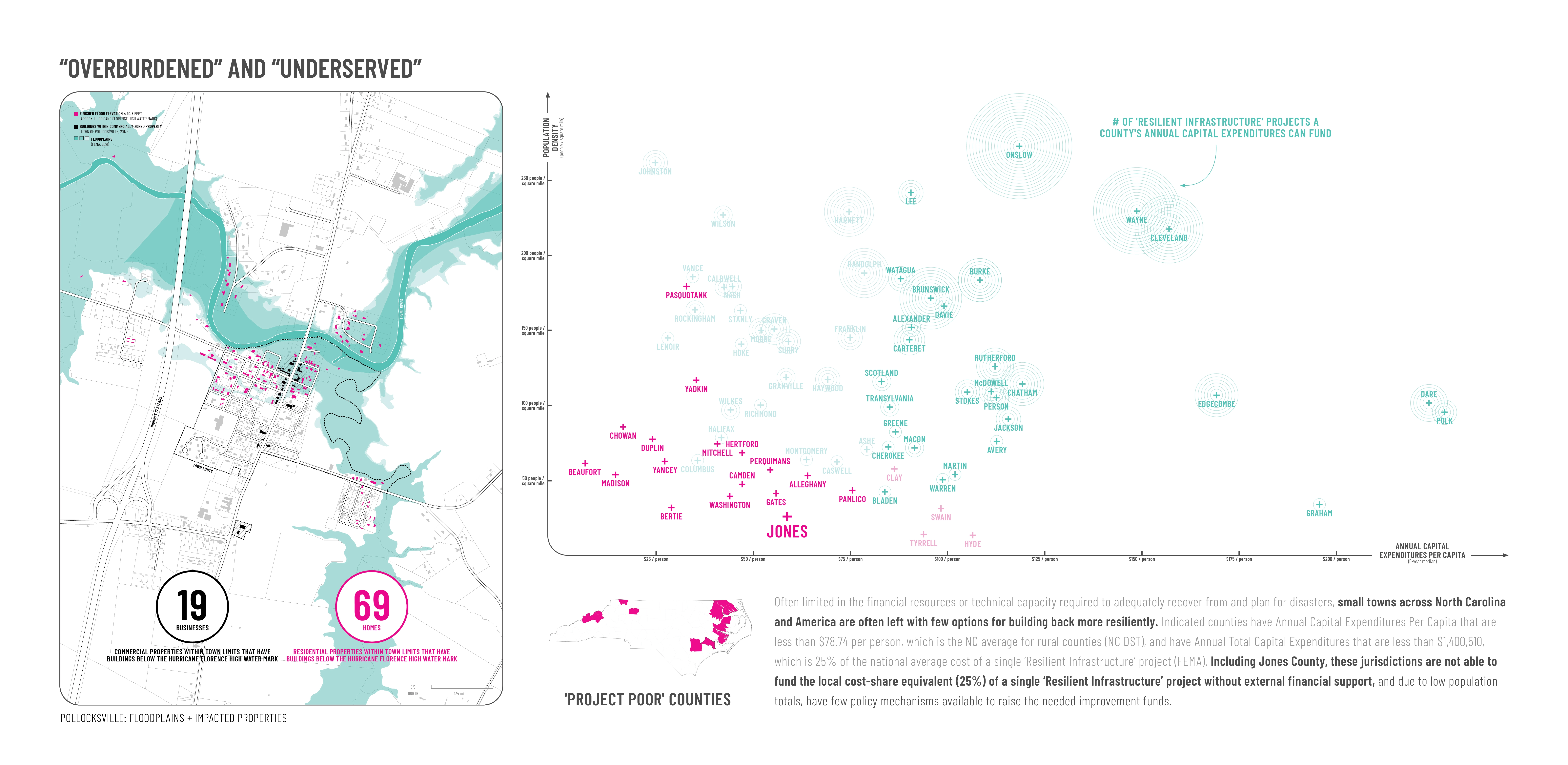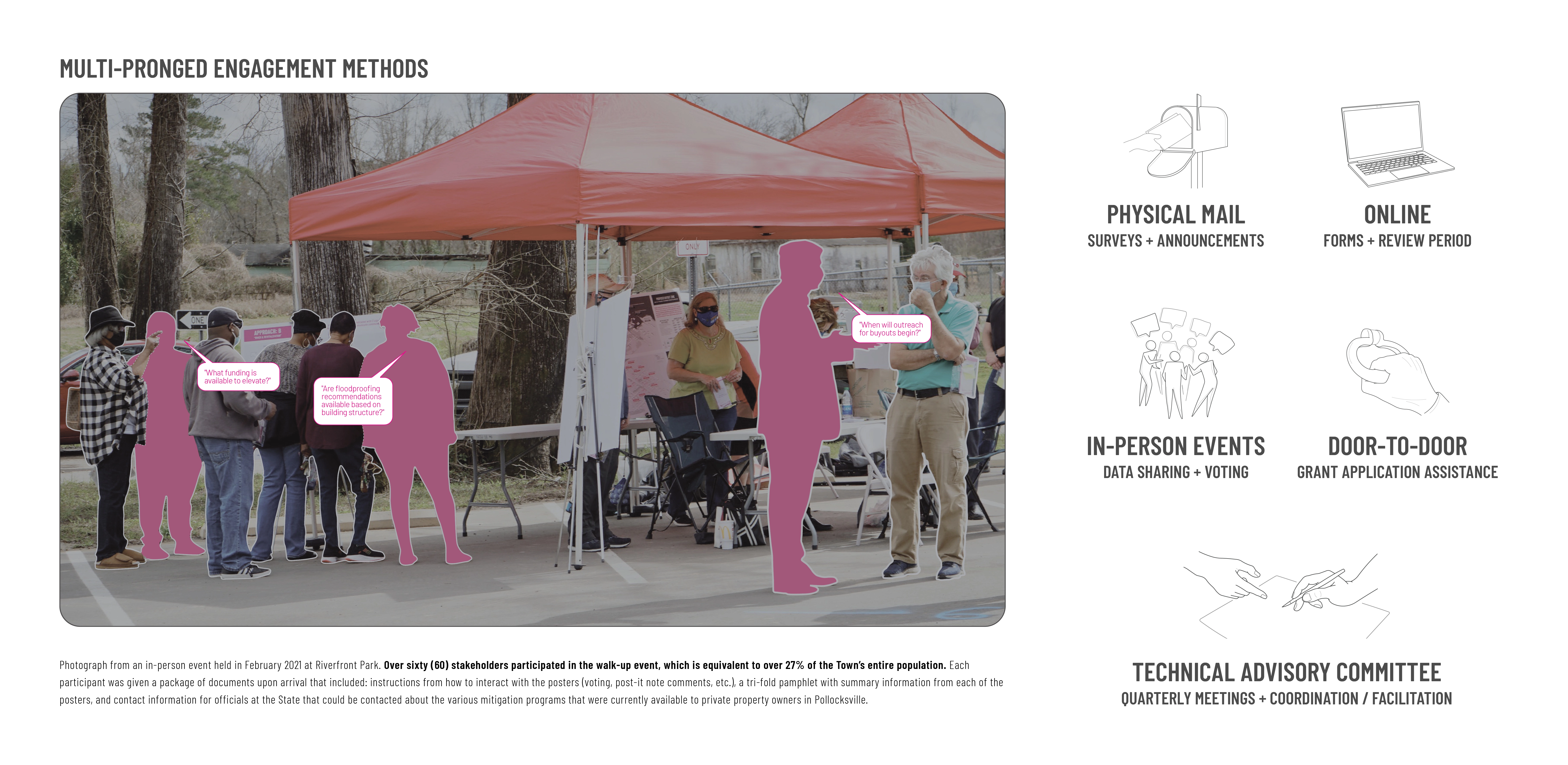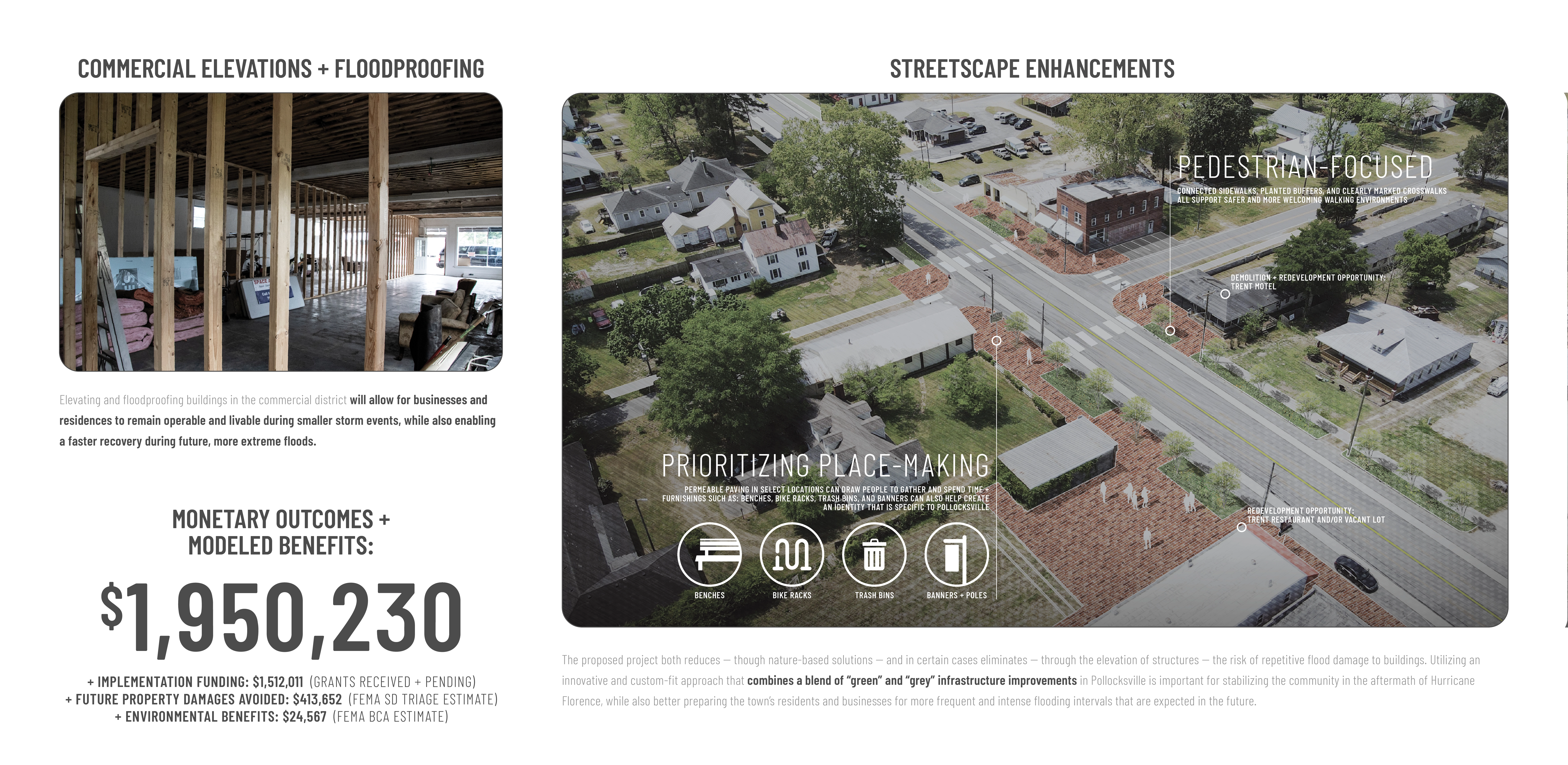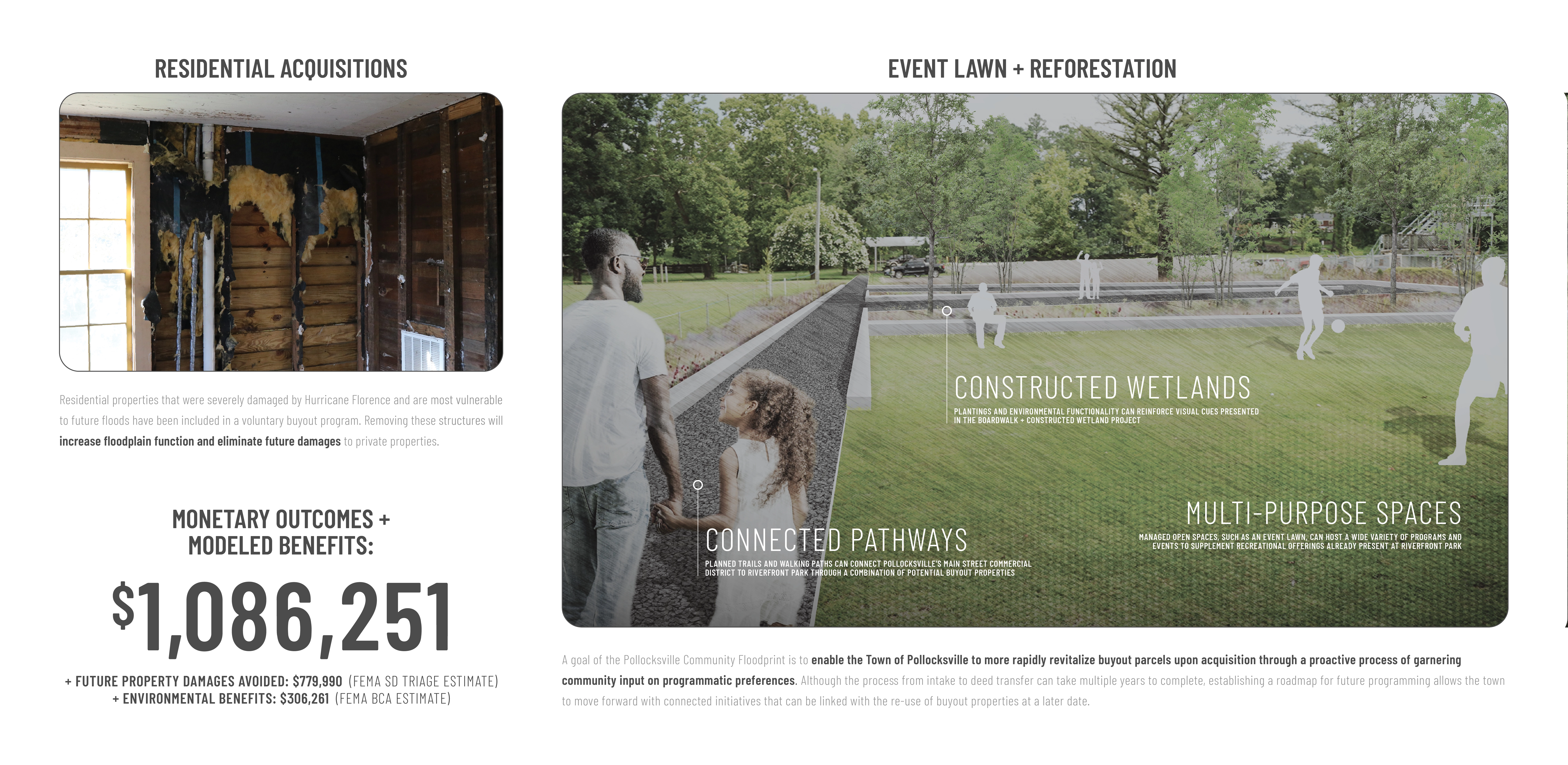 Overview: The Town of Pollocksville, North Carolina (population 216) is in the midst of a multi-year flood recovery process resulting from Hurricane Florence (2018). The rainfall generated by Florence was equivalent to a 1,000-year storm event, causing over $17B in monetary damages in North Carolina. In Pollocksville, the impacts of riverine flooding from the storm far exceeded the 500-year floodplain, inundating dozens of homes and nearly two-thirds of the town’s commercial properties. The Pollocksville Community Floodprint is bolstering community recovery efforts through an integrated portfolio of rebuilding projects. The project team led mixed-method participatory processes to co-produce the plan with the community. The rigorous planning and analysis undertaken by the project team continue to assist local leaders attract the financial resources needed to make Pollocksville a vibrant place to live and work while simultaneously increasing its resilience to future shocks. Context: The Town of Pollocksville is a small, rural community located on the banks of the Trent River in Jones County, North Carolina. Like other places across Eastern North Carolina, Pollocksville is deeply rooted in an agrarian past. The community maintains a direct connection to agricultural commodities including corn, soybean, cotton, and timberlands that adjoin much of the town’s periphery. Pollocksville is increasingly referred to as the “Gateway to Nature” due to its direct access to the Trent River, the Croatan National Forest, and classification as a Bird Sanctuary. In recent years, Pollocksville has leveraged its location through investments in its Riverfront Park, fishing pier, and kayak launch. These amenities, combined with the existing building stock in the Main Street commercial district and newly completed NC Highway 17 exit that accesses the town, afford Pollocksville a unique opportunity to rebuild in a way that increases its overall community resilience – social, economic, and environmental. Rural, Overburdened & Underserved: Often limited in the financial resources or technical capacity required to adequately recover from and plan for disasters, small towns across America are often left with few options for building back more resiliently. Specific to Eastern North Carolina, the long-term planning processes and infrastructure projects required for improved community resilience are seldom accessible. For citizens of Pollocksville, and more generally Jones County, the community faces a combination of demographic and environmental vulnerabilities that meet the U.S. Environmental Protection Agency criteria for both an “overburdened” and an “underserved” community. In the census tract that includes Pollocksville, the average per capita income is $22,183 (NC average: $30,783), the percent of the population age 65+ is 23.5% (NC average: 16.7%), and the percentage of the population who identify as People of Color is 40.5% (NC average: 29.4%). These figures: i) represent income, age, and race characteristics that are representative of a community with elevated social vulnerability risk factors; and ii) contribute to the inability of Pollocksville residents to attain the resources necessary to make the community more resilient to environmental stressors. As witnessed after Hurricane Florence, these vulnerabilities become active threats to life and property during and long after a natural disaster. Pollocksville and Jones County also face significant obstacles to financing the infrastructure projects needed to better prepare for weather extremes. Of the 80 counties classified by the NC Rural Center as having ‘rural’ population densities, 17 of them (including Jones County) share the dual characteristics of having: i) annual, per capita capital expenditure budgets that are less than the average for NC rural counties ($78.74/person/year); and ii) total budgets for annual capital expenditures that are not able to finance the local cost-share requirement (25%) of a single ‘resilient infrastructure’ project based on 2020 national average costs ($1,400,510.00, FEMA). Together, these data points suggest that without external financial support, communities in Jones County are both under-resourced compared to other rural counties in the state and lack the ability to self-fund capital improvement projects that may be necessary for community viability and sustainability. The Pollocksville Community Floodprint responds to these financial and technical challenges by strategically aligning community-identified values for resilience with potential funding sources that are external to local funding streams, and creating support materials that make Pollocksville more competitive to receive the external investments, grants, and resources it needs and deserves. Role of the Landscape Architect: As documented in Pollocksville and other rural communities, the overlap of vulnerable populations and heightened environmental risks imposes barriers to accessing the long-term technical support and financial resources needed to better prepare for future disasters. In response to these shortfalls, the project team – led by landscape architects – secured external grant funding to develop the Pollocksville Community Floodprint at no cost to the community. The project team led a mixed-method community engagement campaign. The project occurred during the height of the pandemic; engagement activities were hosted outside (with masks) and interactive sessions were designed to promote social distancing. Even with these challenges, the attendance for in-person activities included 30% of the town’s population. These efforts were further bolstered by mailed (included with monthly water bills) and online surveys. The project team also worked with town officials to assemble a Technical Advisory Committee that included representatives from state mitigation and emergency management agencies, local non-profits, and county fl