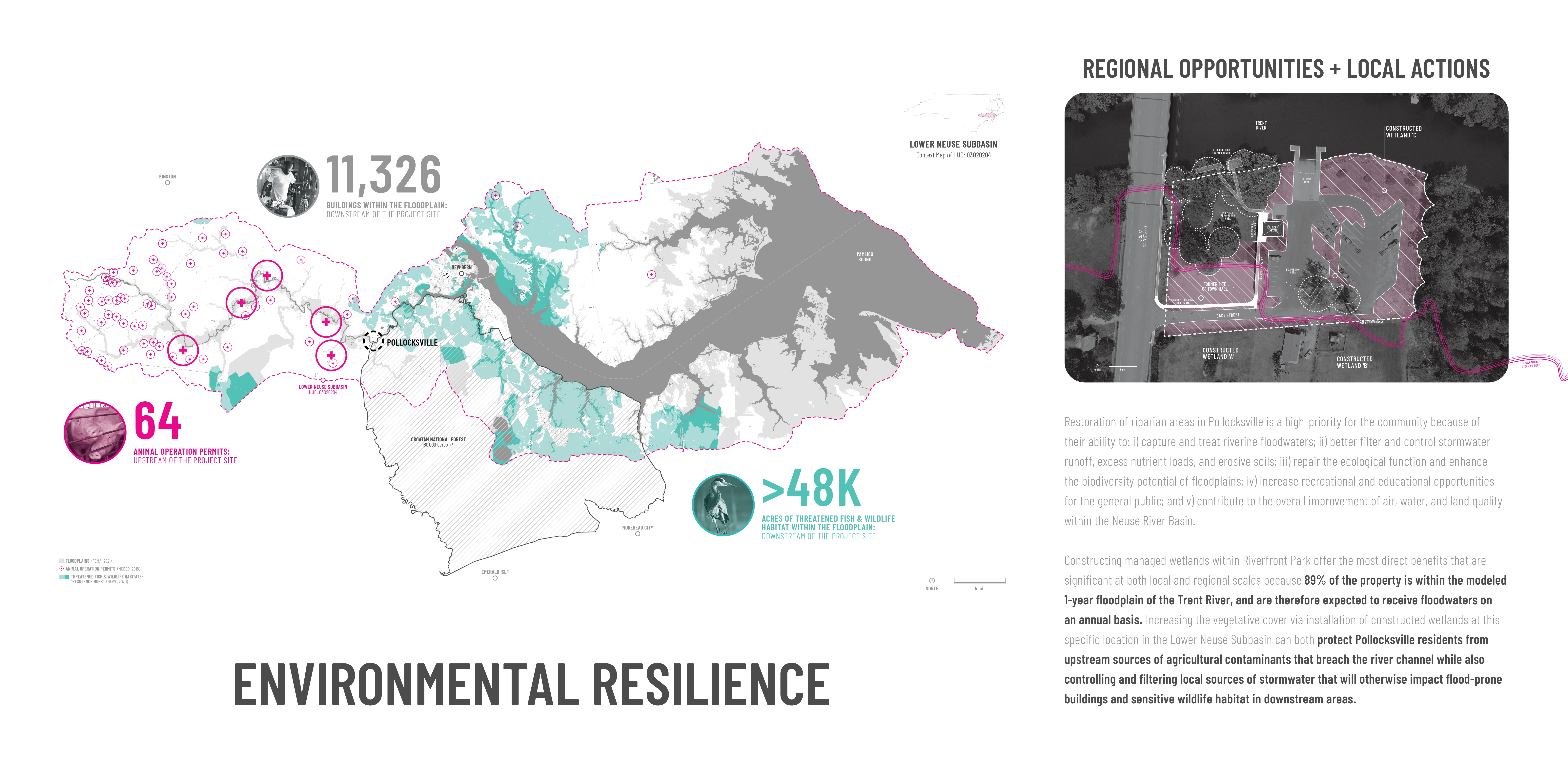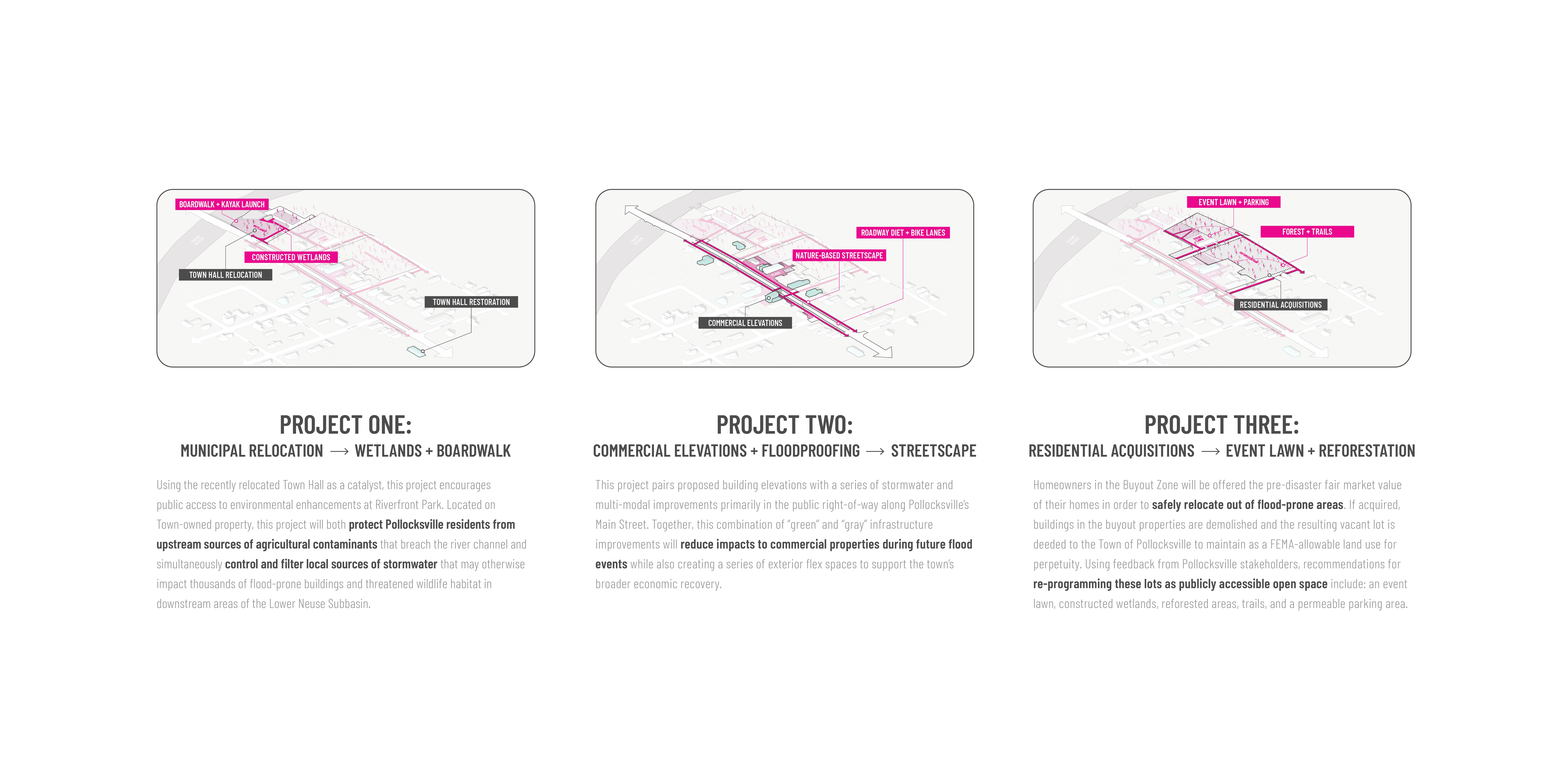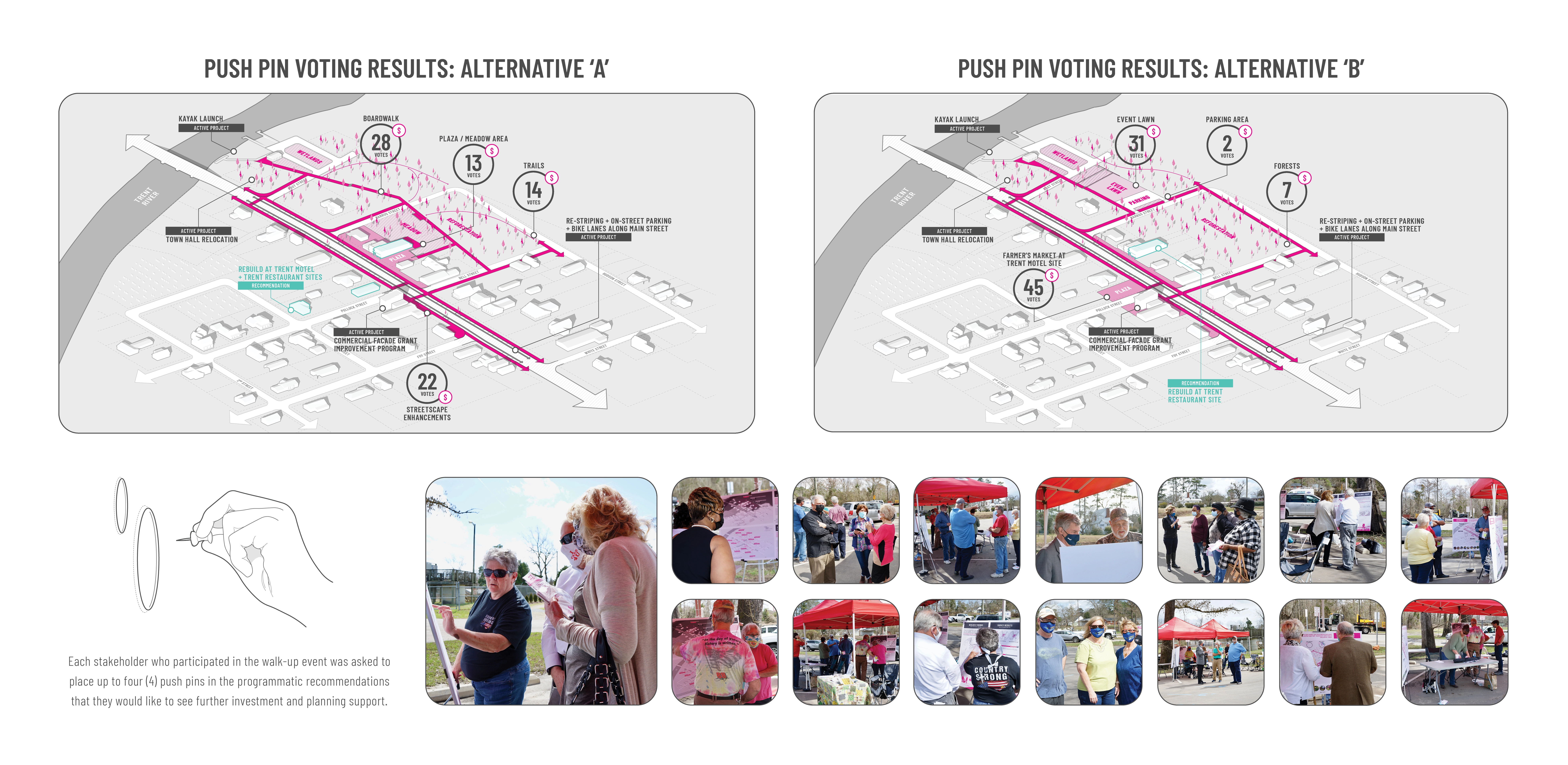 Overview: The Town of Pollocksville, North Carolina (population 216) is in the midst of a multi-year flood recovery process resulting from Hurricane Florence (2018). The rainfall generated by Florence was equivalent to a 1,000-year storm event, causing over $17B in monetary damages in North Carolina. In Pollocksville, the impacts of riverine flooding from the storm far exceeded the 500-year floodplain, inundating dozens of homes and nearly two-thirds of the town’s commercial properties. The Pollocksville Community Floodprint is bolstering community recovery efforts through an integrated portfolio of rebuilding projects. The project team led mixed-method participatory processes to co-produce the plan with the community. The rigorous planning and analysis undertaken by the project team continue to assist local leaders attract the financial resources needed to make Pollocksville a vibrant place to live and work while simultaneously increasing its resilience to future shocks. Context: The Town of Pollocksville is a small, rural community located on the banks of the Trent River in Jones County, North Carolina. Like other places across Eastern North Carolina, Pollocksville is deeply rooted in an agrarian past. The community maintains a direct connection to agricultural commodities including corn, soybean, cotton, and timberlands that adjoin much of the town’s periphery. Pollocksville is increasingly referred to as the “Gateway to Nature” due to its direct access to the Trent River, the Croatan National Forest, and classification as a Bird Sanctuary. In recent years, Pollocksville has leveraged its location through investments in its Riverfront Park, fishing pier, and kayak launch. These amenities, combined with the existing building stock in the Main Street commercial district and newly completed NC Highway 17 exit that accesses the town, afford Pollocksville a unique opportunity to rebuild in a way that increases its overall community resilience – social, economic, and environmental. Rural, Overburdened & Underserved: Often limited in the financial resources or technical capacity required to adequately recover from and plan for disasters, small towns across America are often left with few options for building back more resiliently. Specific to Eastern North Carolina, the long-term planning processes and infrastructure projects required for improved community resilience are seldom accessible. For citizens of Pollocksville, and more generally Jones County, the community faces a combination of demographic and environmental vulnerabilities that meet the U.S. Environmental Protection Agency criteria for both an “overburdened” and an “underserved” community. In the census tract that includes Pollocksville, the average per capita income is $22,183 (NC average: $30,783), the percent of the population age 65+ is 23.5% (NC average: 16.7%), and the percentage of the population who identify as People of Color is 40.5% (NC average: 29.4%). These figures: i) represent income, age, and race characteristics that are representative of a community with elevated social vulnerability risk factors; and ii) contribute to the inability of Pollocksville residents to attain the resources necessary to make the community more resilient to environmental stressors. As witnessed after Hurricane Florence, these vulnerabilities become active threats to life and property during and long after a natural disaster. Pollocksville and Jones County also face significant obstacles to financing the infrastructure projects needed to better prepare for weather extremes. Of the 80 counties classified by the NC Rural Center as having ‘rural’ population densities, 17 of them (including Jones County) share the dual characteristics of having: i) annual, per capita capital expenditure budgets that are less than the average for NC rural counties ($78.74/person/year); and ii) total budgets for annual capital expenditures that are not able to finance the local cost-share requirement (25%) of a single ‘resilient infrastructure’ project based on 2020 national average costs ($1,400,510.00, FEMA). Together, these data points suggest that without external financial support, communities in Jones County are both under-resourced compared to other rural counties in the state and lack the ability to self-fund capital improvement projects that may be necessary for community viability and sustainability. The Pollocksville Community Floodprint responds to these financial and technical challenges by strategically aligning community-identified values for resilience with potential funding sources that are external to local funding streams, and creating support materials that make Pollocksville more competitive to receive the external investments, grants, and resources it needs and deserves. Role of the Landscape Architect: As documented in Pollocksville and other rural communities, the overlap of vulnerable populations and heightened environmental risks imposes barriers to accessing the long-term technical support and financial resources needed to better prepare for future disasters. In response to these shortfalls, the project team – led by landscape architects – secured external grant funding to develop the Pollocksville Community Floodprint at no cost to the community. The project team led a mixed-method community engagement campaign. The project occurred during the height of the pandemic; engagement activities were hosted outside (with masks) and interactive sessions were designed to promote social distancing. Even with these challenges, the attendance for in-person activities included 30% of the town’s population. These efforts were further bolstered by mailed (included with monthly water bills) and online surveys. The project team also worked with town officials to assemble a Technical Advisory Committee that included representatives from state mitigation and emergency management agencies, local non-profits, and county fl