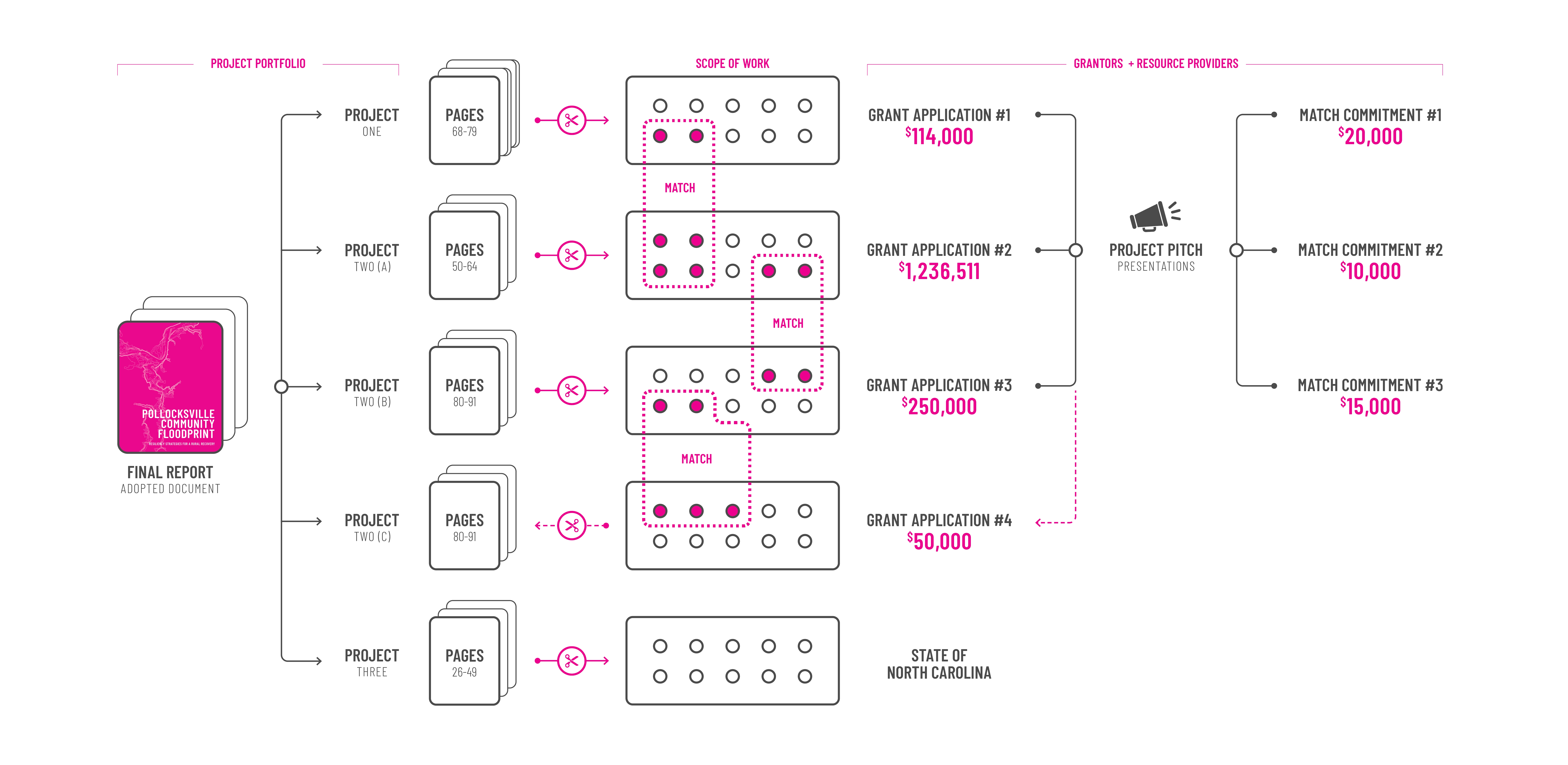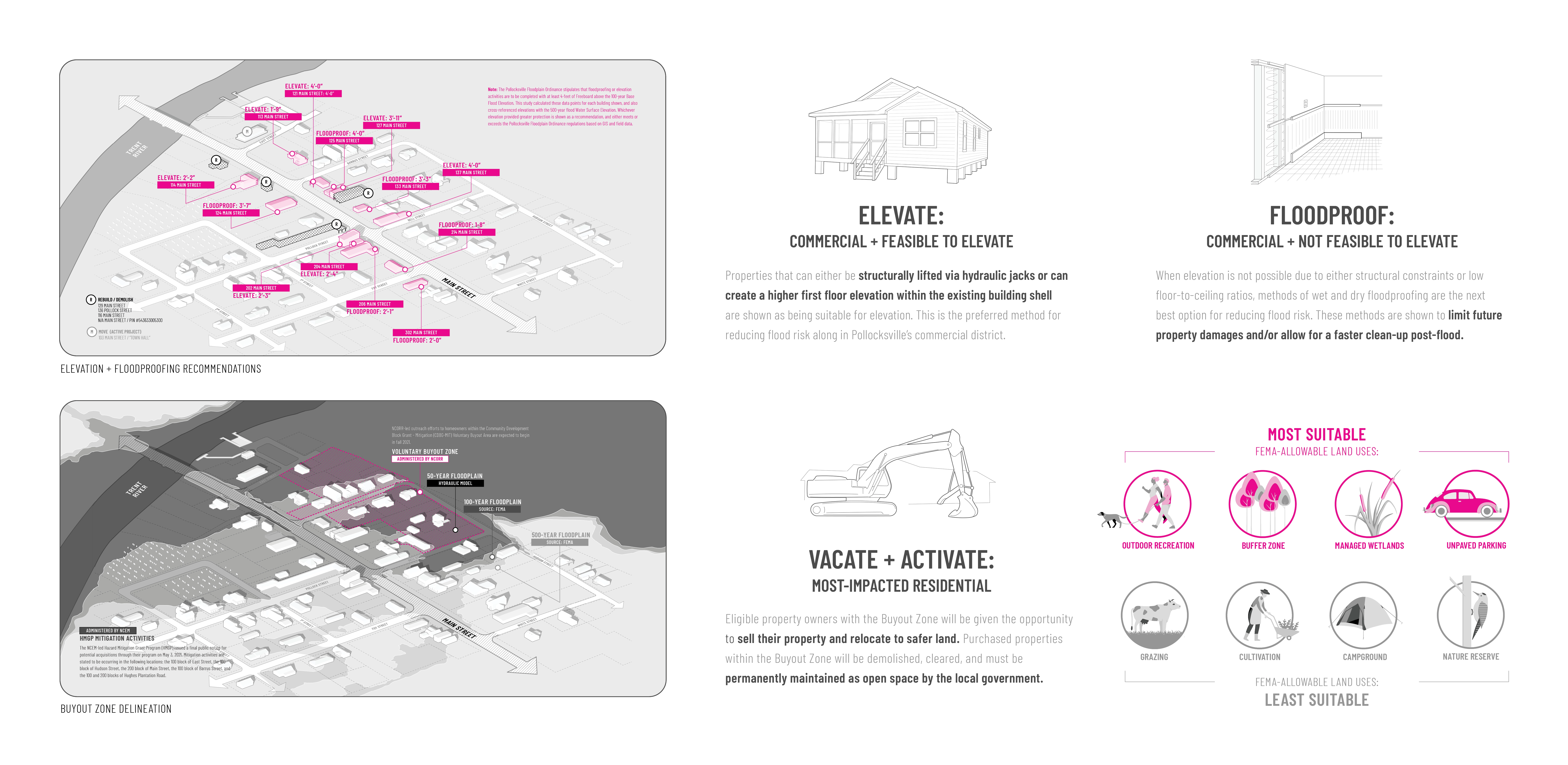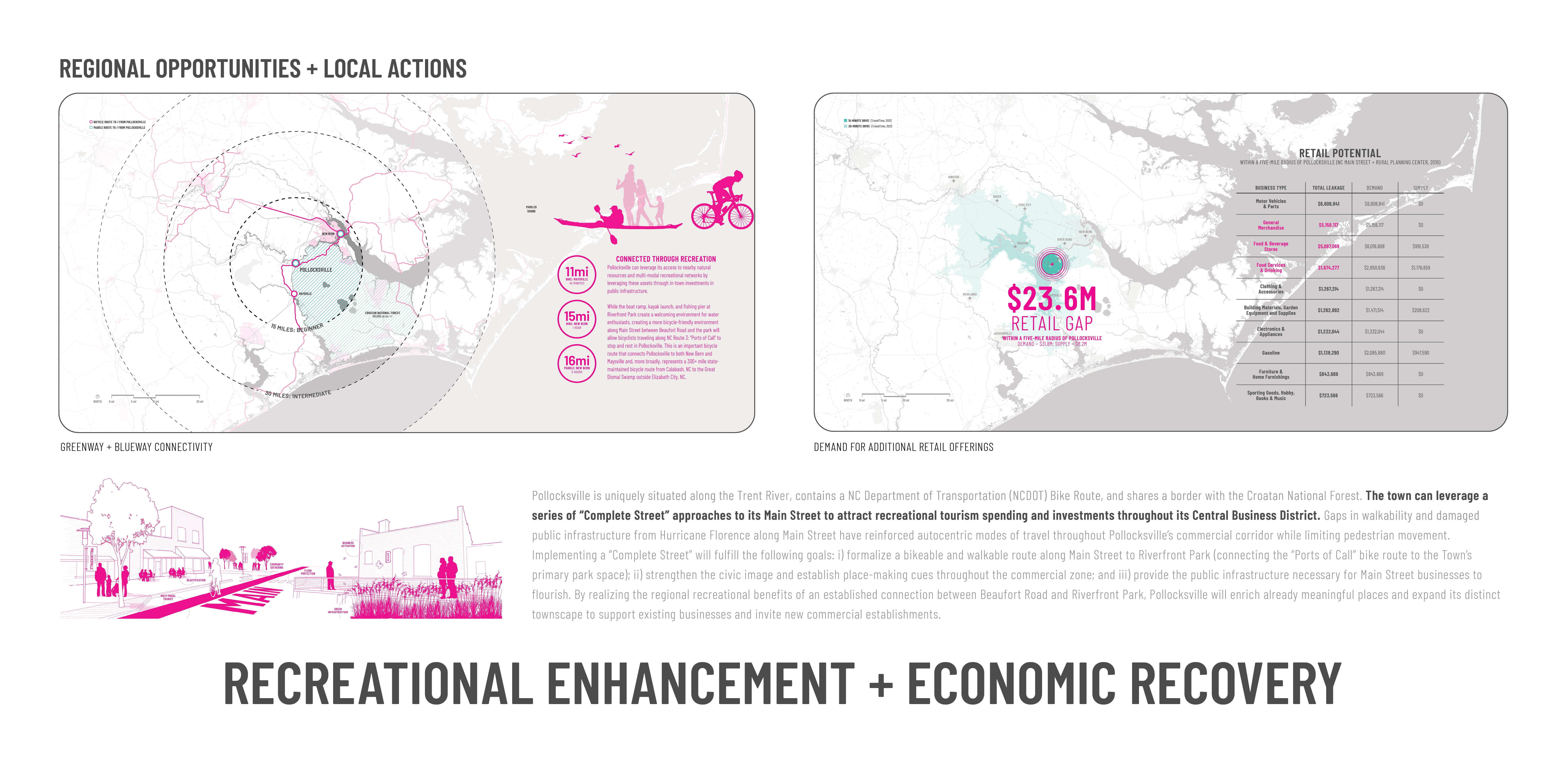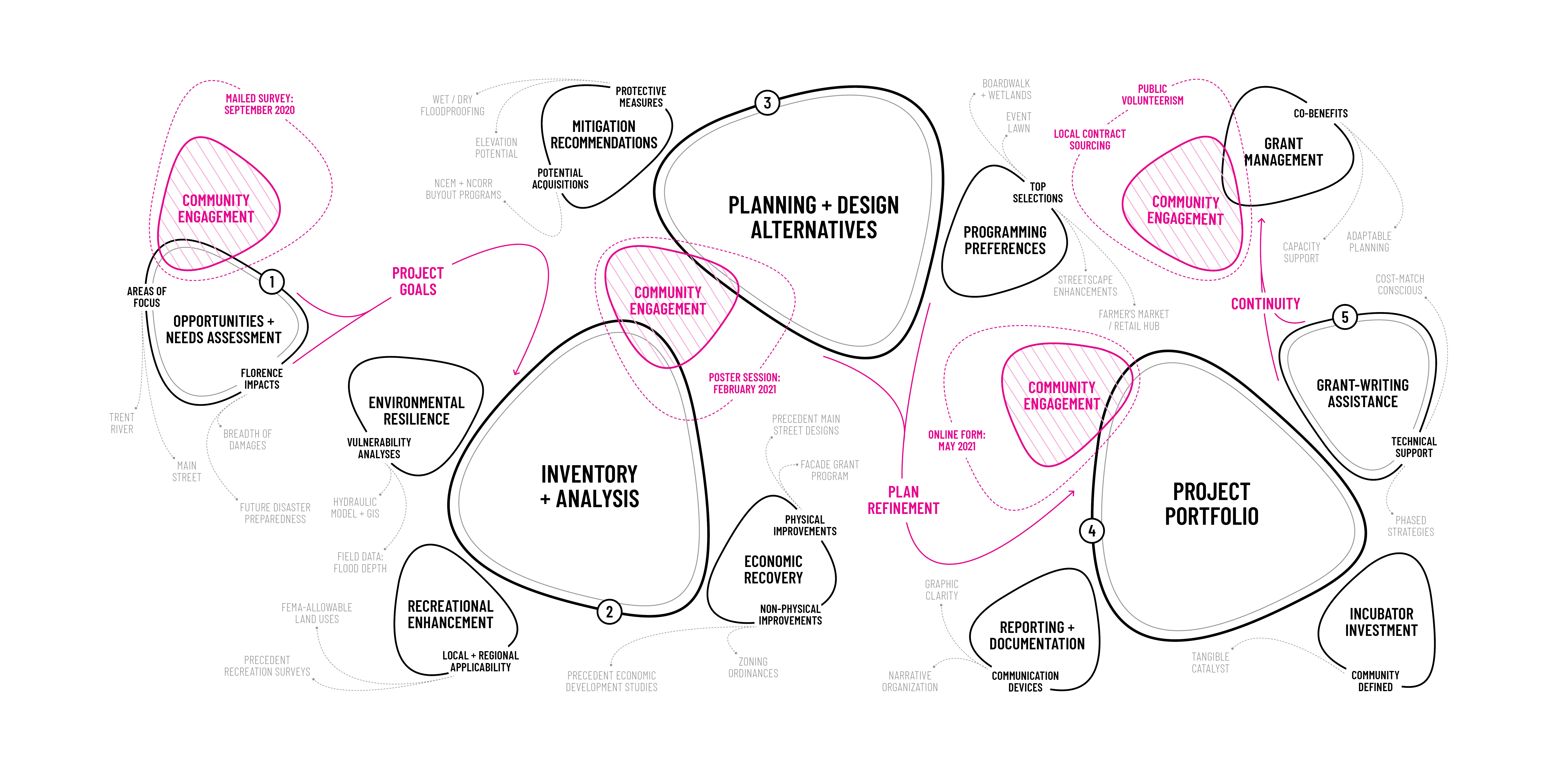 Overview: The Town of Pollocksville, North Carolina (population 216) is in the midst of a multi-year flood recovery process resulting from Hurricane Florence (2018). The rainfall generated by Florence was equivalent to a 1,000-year storm event, causing over $17B in monetary damages in North Carolina. In Pollocksville, the impacts of riverine flooding from the storm far exceeded the 500-year floodplain, inundating dozens of homes and nearly two-thirds of the town’s commercial properties. The Pollocksville Community Floodprint is bolstering community recovery efforts through an integrated portfolio of rebuilding projects. The project team led mixed-method participatory processes to co-produce the plan with the community. The rigorous planning and analysis undertaken by the project team continue to assist local leaders attract the financial resources needed to make Pollocksville a vibrant place to live and work while simultaneously increasing its resilience to future shocks. Context: The Town of Pollocksville is a small, rural community located on the banks of the Trent River in Jones County, North Carolina. Like other places across Eastern North Carolina, Pollocksville is deeply rooted in an agrarian past. The community maintains a direct connection to agricultural commodities including corn, soybean, cotton, and timberlands that adjoin much of the town’s periphery. Pollocksville is increasingly referred to as the “Gateway to Nature” due to its direct access to the Trent River, the Croatan National Forest, and classification as a Bird Sanctuary. In recent years, Pollocksville has leveraged its location through investments in its Riverfront Park, fishing pier, and kayak launch. These amenities, combined with the existing building stock in the Main Street commercial district and newly completed NC Highway 17 exit that accesses the town, afford Pollocksville a unique opportunity to rebuild in a way that increases its overall community resilience – social, economic, and environmental. Rural, Overburdened & Underserved: Often limited in the financial resources or technical capacity required to adequately recover from and plan for disasters, small towns across America are often left with few options for building back more resiliently. Specific to Eastern North Carolina, the long-term planning processes and infrastructure projects required for improved community resilience are seldom accessible. For citizens of Pollocksville, and more generally Jones County, the community faces a combination of demographic and environmental vulnerabilities that meet the U.S. Environmental Protection Agency criteria for both an “overburdened” and an “underserved” community. In the census tract that includes Pollocksville, the average per capita income is $22,183 (NC average: $30,783), the percent of the population age 65+ is 23.5% (NC average: 16.7%), and the percentage of the population who identify as People of Color is 40.5% (NC average: 29.4%). These figures: i) represent income, age, and race characteristics that are representative of a community with elevated social vulnerability risk factors; and ii) contribute to the inability of Pollocksville residents to attain the resources necessary to make the community more resilient to environmental stressors. As witnessed after Hurricane Florence, these vulnerabilities become active threats to life and property during and long after a natural disaster. Pollocksville and Jones County also face significant obstacles to financing the infrastructure projects needed to better prepare for weather extremes. Of the 80 counties classified by the NC Rural Center as having ‘rural’ population densities, 17 of them (including Jones County) share the dual characteristics of having: i) annual, per capita capital expenditure budgets that are less than the average for NC rural counties ($78.74/person/year); and ii) total budgets for annual capital expenditures that are not able to finance the local cost-share requirement (25%) of a single ‘resilient infrastructure’ project based on 2020 national average costs ($1,400,510.00, FEMA). Together, these data points suggest that without external financial support, communities in Jones County are both under-resourced compared to other rural counties in the state and lack the ability to self-fund capital improvement projects that may be necessary for community viability and sustainability. The Pollocksville Community Floodprint responds to these financial and technical challenges by strategically aligning community-identified values for resilience with potential funding sources that are external to local funding streams, and creating support materials that make Pollocksville more competitive to receive the external investments, grants, and resources it needs and deserves. Role of the Landscape Architect: As documented in Pollocksville and other rural communities, the overlap of vulnerable populations and heightened environmental risks imposes barriers to accessing the long-term technical support and financial resources needed to better prepare for future disasters. In response to these shortfalls, the project team – led by landscape architects – secured external grant funding to develop the Pollocksville Community Floodprint at no cost to the community. The project team led a mixed-method community engagement campaign. The project occurred during the height of the pandemic; engagement activities were hosted outside (with masks) and interactive sessions were designed to promote social distancing. Even with these challenges, the attendance for in-person activities included 30% of the town’s population. These efforts were further bolstered by mailed (included with monthly water bills) and online surveys. The project team also worked with town officials to assemble a Technical Advisory Committee that included representatives from state mitigation and emergency management agencies, local non-profits, and county fl