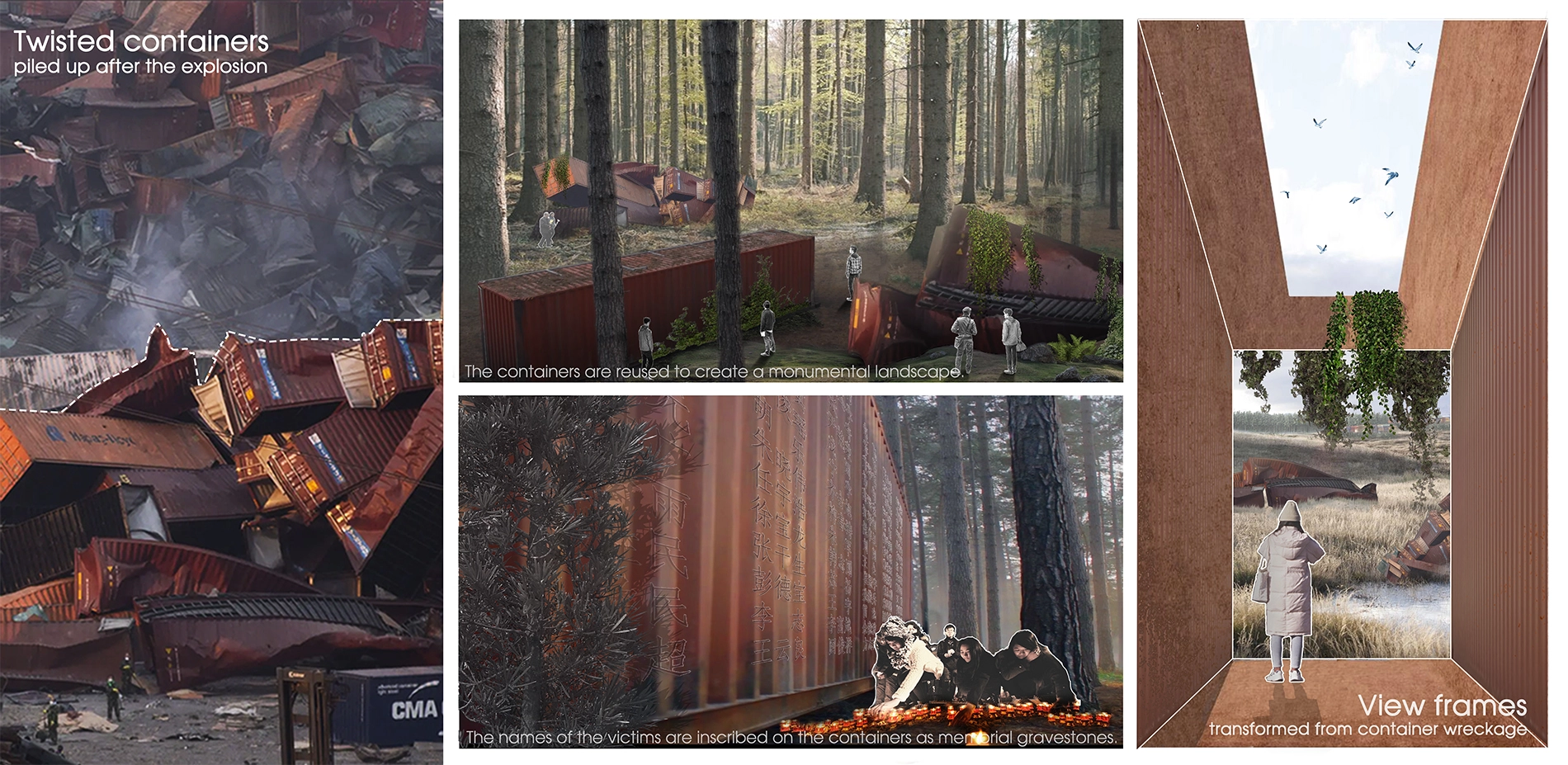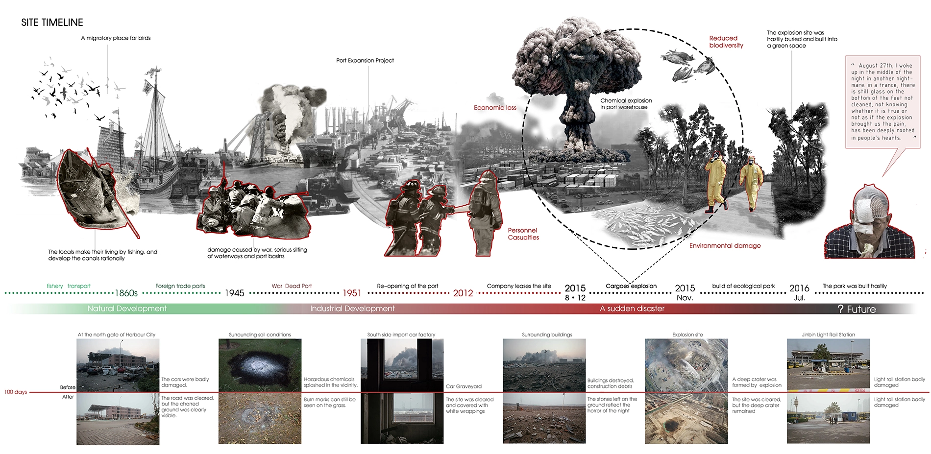 The port of Tianjin, once the fifth largest port in the world, carried a huge volume of trade traffic. In 2015, a sudden explosion of hazardous chemicals in a warehouse shattered all prosperity. A large amount of brownfield soil from the explosion site needed to be contaminated. The loss of chemical components in the environment caused varying degrees of contamination and caused intense unease among the surrounding population. The hard-hit Tianjin citizens and firefighters desperately longed for a place to soothe their inner grief.