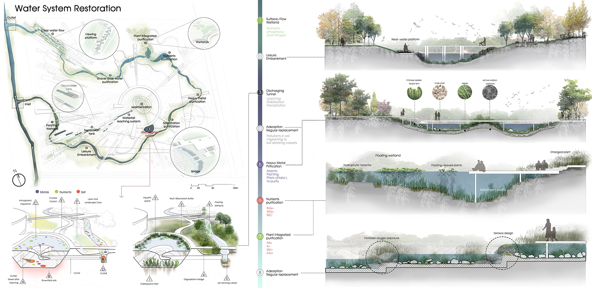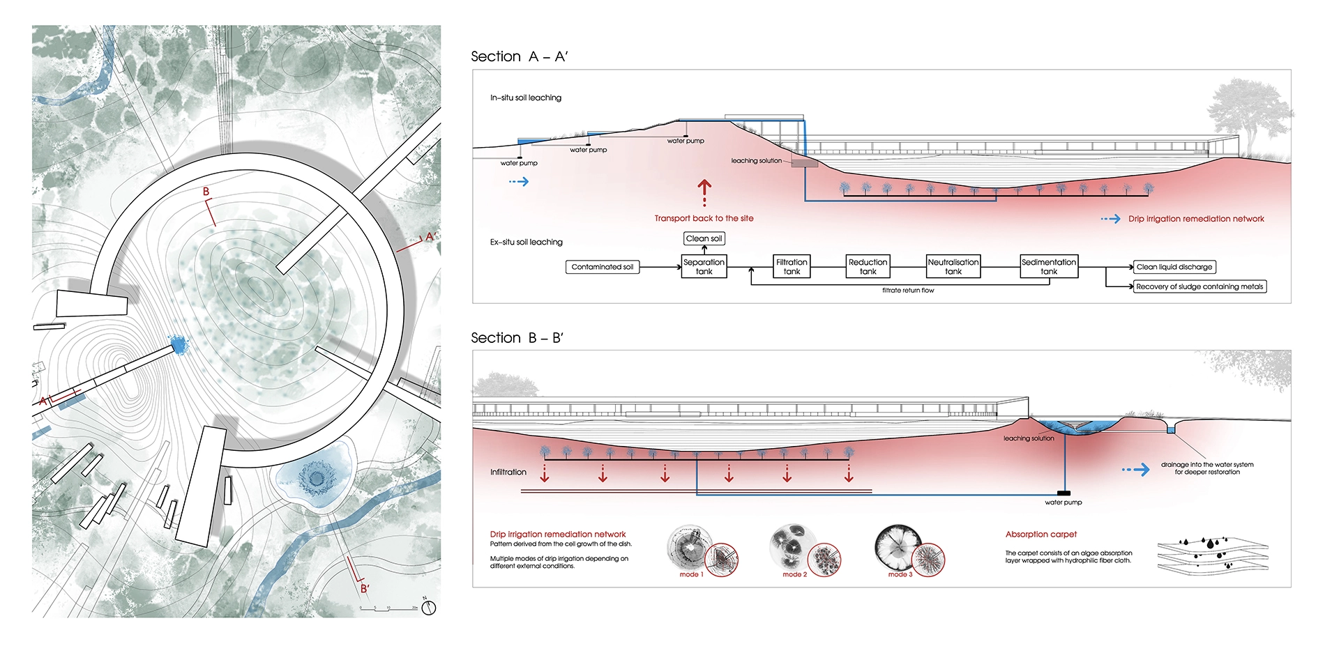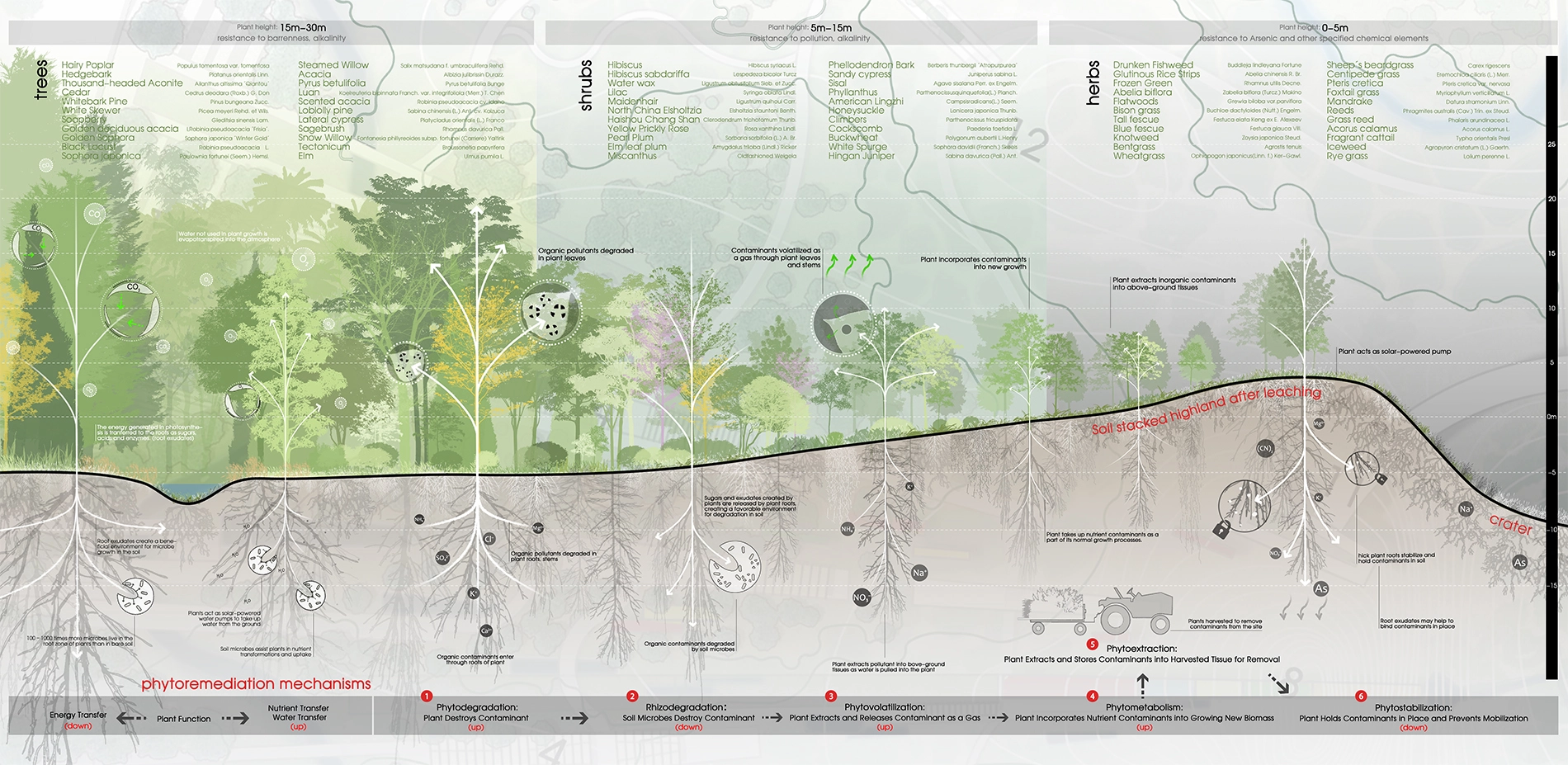 Combined with the settlement of pollution over the years and the year-by-year improvement of the bioremediation effect of the site, the planning and development of the site in the next 5, 20 and 50 years and the restoration process are envisioned to move towards the goal of a sustainable and resilient space. Plants in the form of grouped patches spread and squeeze towards the central blast pit like cell growth, eventually turning the barren soil in the blast pit into an ecological green island. The process of gradual settling and dissipation of pollution is visualized through the growth of plants, vividly demonstrating the ability of bioremediation to repair contaminated soil. Eventually the vibrant green will finally cover the "scars" produced by the explosion, and the power of biology slowly heals it all.
